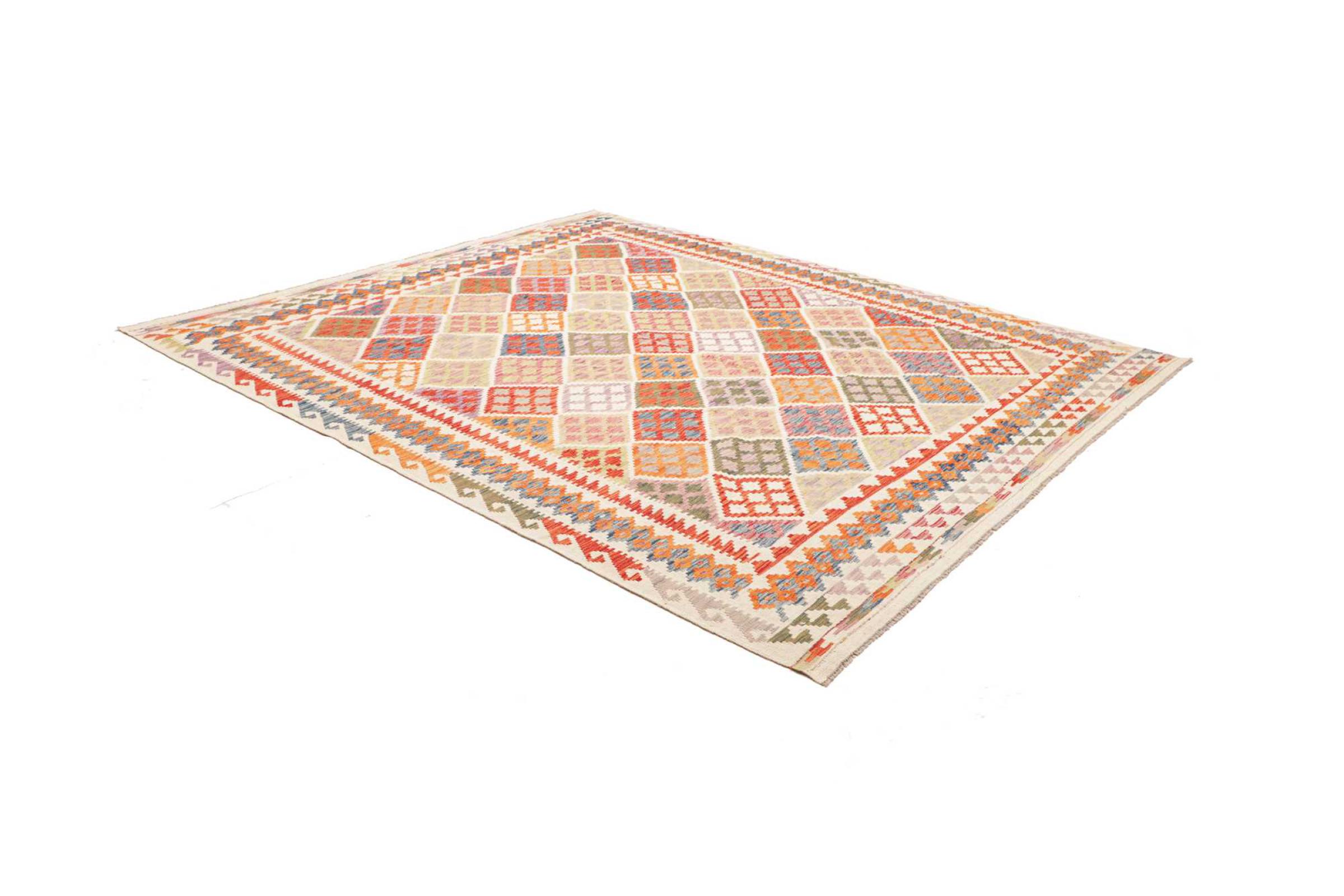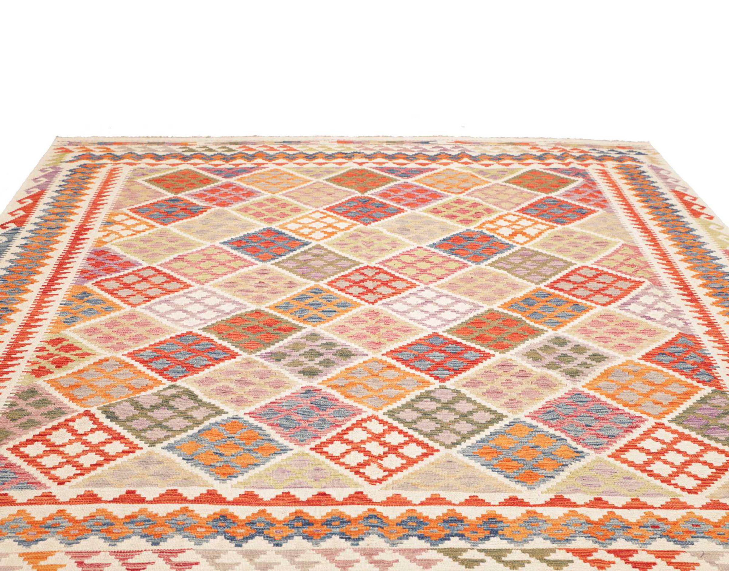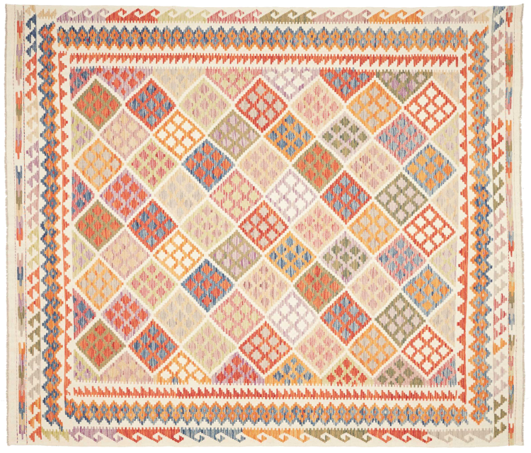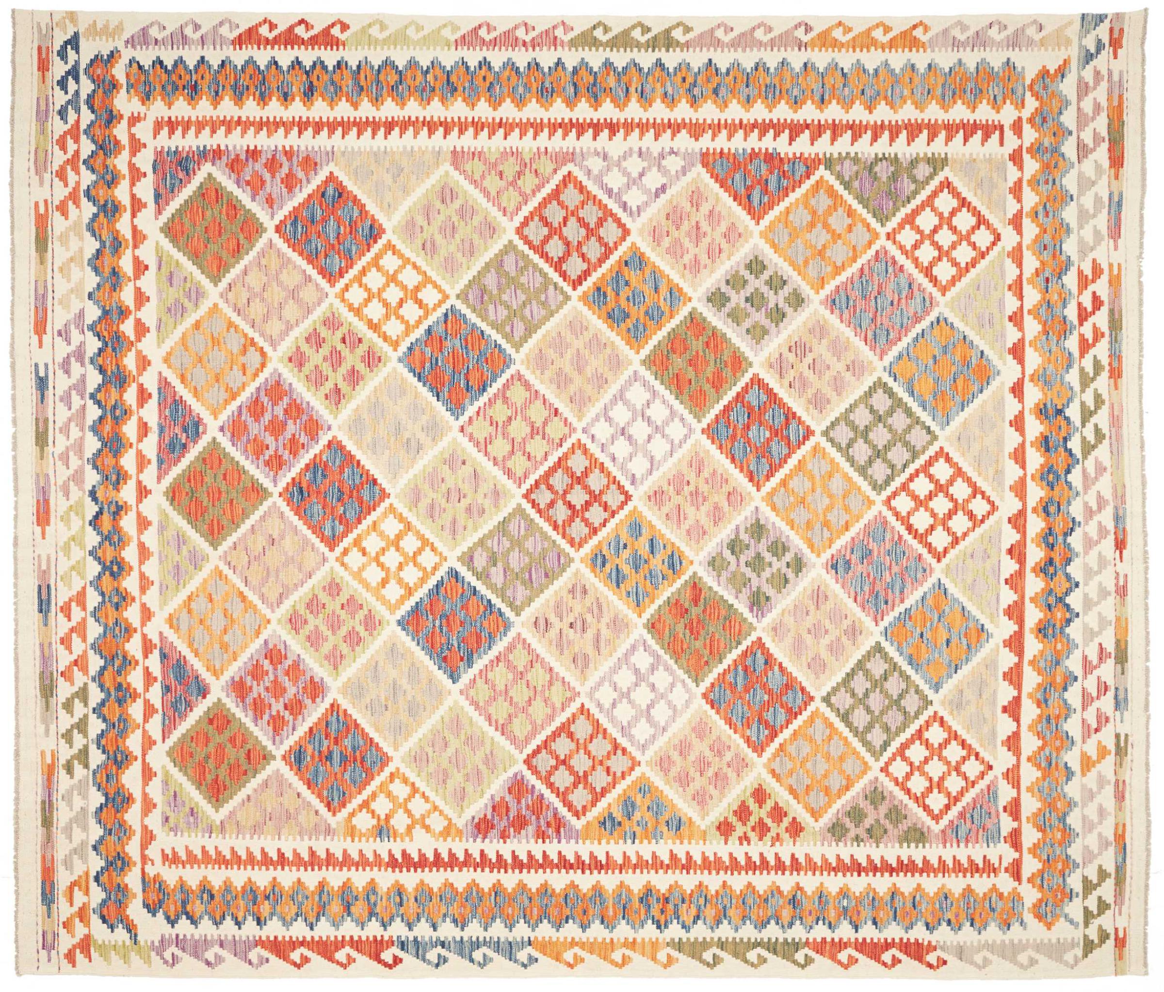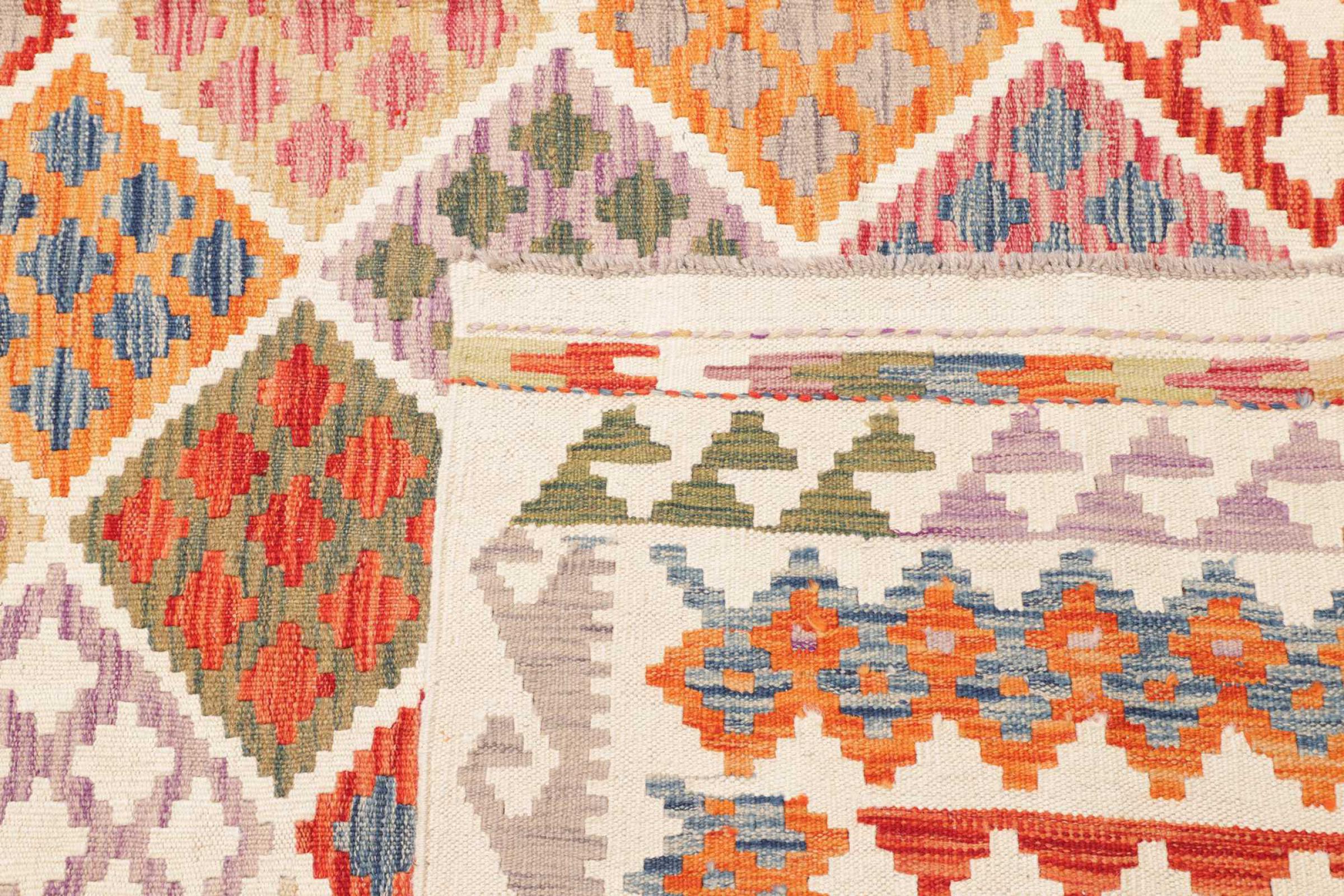 This handwoven Kilim Afghan is a wonderful and unique piece of art. Hard to believe that these modern colours and patterns have already been used centuries ago. This carpet has been woven by hand in old tradition in Afghanistan. It delivers a portion of contemporary history, which you won't find in this specific design a second time. It consists of high-grade natural wool and gives your home a personalised touch.