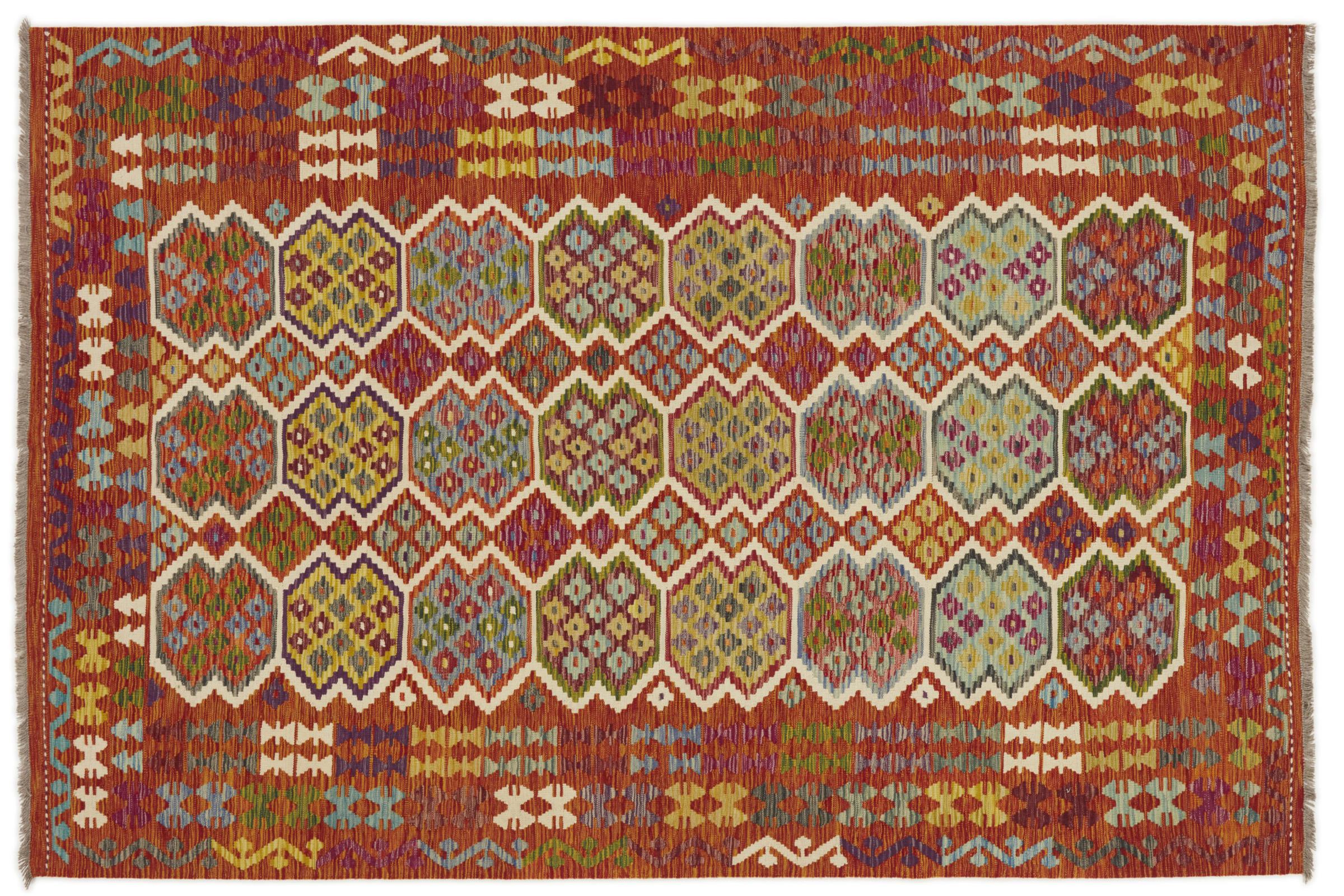 This handwoven Kilim Afghan is a wonderful and unique piece of art. Hard to believe that these modern colours and patterns have already been used centuries ago. This carpet has been woven by hand in old tradition in Afghanistan. It delivers a portion of contemporary history, which you won't find in this specific design a second time. It consists of high-grade natural wool and gives your home a personalised touch.