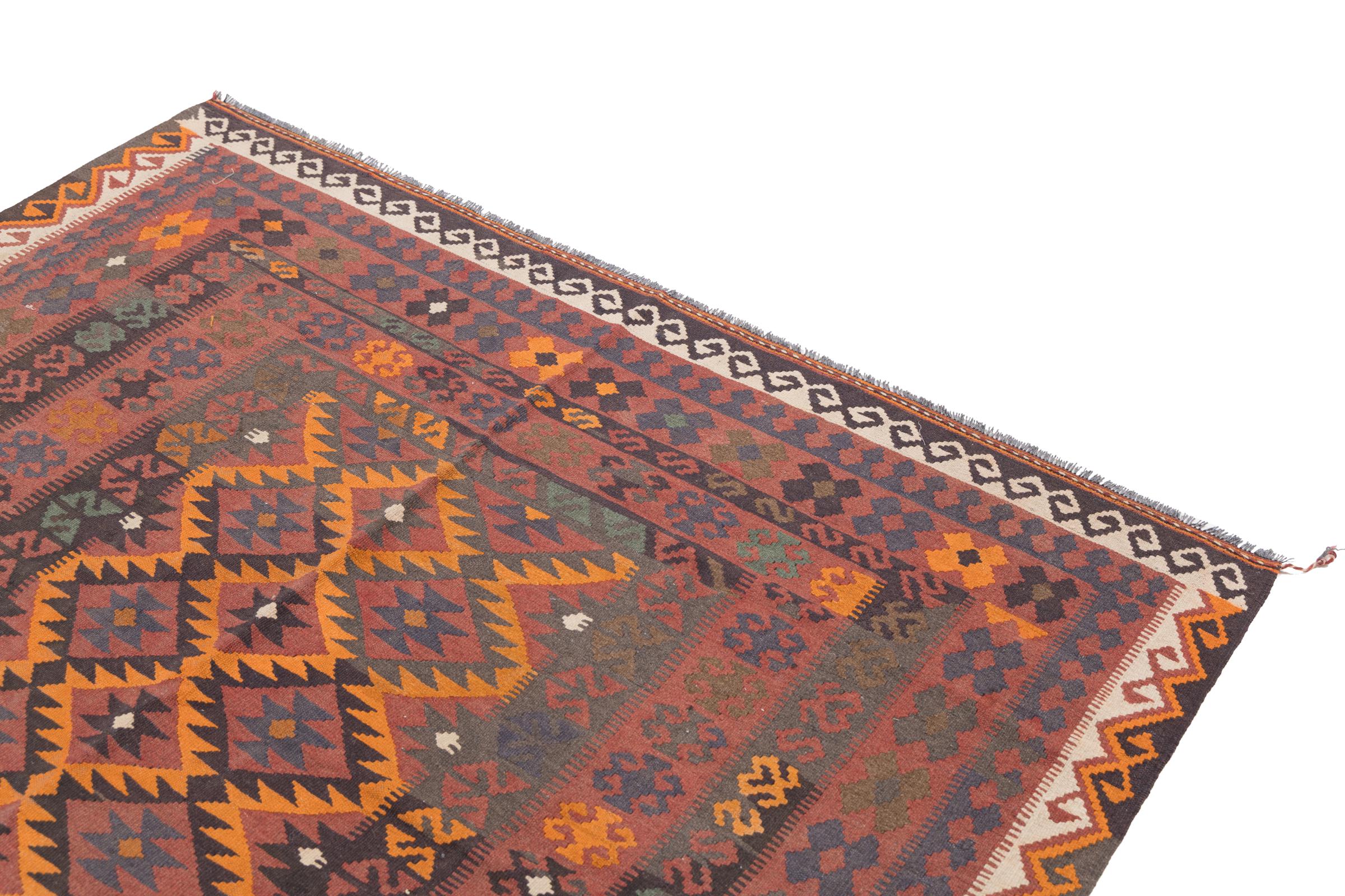 This handwoven Kilim Afghan is a wonderful and unique piece of art. Hard to believe that these modern colours and patterns have already been used centuries ago. This carpet has been woven by hand in old tradition in Afghanistan. It delivers a portion of contemporary history, which you won't find in this specific design a second time. It consists of high-grade natural wool and gives your home a personalised touch.