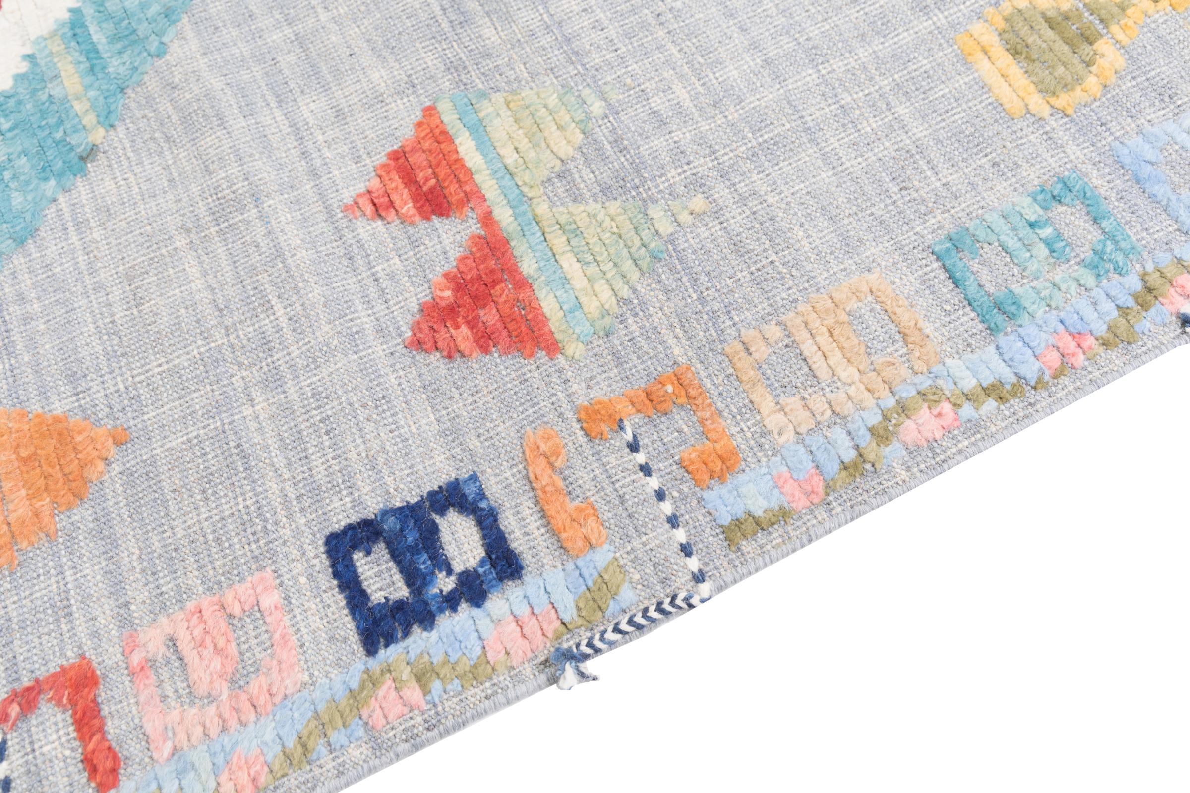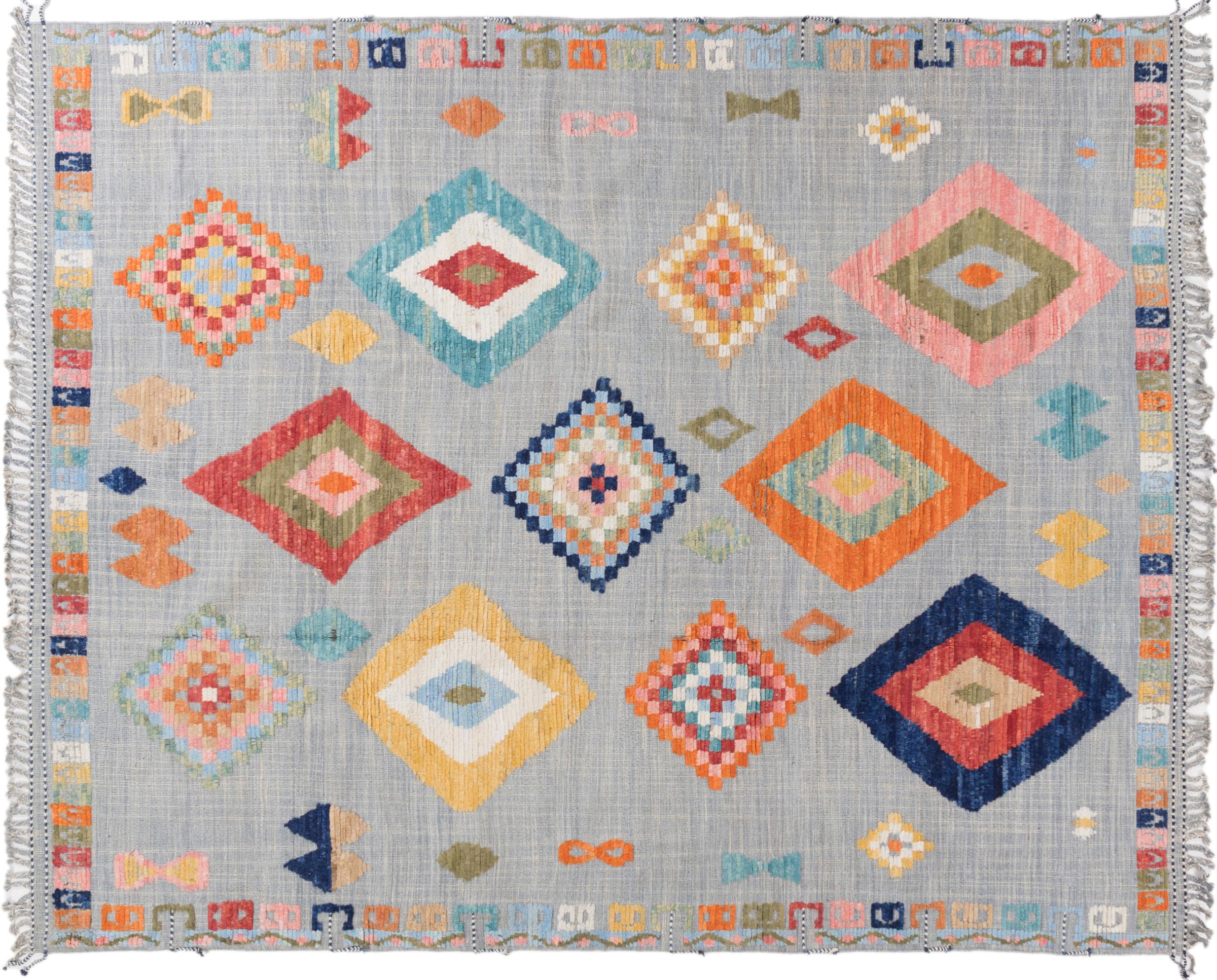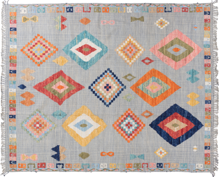 This rug was made as a flat weave by hand on a loom. Flatweave is the term used to describe rugs that have no pile. As the name promises, these rugs are woven and not knotted. This results in a flat rug with a structured surface. Flatweaves are not as soft and usually thinner than knotted rugs. At the same time they are much less complex to manufacture and can usually be laid out from both sides (front and back). Their patterns are usually geometric, which is determined by the fabric.