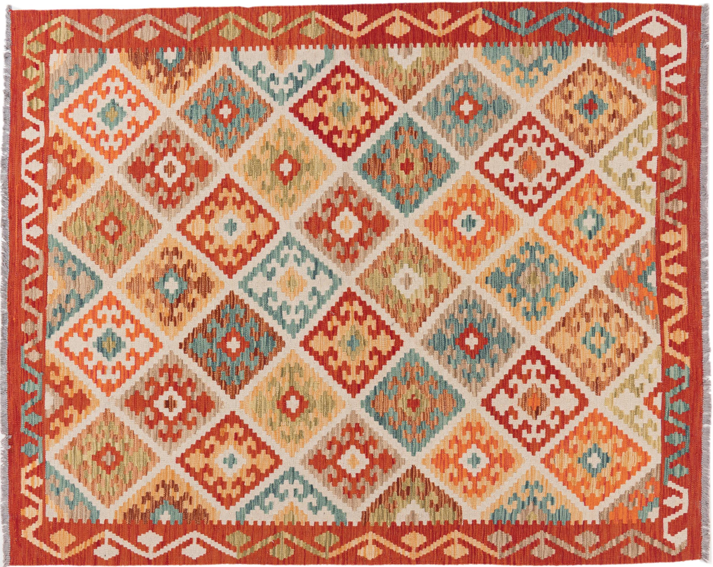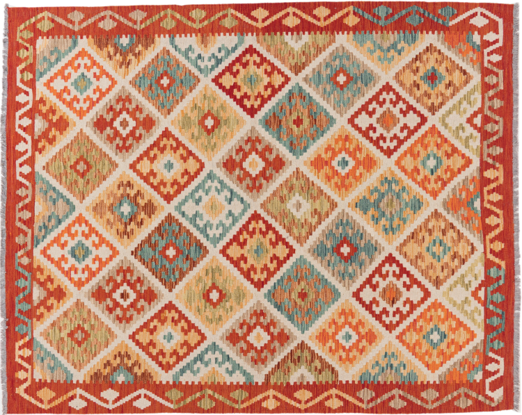 Carpet ID: 2946160050356 Size: 190x155 cm Thickness: ap. 3 mm Manufacturing: Woven by hand Pile: Handspun wool Warp: Sheep wool Origin: Afghanistan Age: New Weight: ap. 4 kg Also know as Kilim, Qilim, Chilim, Afgan, Afghán In stock: Unique - Only 1 in stock