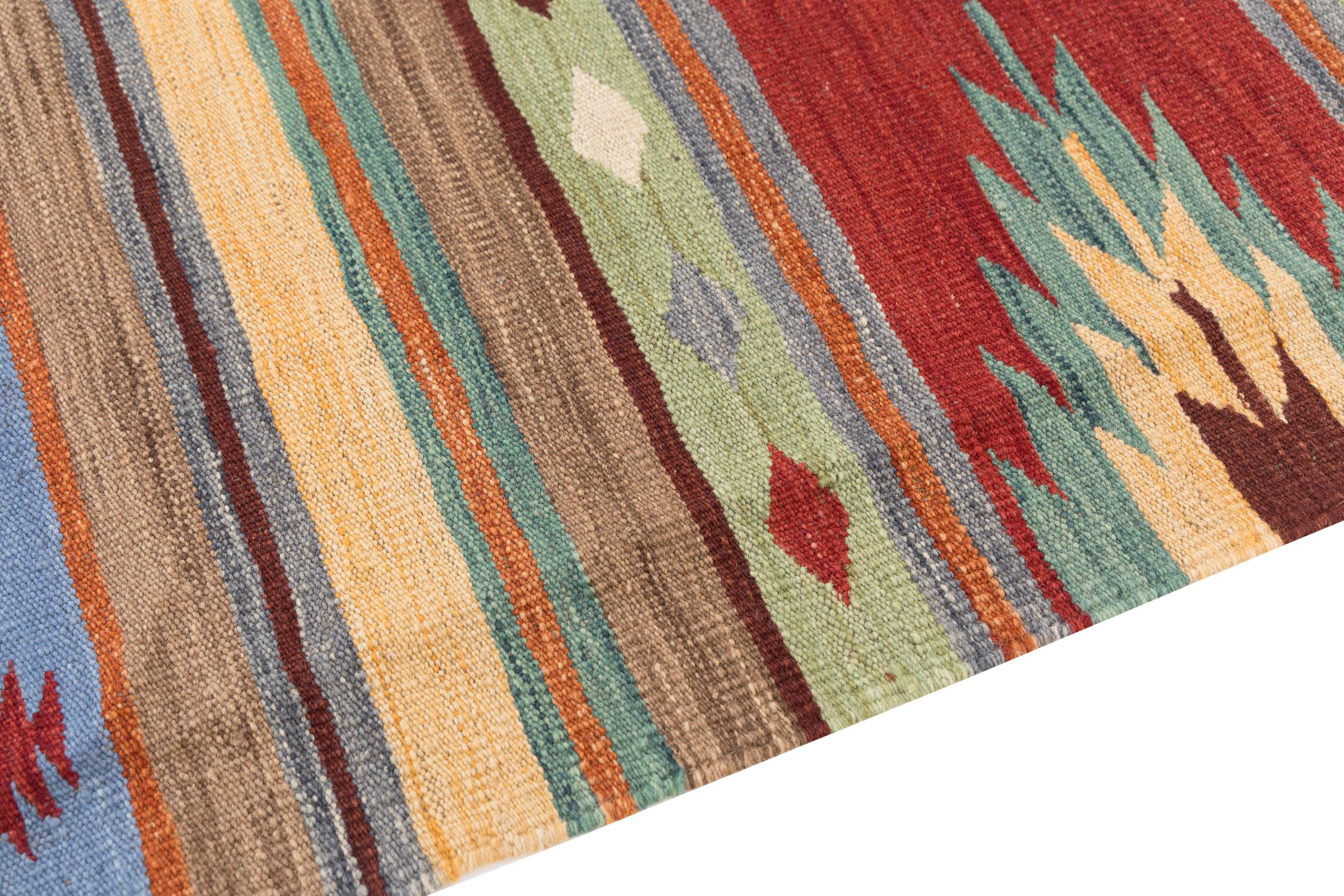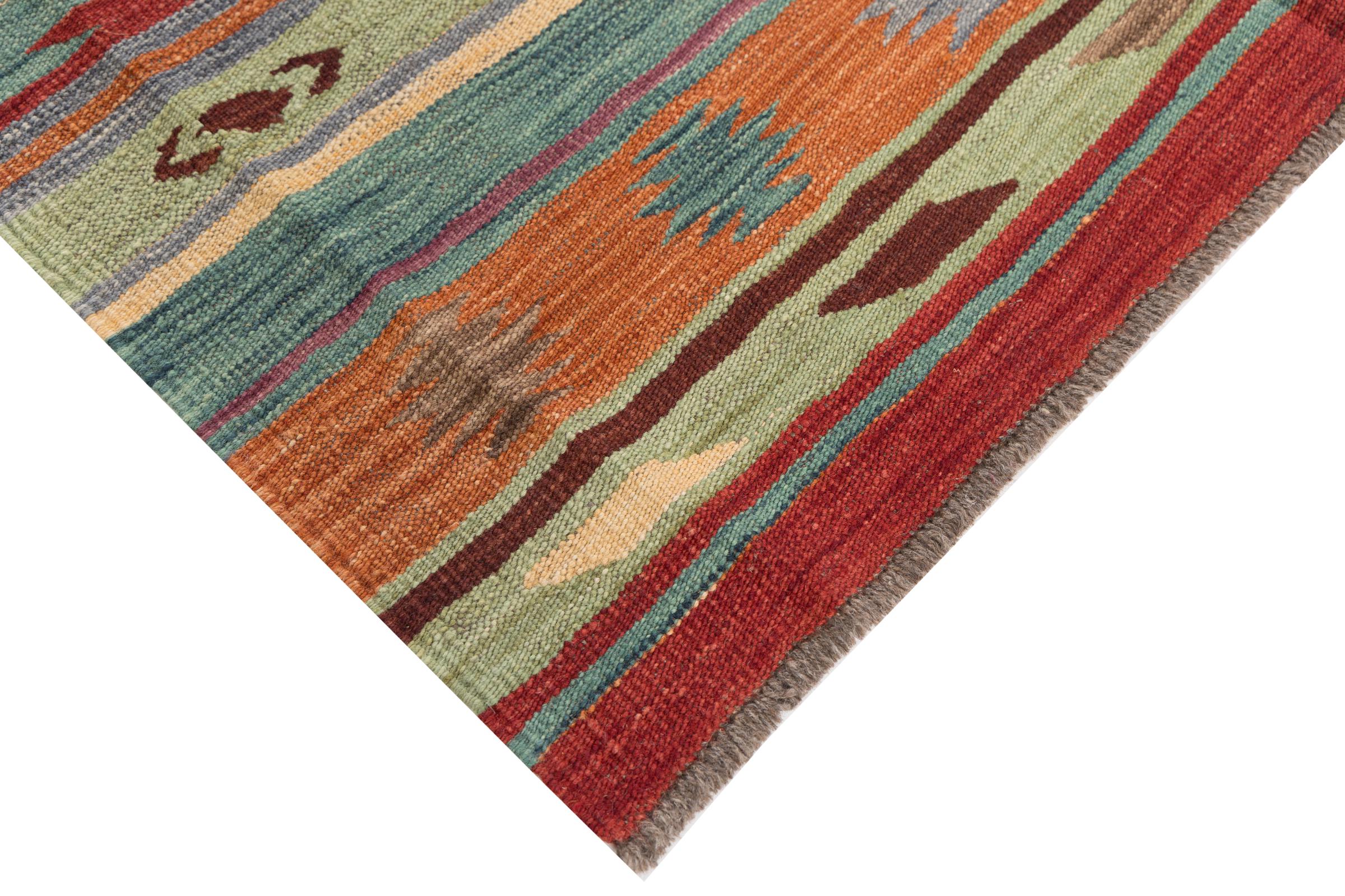 This rug was made as a flat weave by hand on a loom. Flatweave is the term used to describe rugs that have no pile. As the name promises, these rugs are woven and not knotted. This results in a flat rug with a structured surface. Flatweaves are not as soft and usually thinner than knotted rugs. At the same time they are much less complex to manufacture and can usually be laid out from both sides (front and back). Their patterns are usually geometric, which is determined by the fabric.