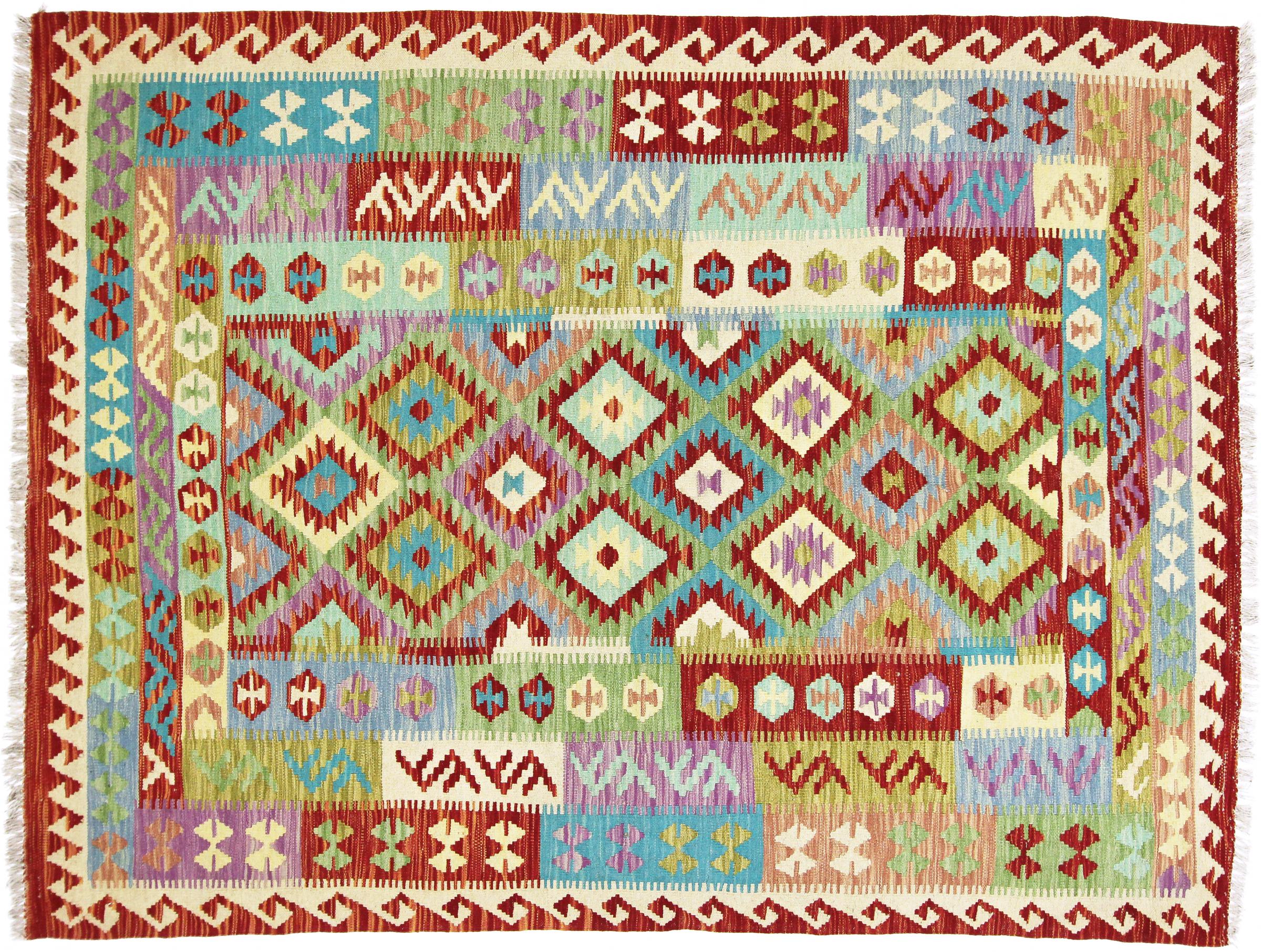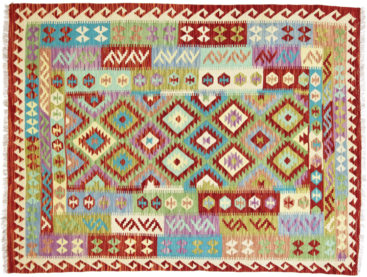Carpet ID: 73598009123738 Size: 214x159 cm Thickness: ap. 3 mm Manufacturing: Woven by hand Pile: Sheep wool Warp: Sheep wool Origin: Afghanistan Age: New Weight: ap. 5 kg Also know as Kilim, Qilim, Chilim, Afgan, Afghán In stock: Unique