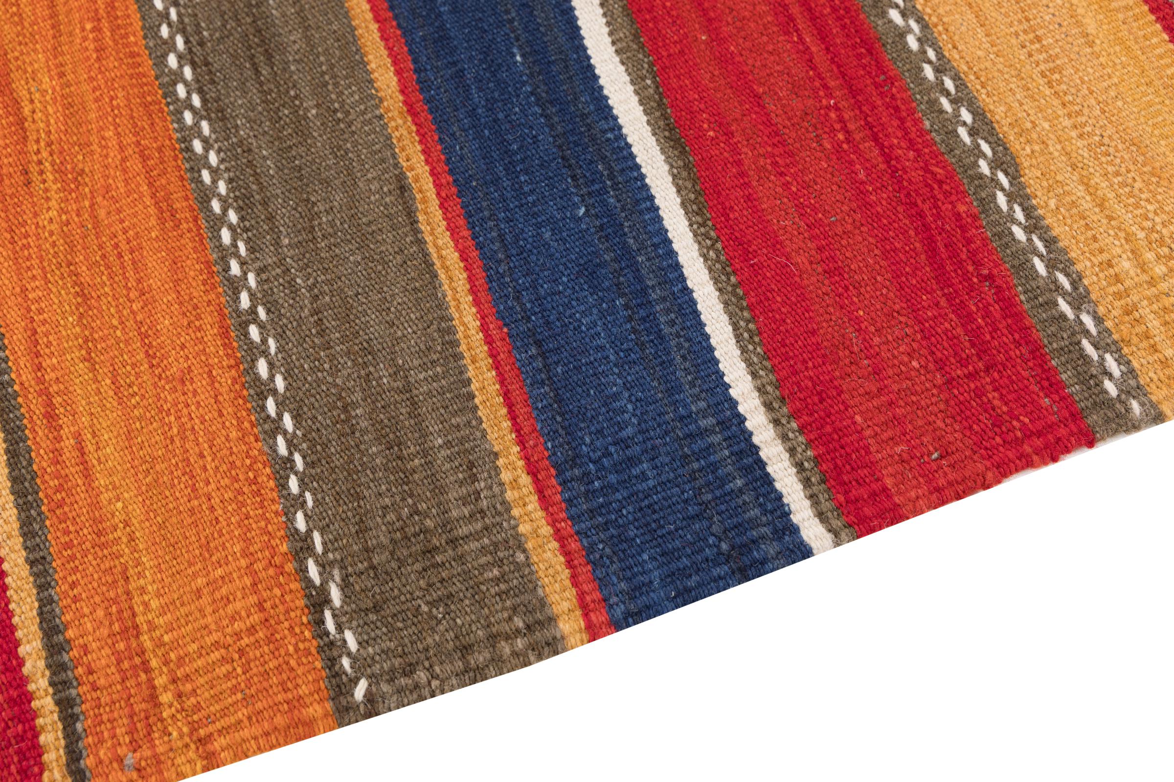 This rug was made as a flat weave by hand on a loom. Flatweave is the term used to describe rugs that have no pile. As the name promises, these rugs are woven and not knotted. This results in a flat rug with a structured surface. Flatweaves are not as soft and usually thinner than knotted rugs. At the same time they are much less complex to manufacture and can usually be laid out from both sides (front and back). Their patterns are usually geometric, which is determined by the fabric.