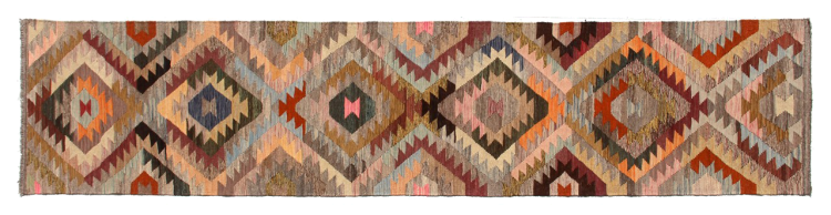 This handwoven Kilim Afghan is a wonderful and unique piece of art. Hard to believe that these modern colours and patterns have already been used centuries ago. This carpet has been woven by hand in old tradition in Afghanistan. It delivers a portion of contemporary history, which you won't find in this specific design a second time. It consists of high-grade natural wool and gives your home a personalised touch.