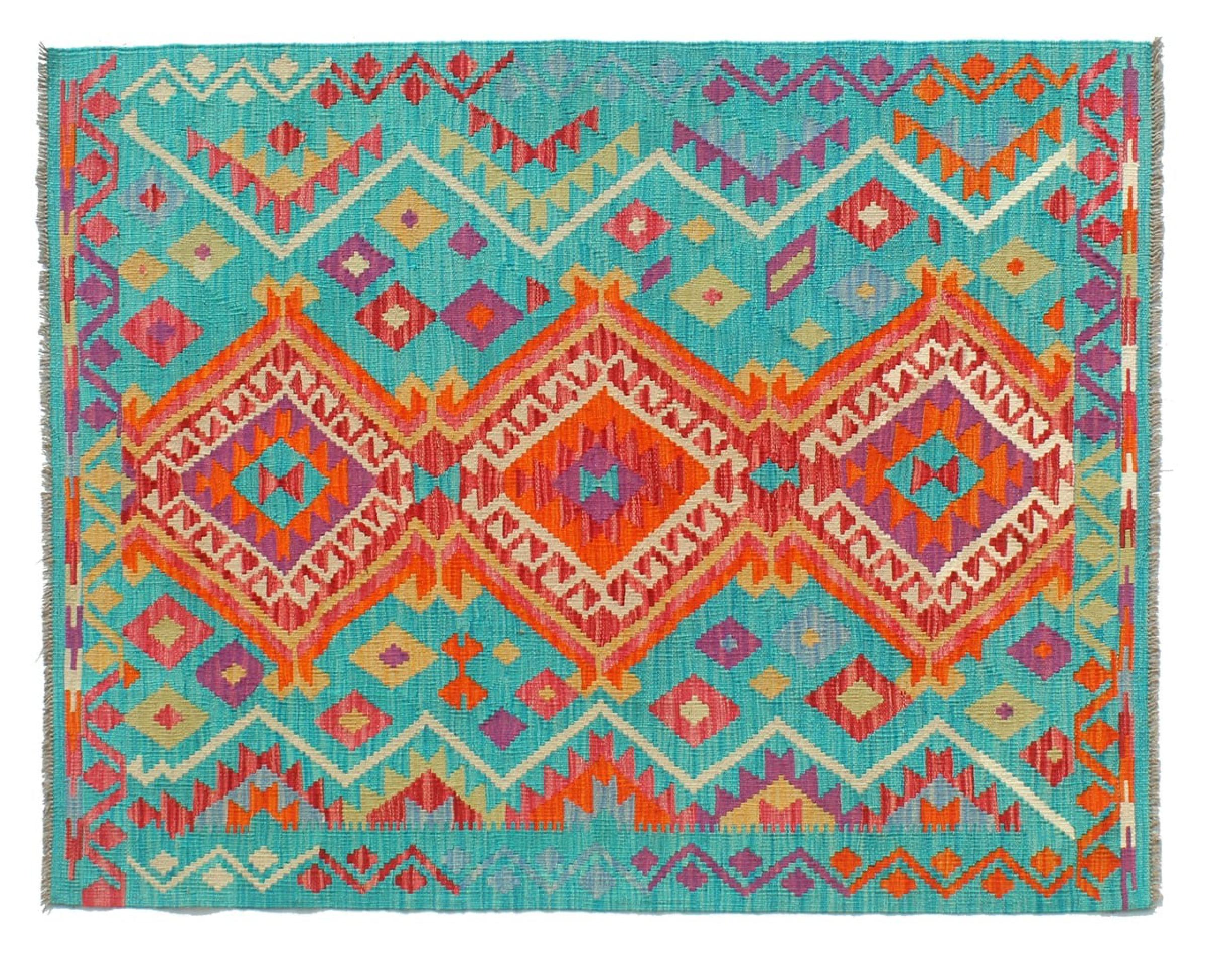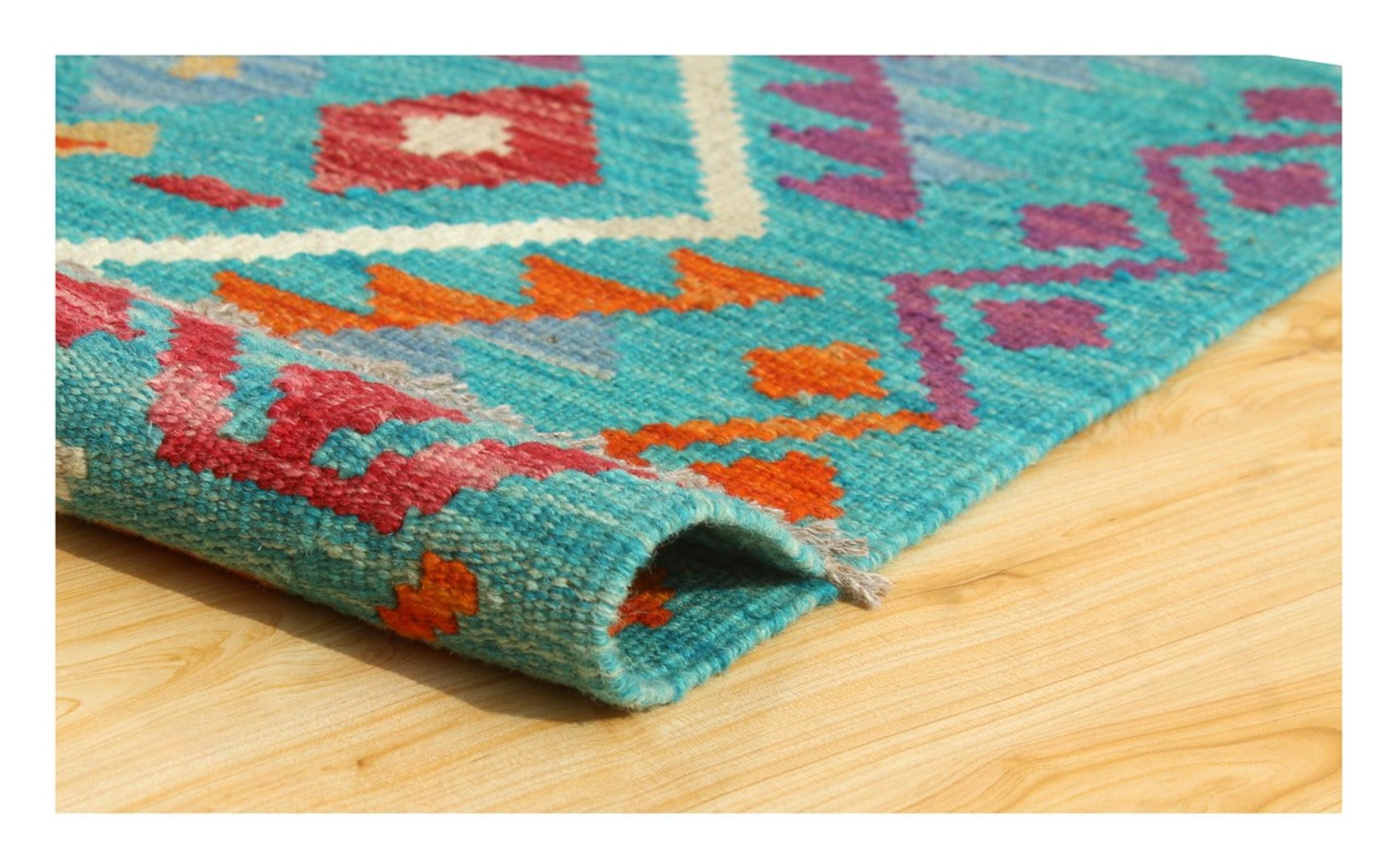 This handwoven Kilim Afghan is a wonderful and unique piece of art. Hard to believe that these modern colours and patterns have already been used centuries ago. This carpet has been woven by hand in old tradition in Afghanistan. It delivers a portion of contemporary history, which you won't find in this specific design a second time. It consists of high-grade natural wool and gives your home a personalised touch.