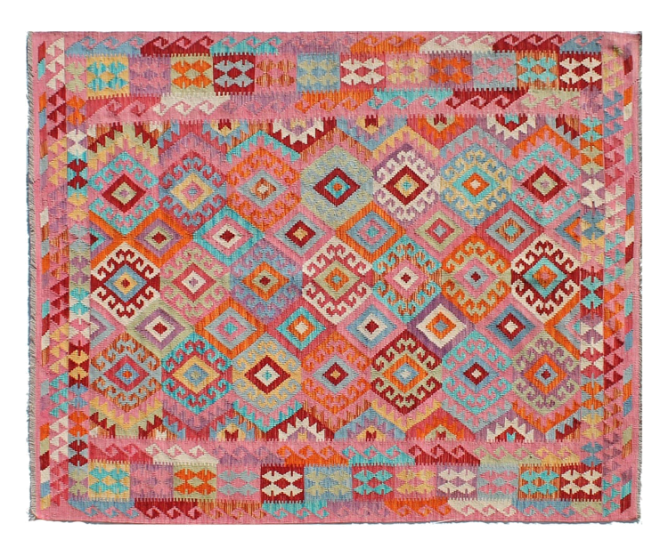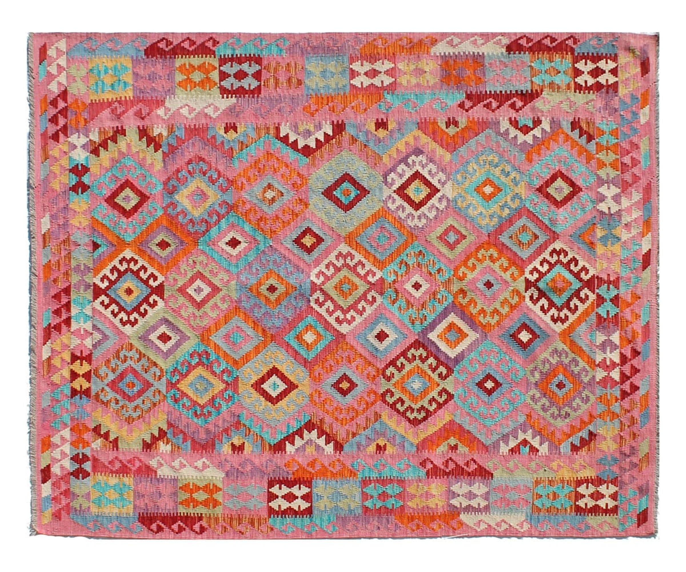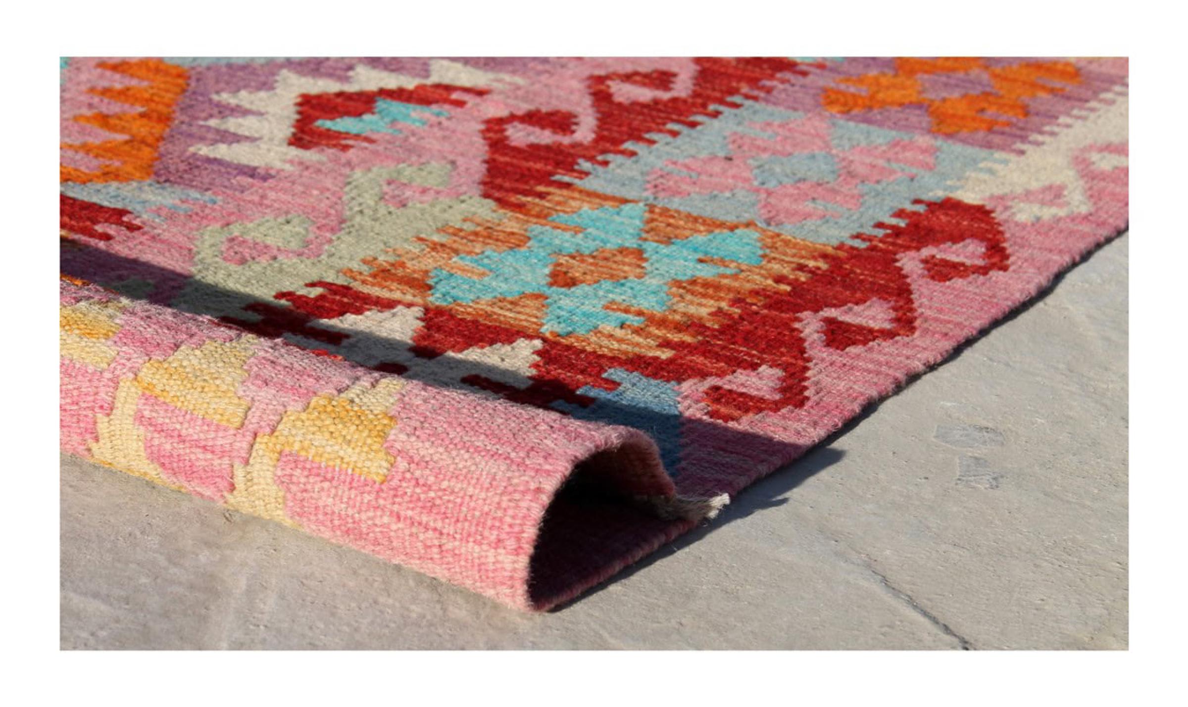 This handwoven Kilim Afghan is a wonderful and unique piece of art. Hard to believe that these modern colours and patterns have already been used centuries ago. This carpet has been woven by hand in old tradition in Afghanistan. It delivers a portion of contemporary history, which you won't find in this specific design a second time. It consists of high-grade natural wool and gives your home a personalised touch.