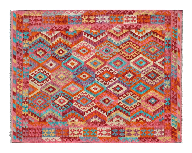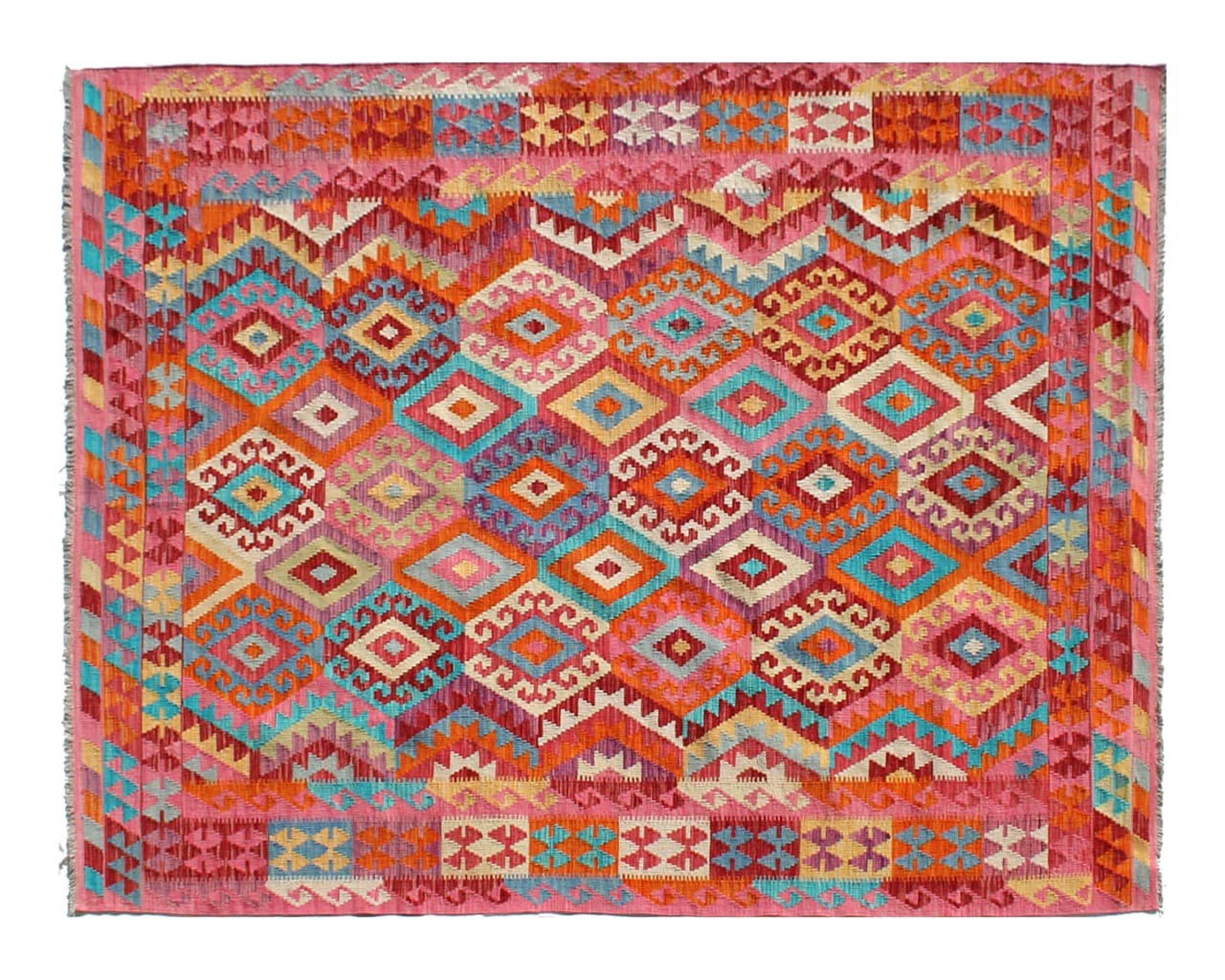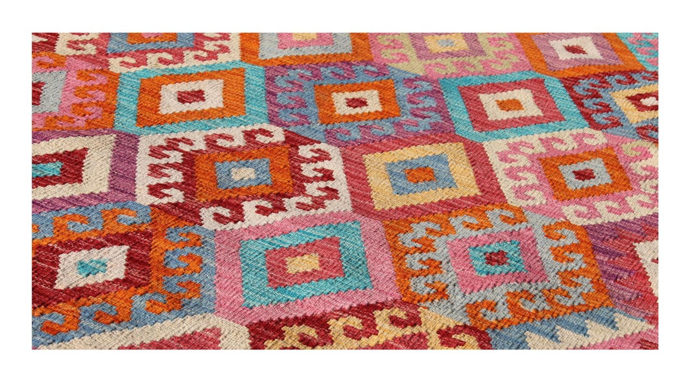 This handwoven Kilim Afghan is a wonderful and unique piece of art. Hard to believe that these modern colours and patterns have already been used centuries ago. This carpet has been woven by hand in old tradition in Afghanistan. It delivers a portion of contemporary history, which you won't find in this specific design a second time. It consists of high-grade natural wool and gives your home a personalised touch.