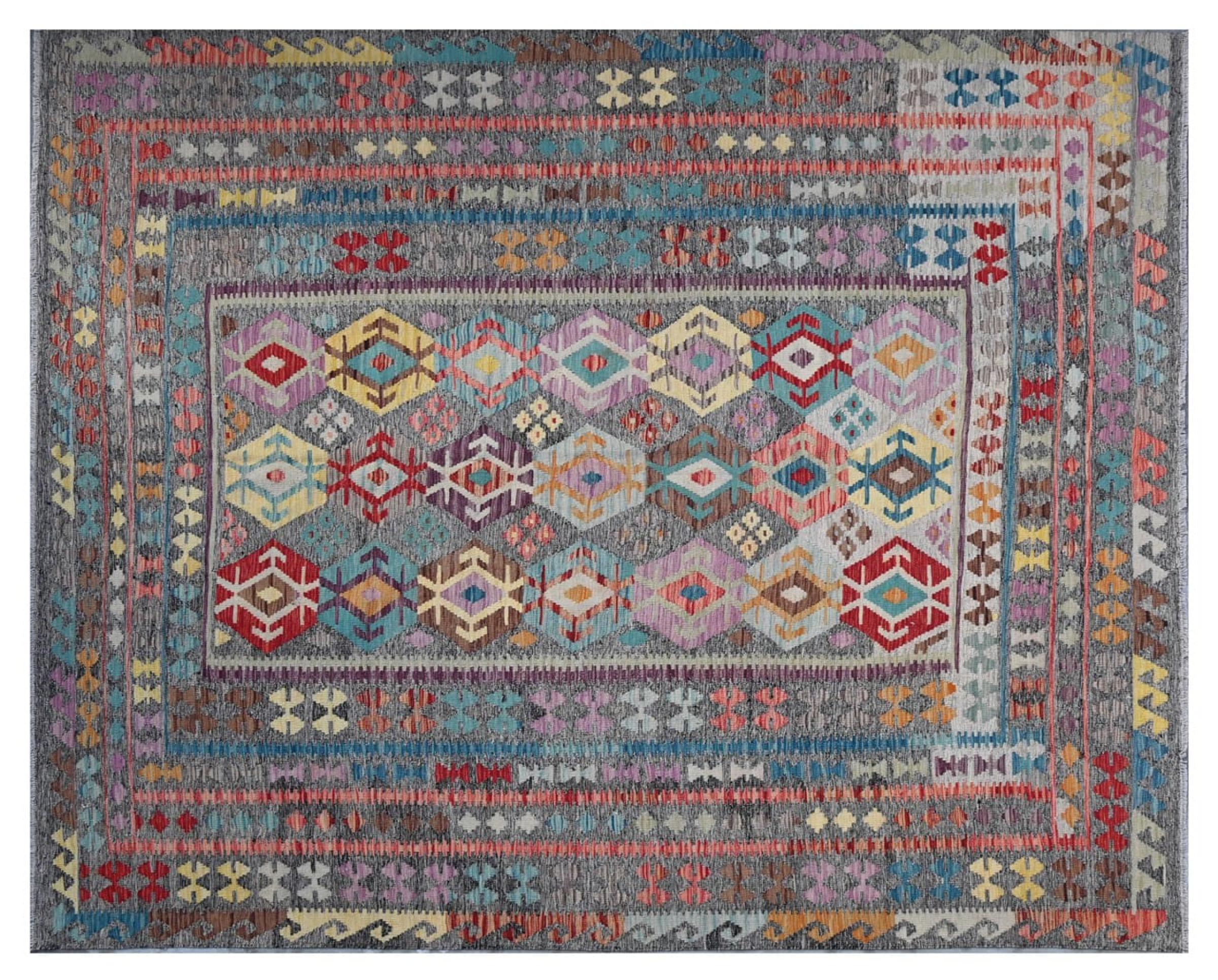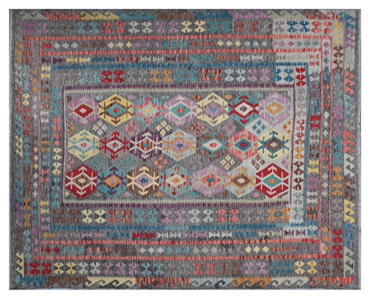 This handwoven Kilim Afghan is a wonderful and unique piece of art. Hard to believe that these modern colours and patterns have already been used centuries ago. This carpet has been woven by hand in old tradition in Afghanistan. It delivers a portion of contemporary history, which you won't find in this specific design a second time. It consists of high-grade natural wool and gives your home a personalised touch.