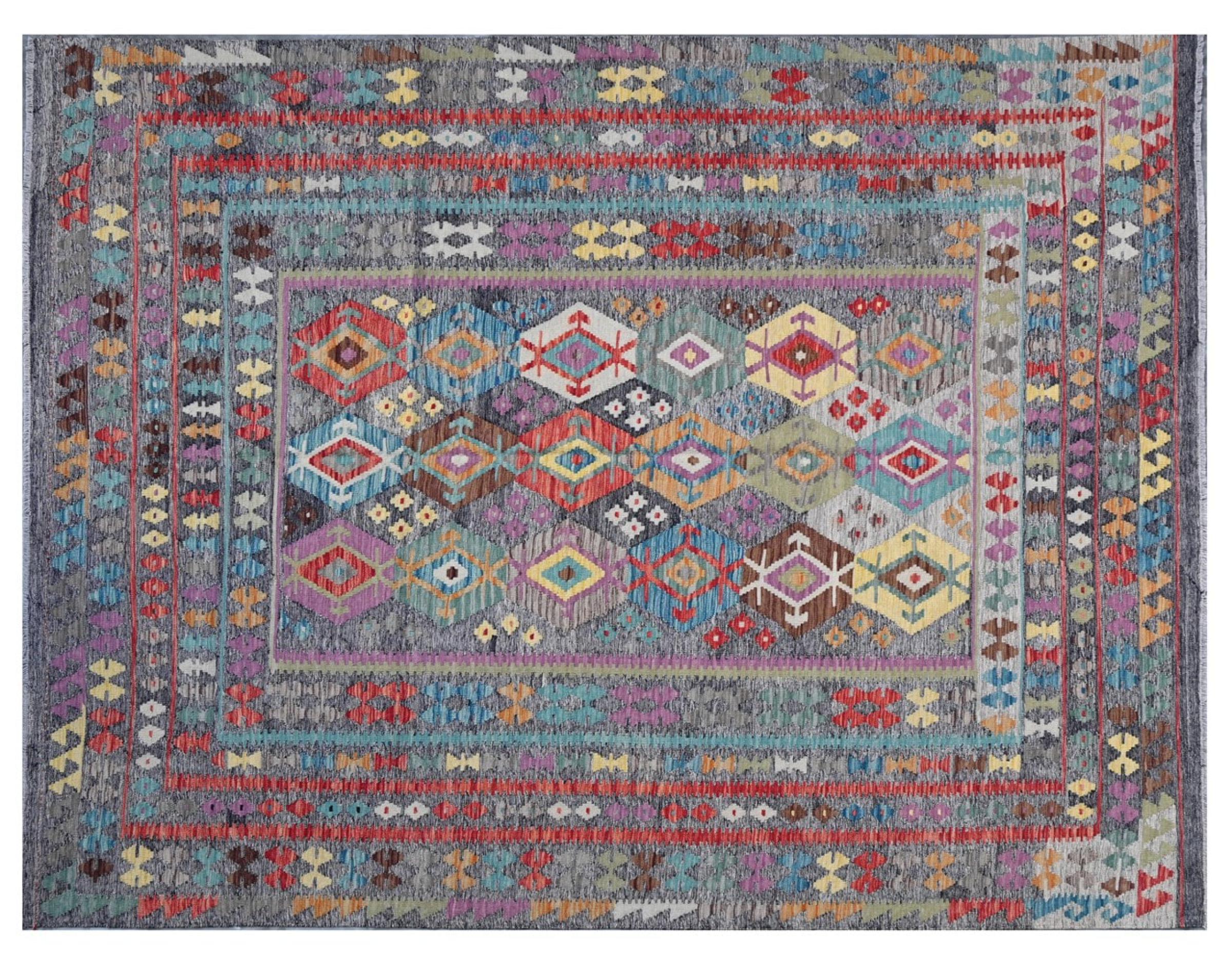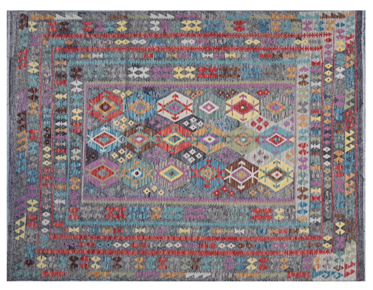 This handwoven Kilim Afghan is a wonderful and unique piece of art. Hard to believe that these modern colours and patterns have already been used centuries ago. This carpet has been woven by hand in old tradition in Afghanistan. It delivers a portion of contemporary history, which you won't find in this specific design a second time. It consists of high-grade natural wool and gives your home a personalised touch.