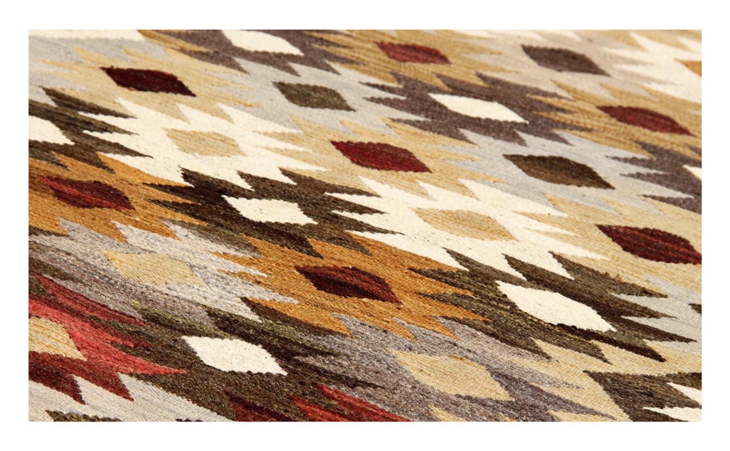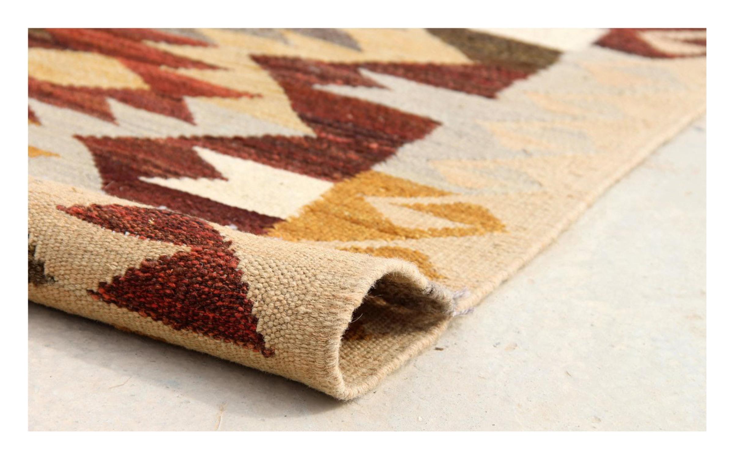 This rug was made as a flat weave by hand on a loom. Flatweave is the term used to describe rugs that have no pile. As the name promises, these rugs are woven and not knotted. This results in a flat rug with a structured surface. Flatweaves are not as soft and usually thinner than knotted rugs. At the same time they are much less complex to manufacture and can usually be laid out from both sides (front and back). Their patterns are usually geometric, which is determined by the fabric.