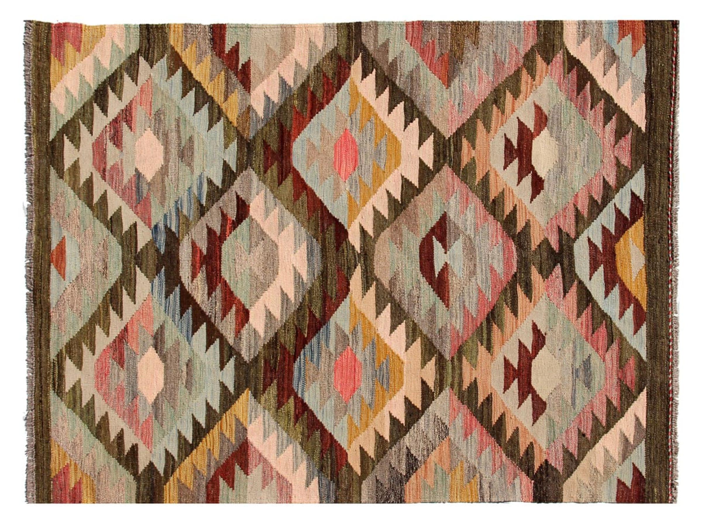 This handwoven Kilim Afghan is a wonderful and unique piece of art. Hard to believe that these modern colours and patterns have already been used centuries ago. This carpet has been woven by hand in old tradition in Afghanistan. It delivers a portion of contemporary history, which you won't find in this specific design a second time. It consists of high-grade natural wool and gives your home a personalised touch.
