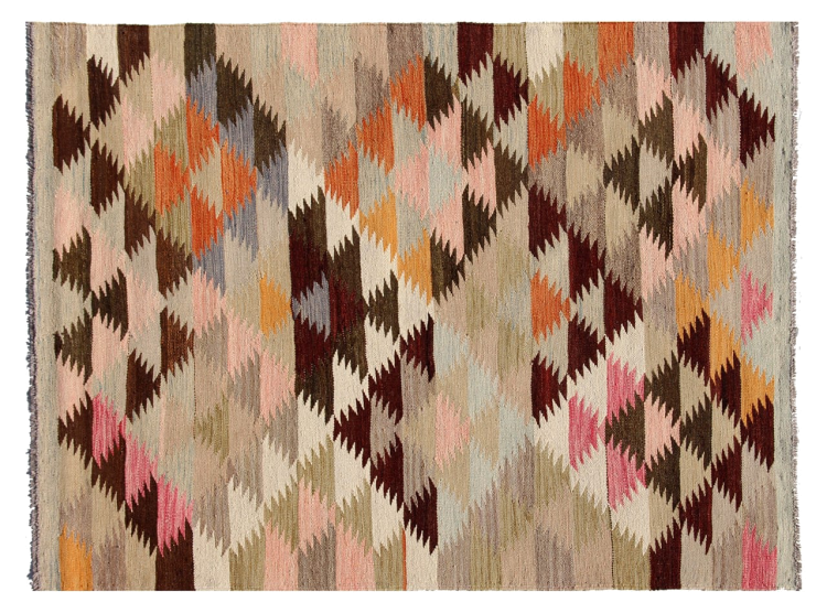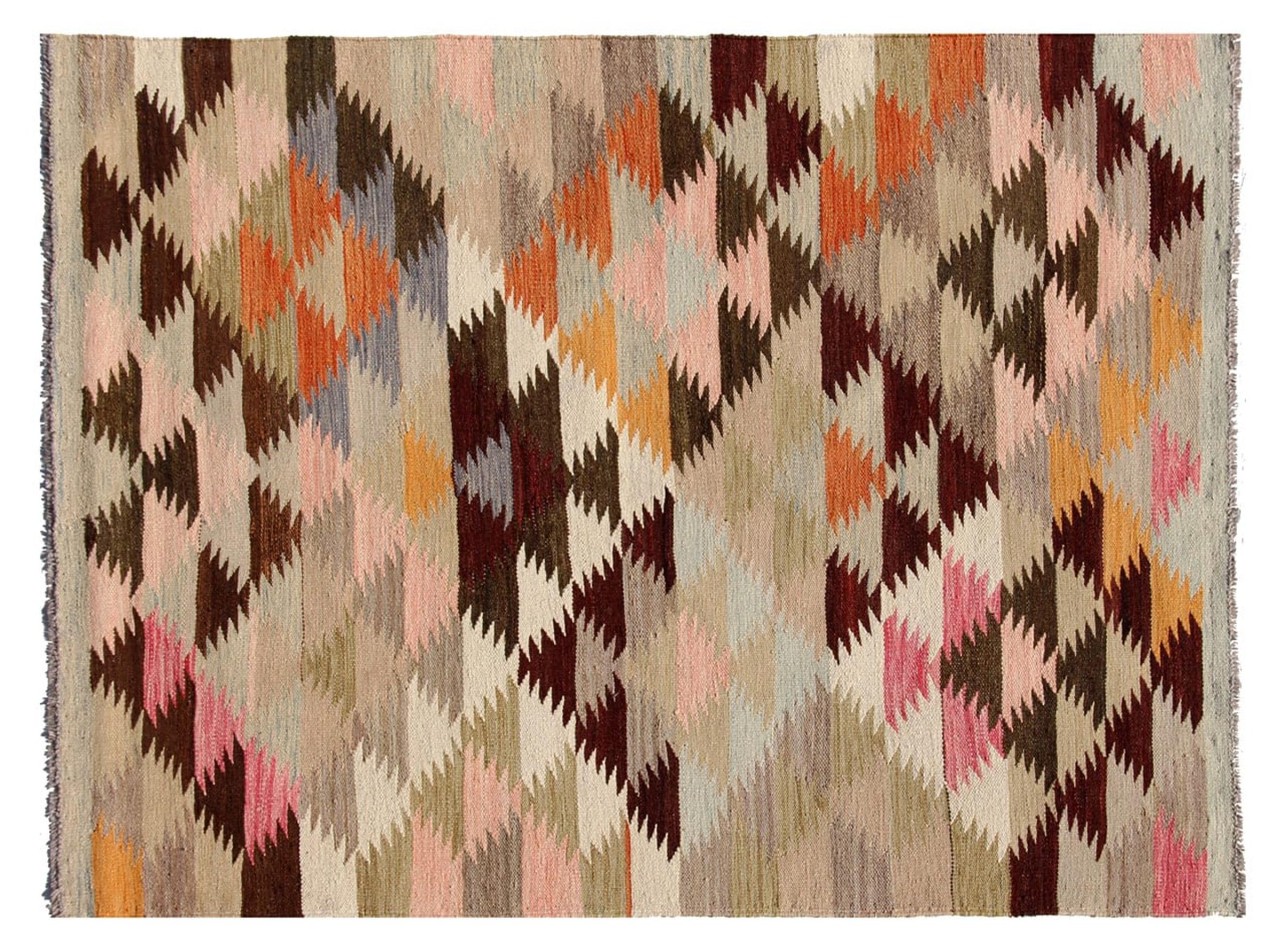 This handwoven Kilim Afghan is a wonderful and unique piece of art. Hard to believe that these modern colours and patterns have already been used centuries ago. This carpet has been woven by hand in old tradition in Afghanistan. It delivers a portion of contemporary history, which you won't find in this specific design a second time. It consists of high-grade natural wool and gives your home a personalised touch.