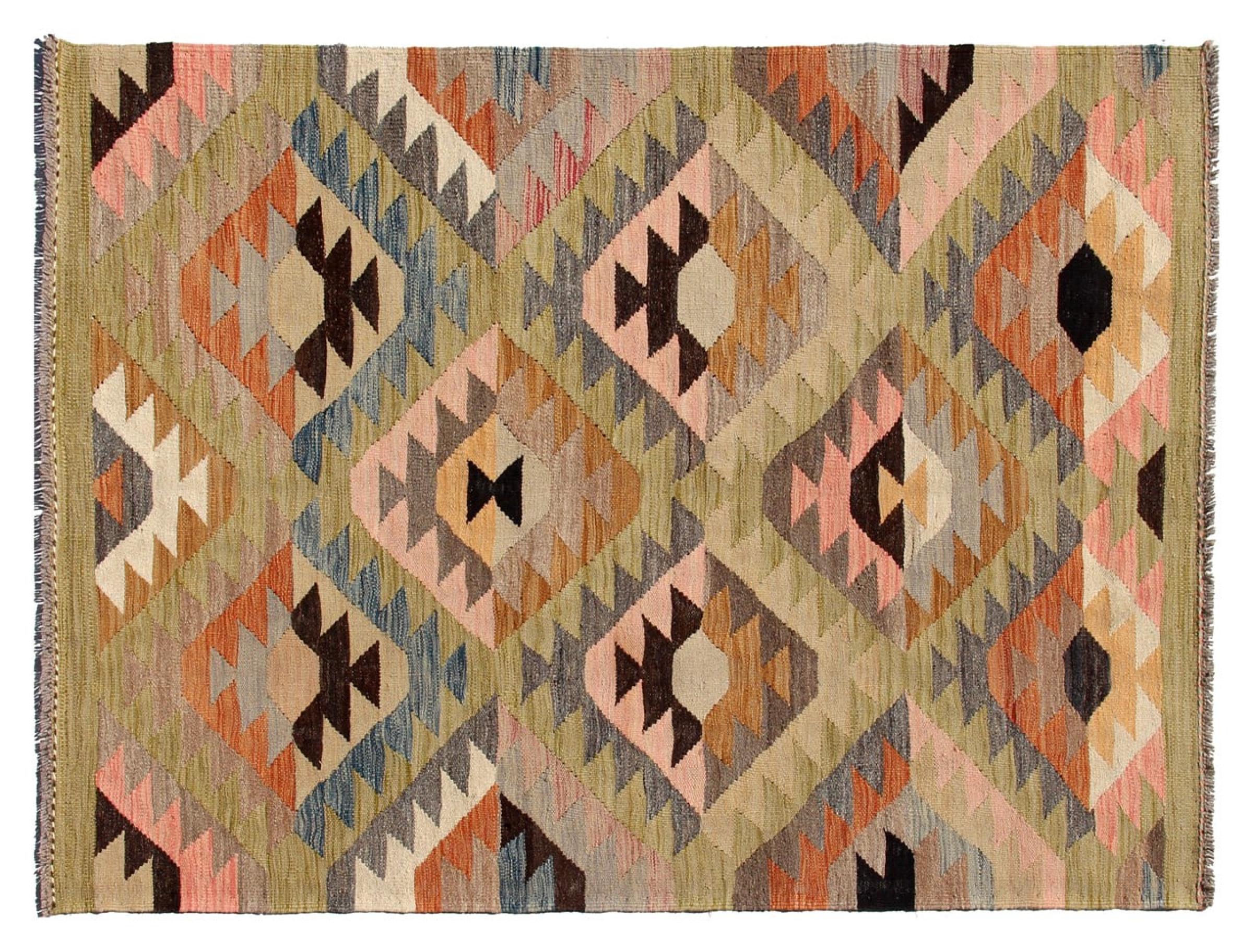 This handwoven Kilim Afghan is a wonderful and unique piece of art. Hard to believe that these modern colours and patterns have already been used centuries ago. This carpet has been woven by hand in old tradition in Afghanistan. It delivers a portion of contemporary history, which you won't find in this specific design a second time. It consists of high-grade natural wool and gives your home a personalised touch.