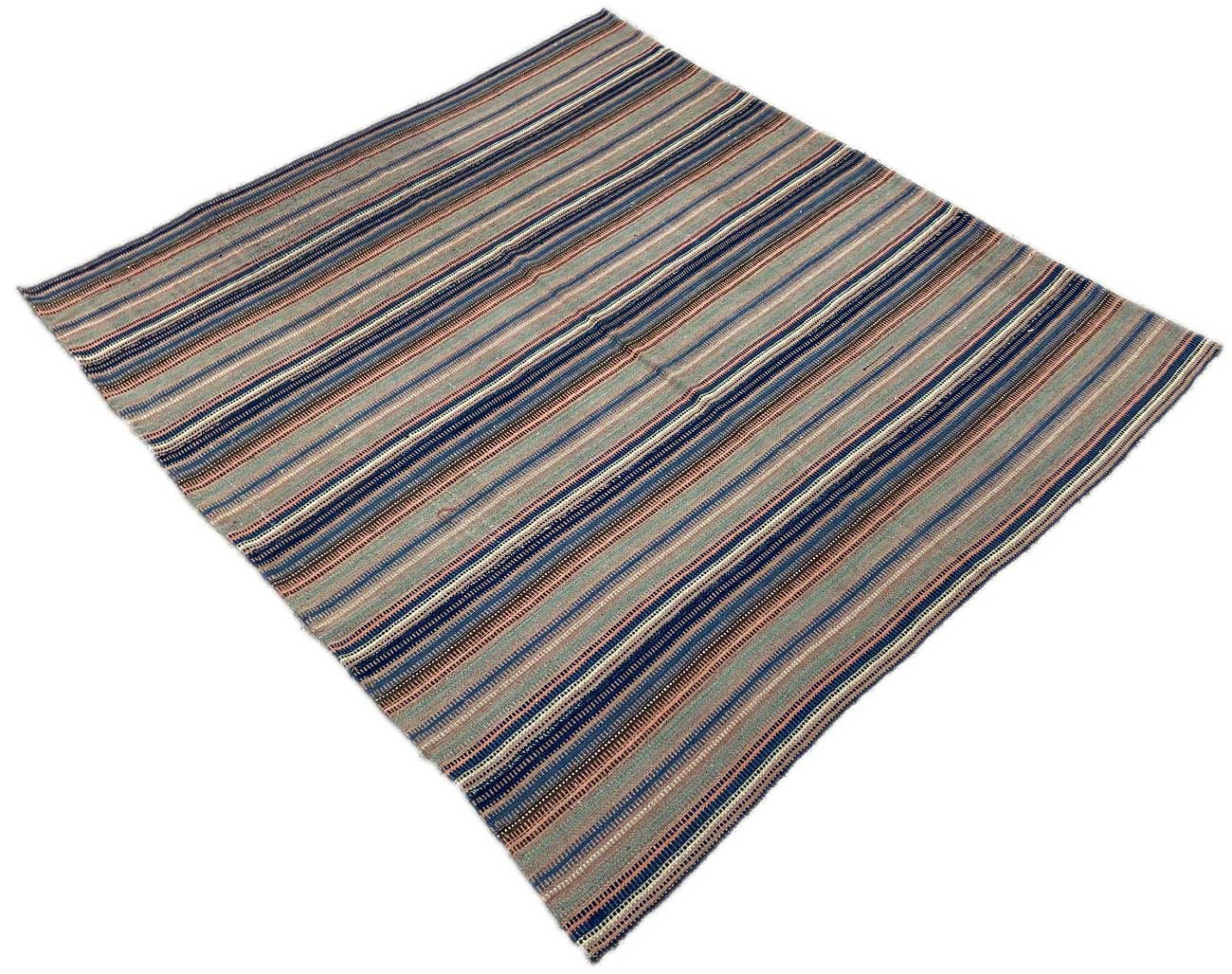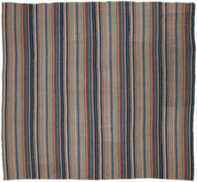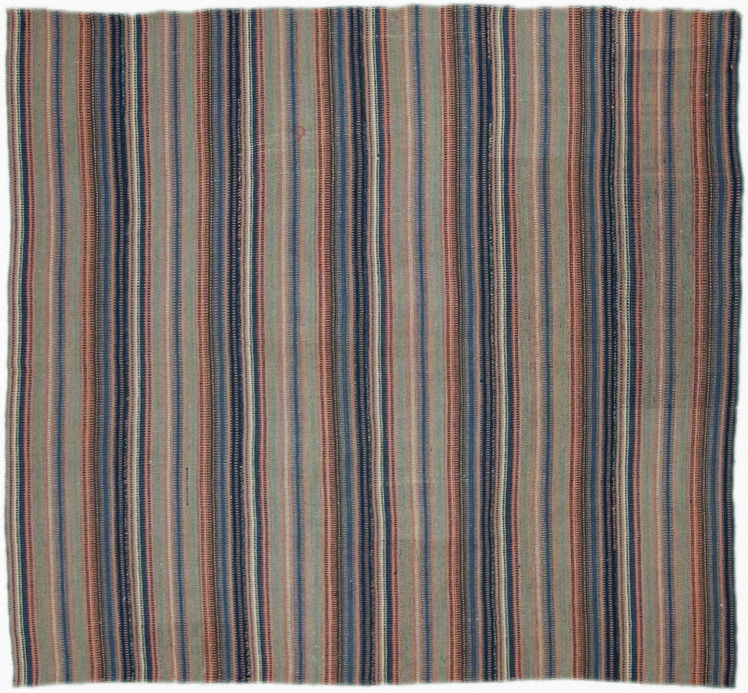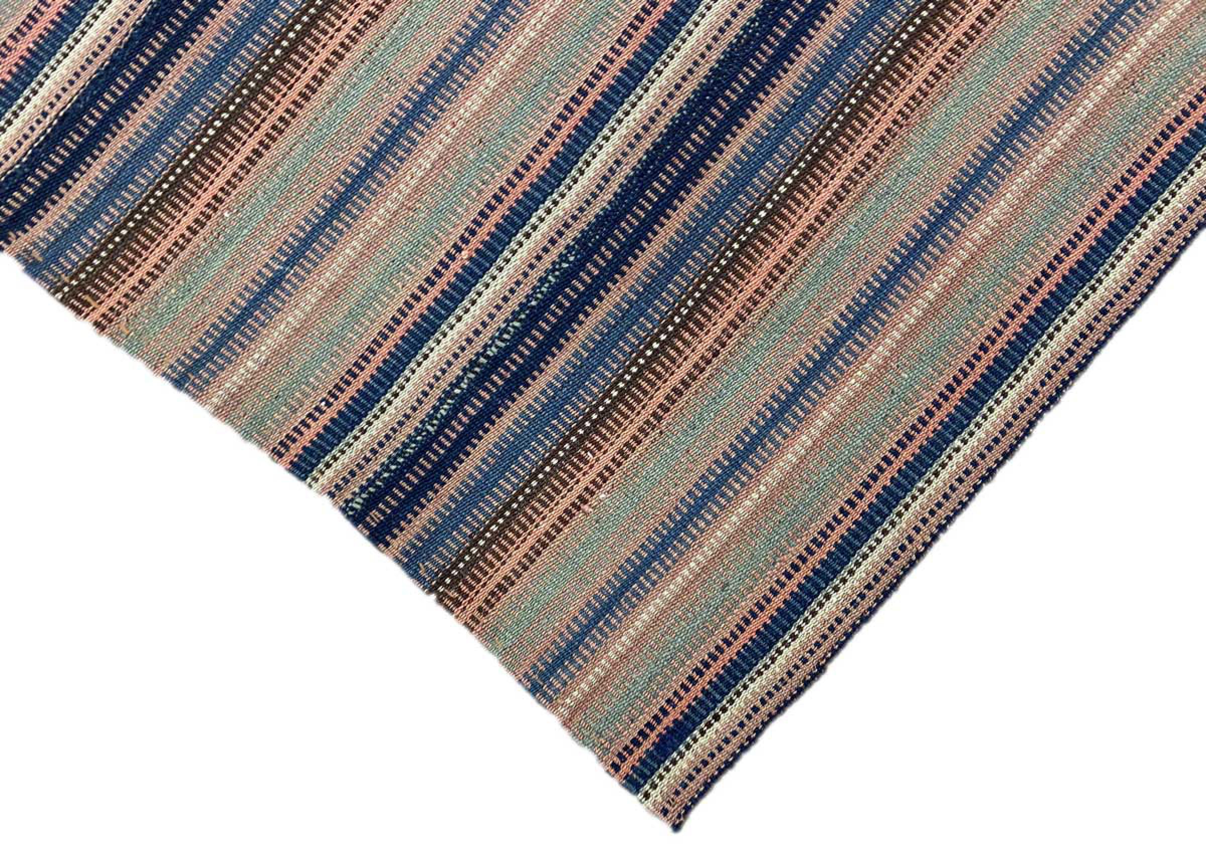 This rug was made as a flat weave by hand on a loom. Flatweave is the term used to describe rugs that have no pile. As the name promises, these rugs are woven and not knotted. This results in a flat rug with a structured surface. Flatweaves are not as soft and usually thinner than knotted rugs. At the same time they are much less complex to manufacture and can usually be laid out from both sides (front and back). Their patterns are usually geometric, which is determined by the fabric.