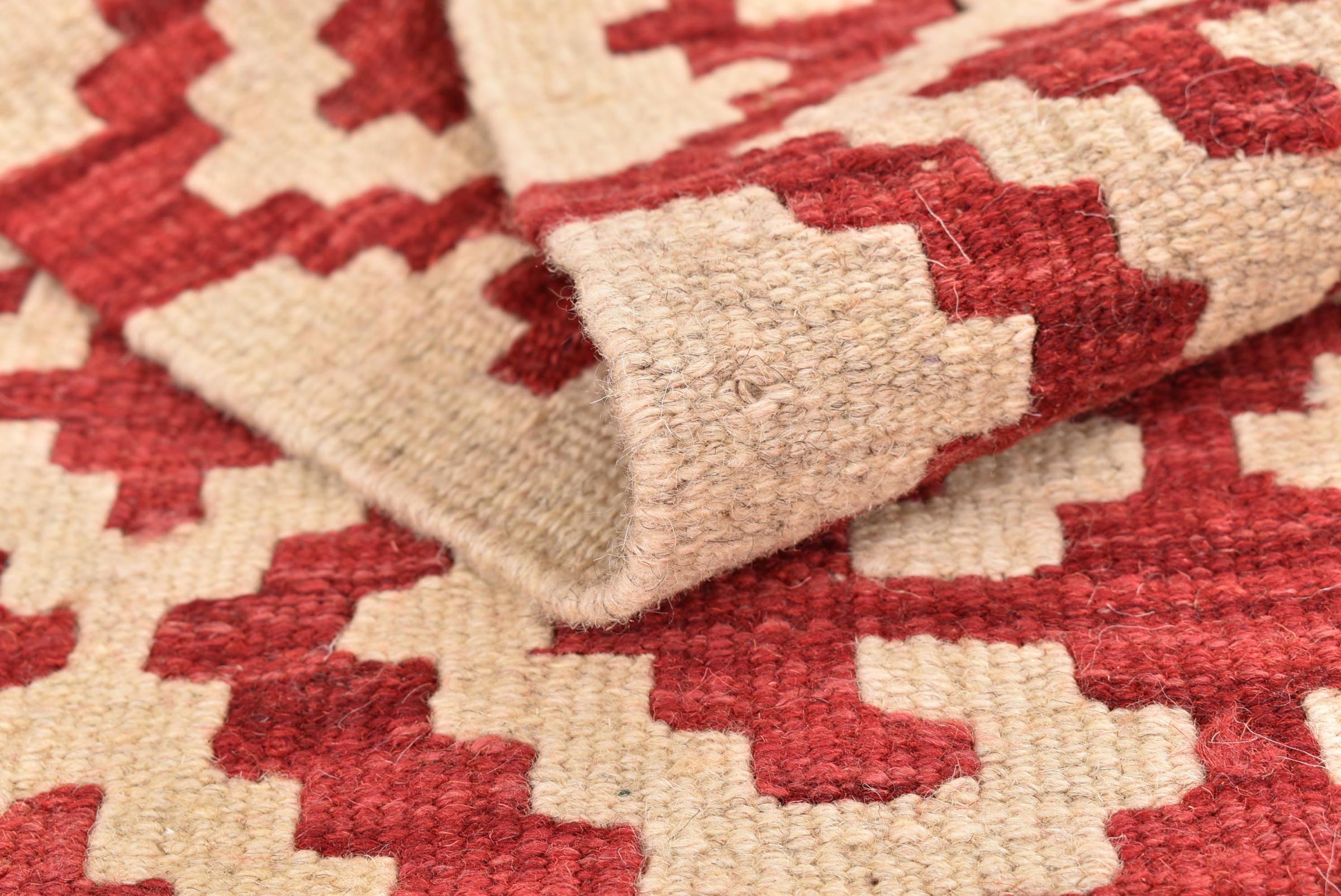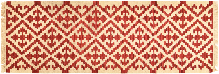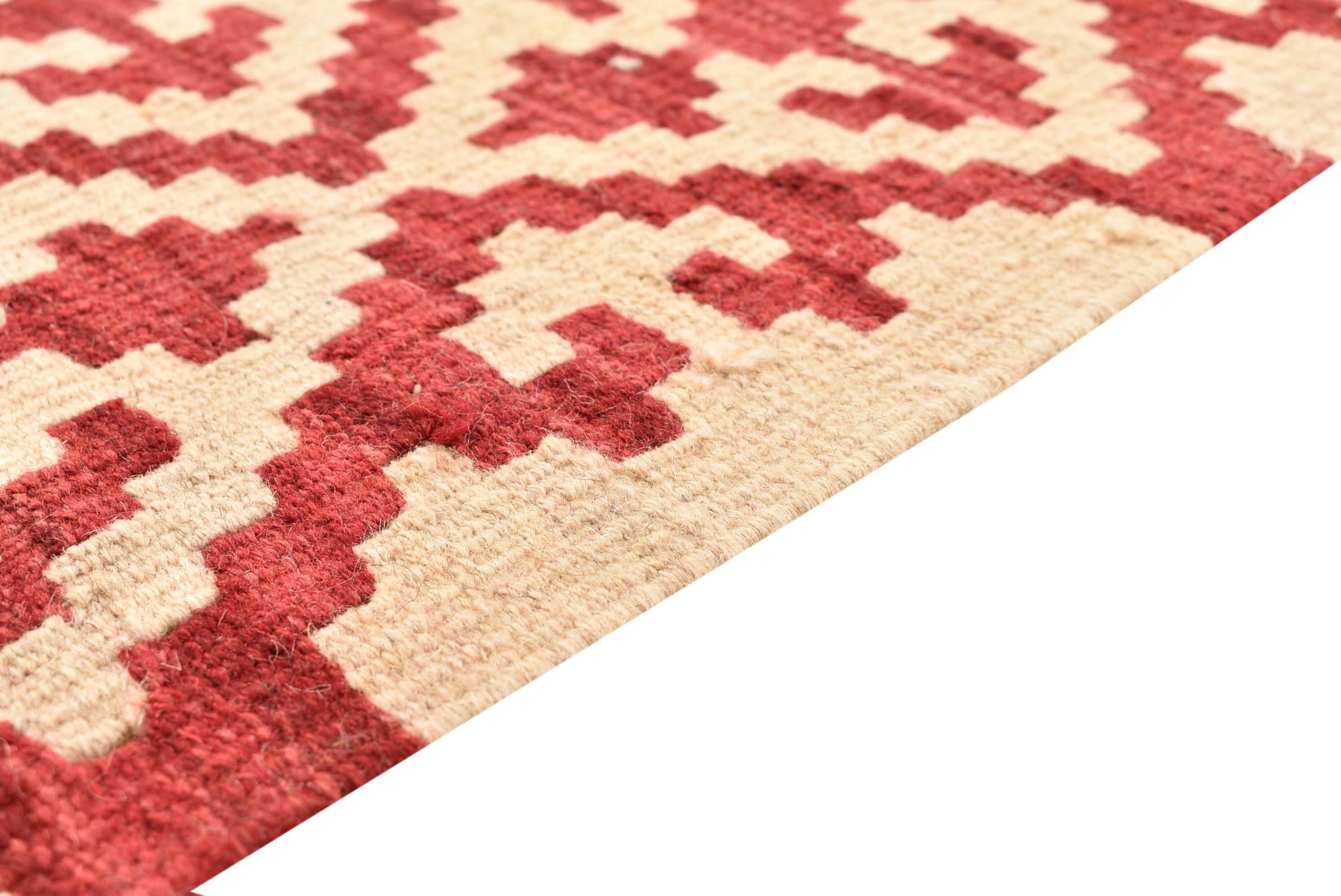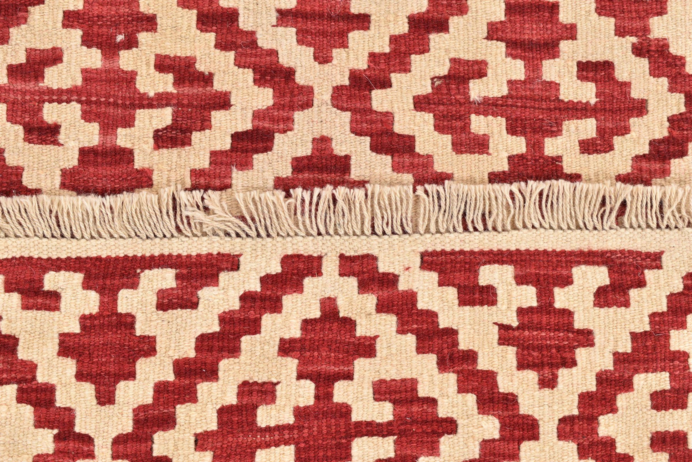 This rug was made as a flat weave by hand on a loom. Flatweave is the term used to describe rugs that have no pile. As the name promises, these rugs are woven and not knotted. This results in a flat rug with a structured surface. Flatweaves are not as soft and usually thinner than knotted rugs. At the same time they are much less complex to manufacture and can usually be laid out from both sides (front and back). Their patterns are usually geometric, which is determined by the fabric.