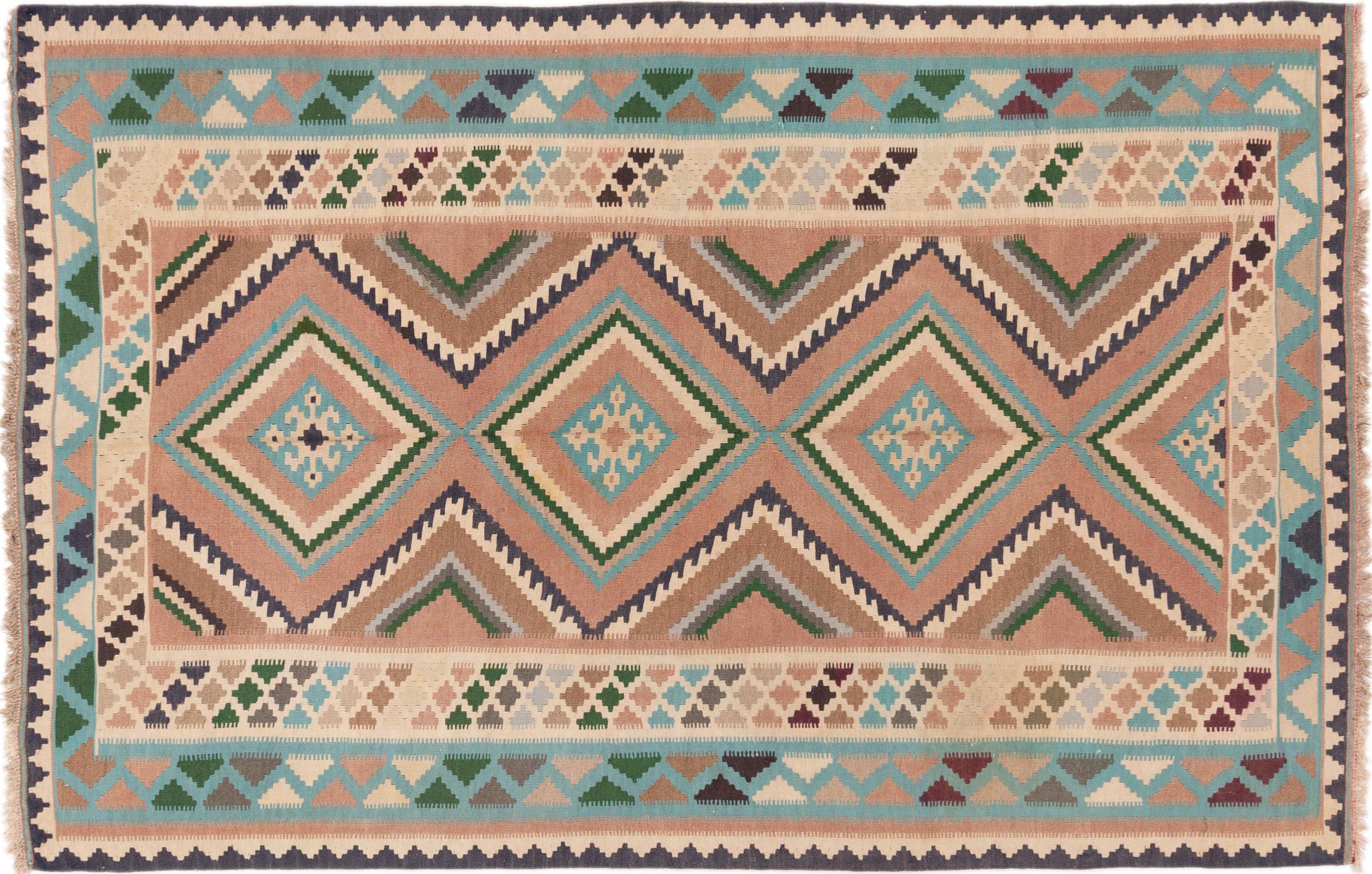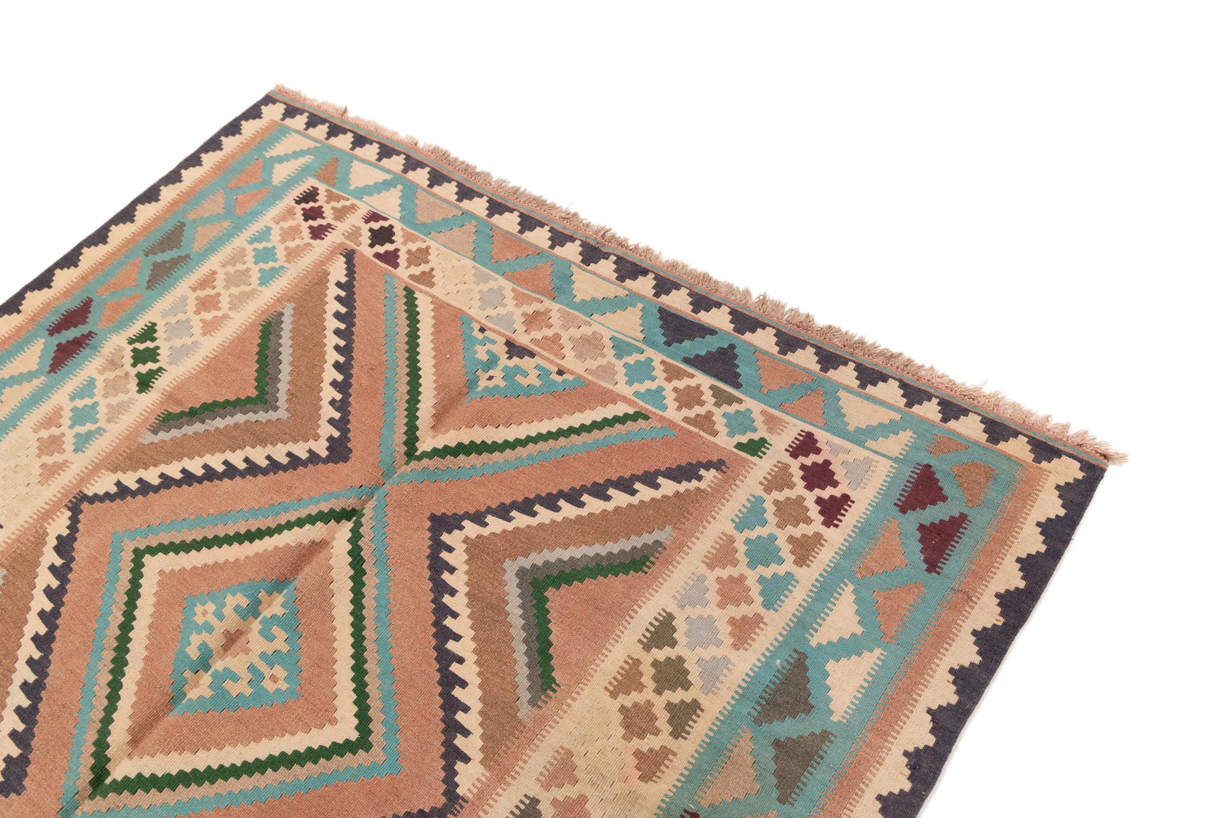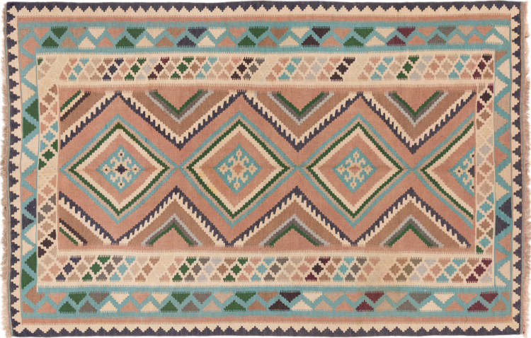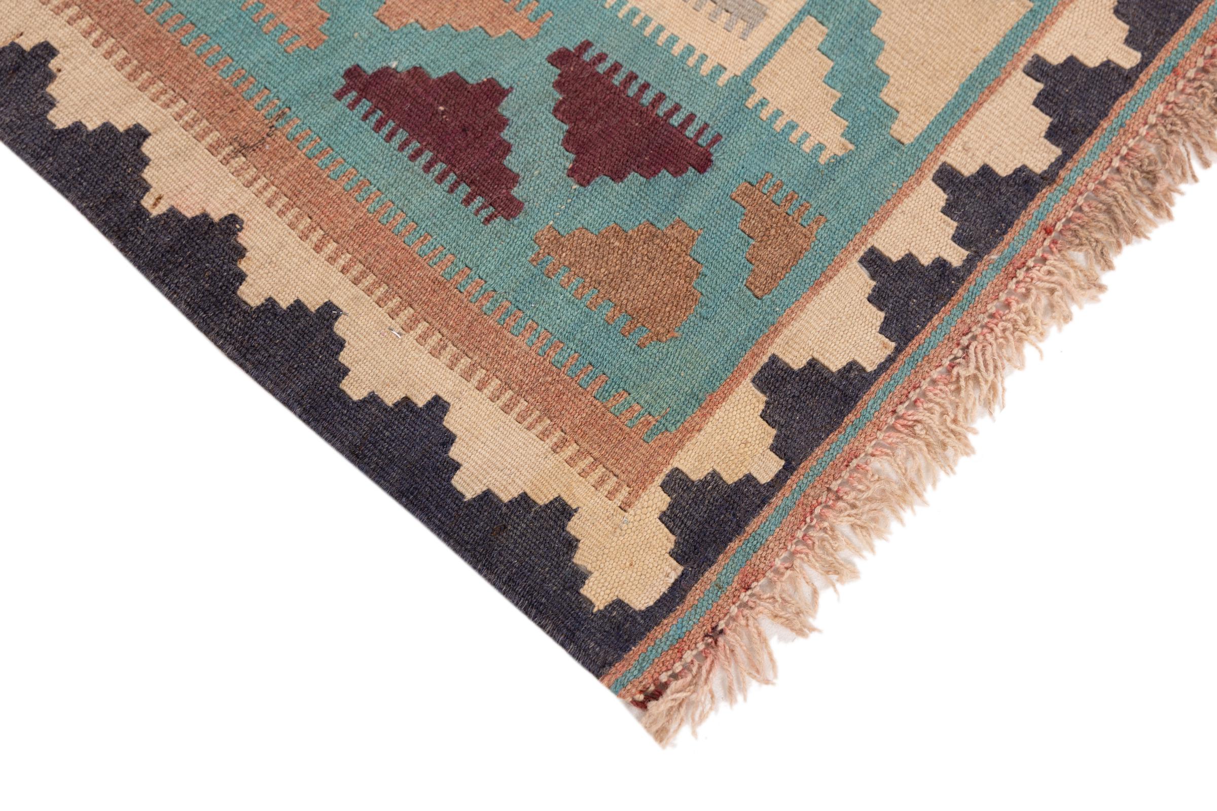This rug was made as a flat weave by hand on a loom. Flatweave is the term used to describe rugs that have no pile. As the name promises, these rugs are woven and not knotted. This results in a flat rug with a structured surface. Flatweaves are not as soft and usually thinner than knotted rugs. At the same time they are much less complex to manufacture and can usually be laid out from both sides (front and back). Their patterns are usually geometric, which is determined by the fabric.