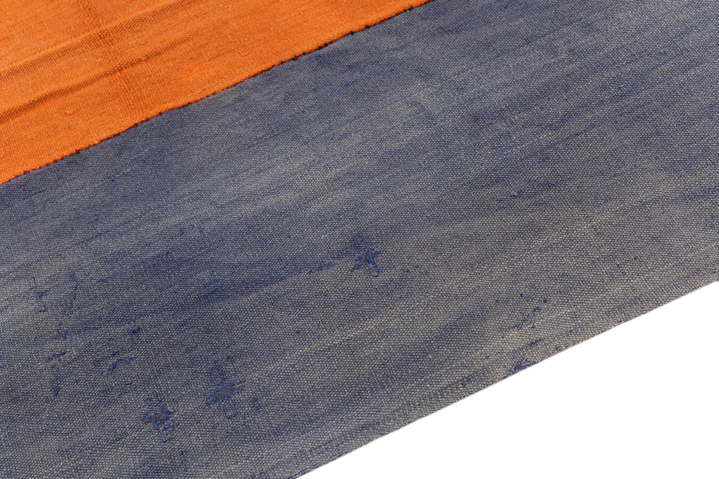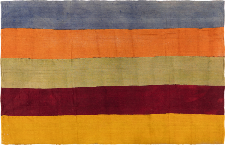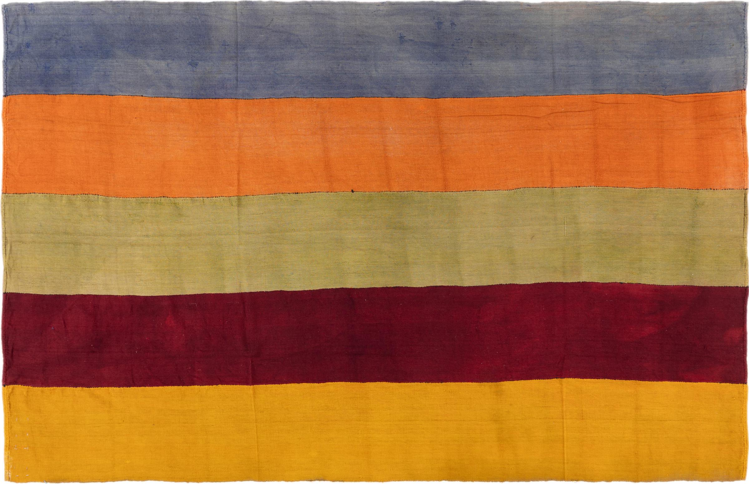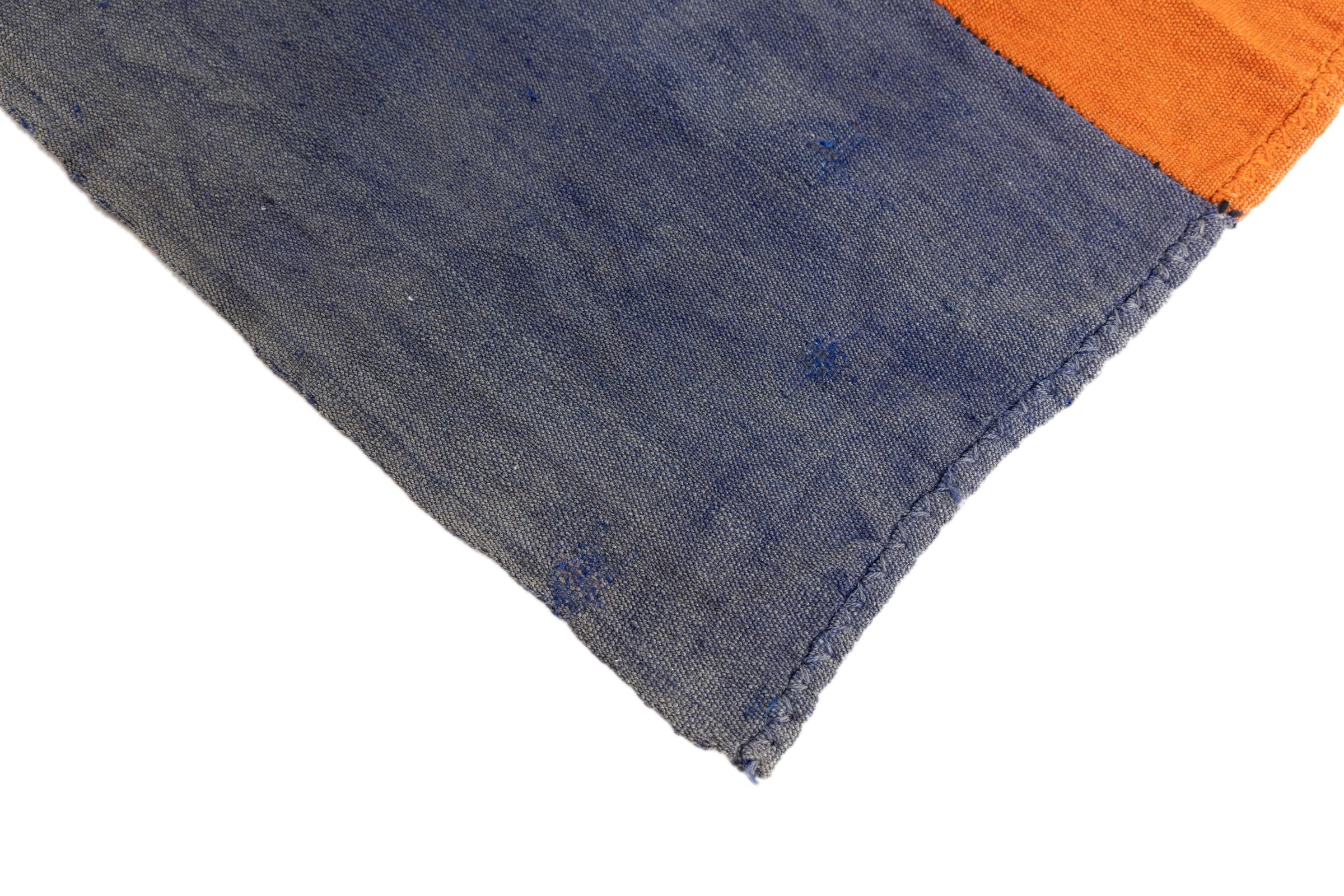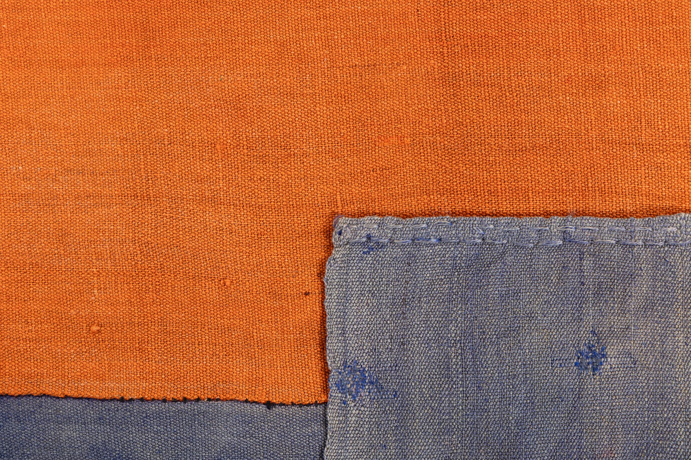 This rug was made as a flat weave by hand on a loom. Flatweave is the term used to describe rugs that have no pile. As the name promises, these rugs are woven and not knotted. This results in a flat rug with a structured surface. Flatweaves are not as soft and usually thinner than knotted rugs. At the same time they are much less complex to manufacture and can usually be laid out from both sides (front and back). Their patterns are usually geometric, which is determined by the fabric.