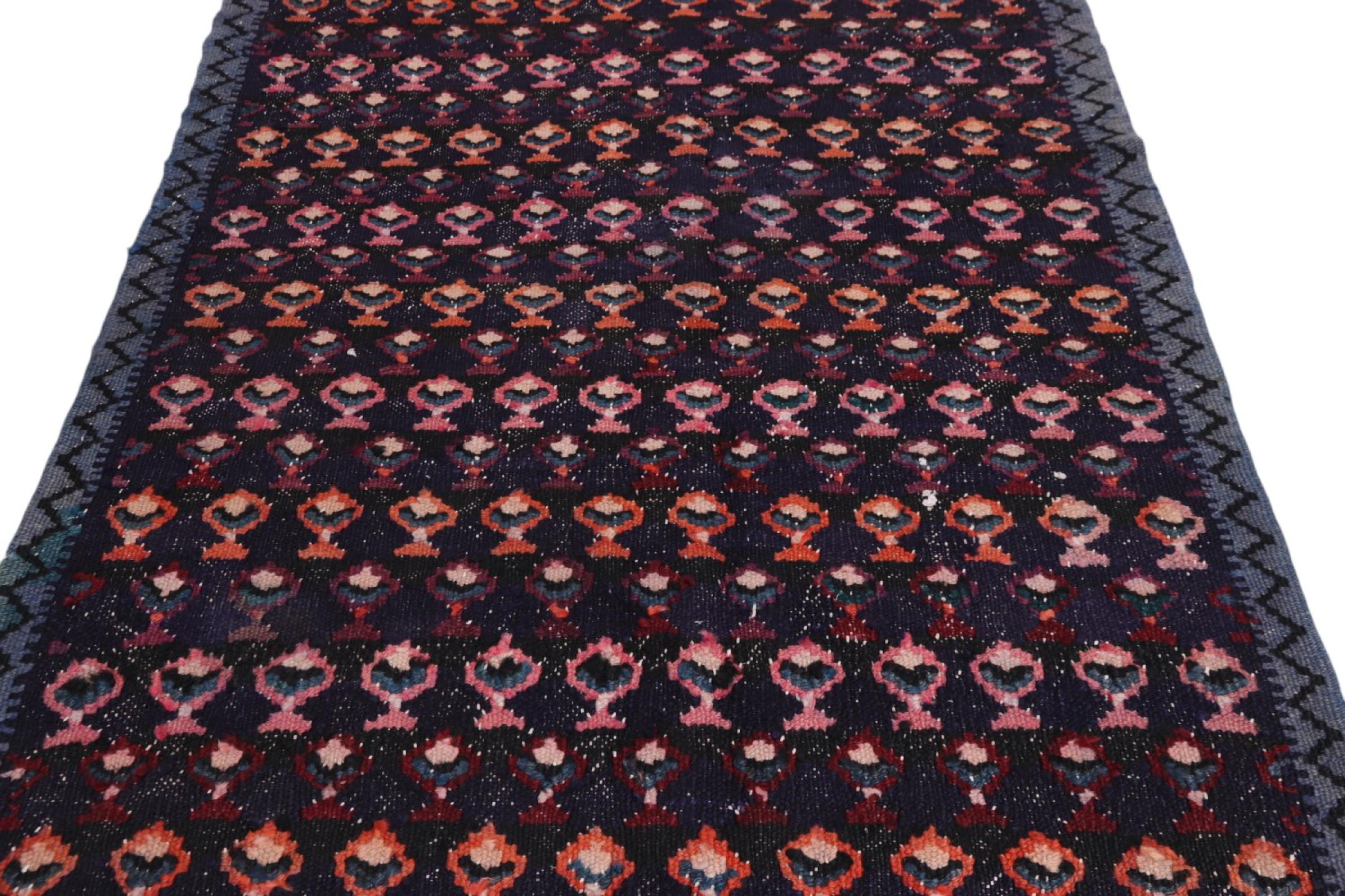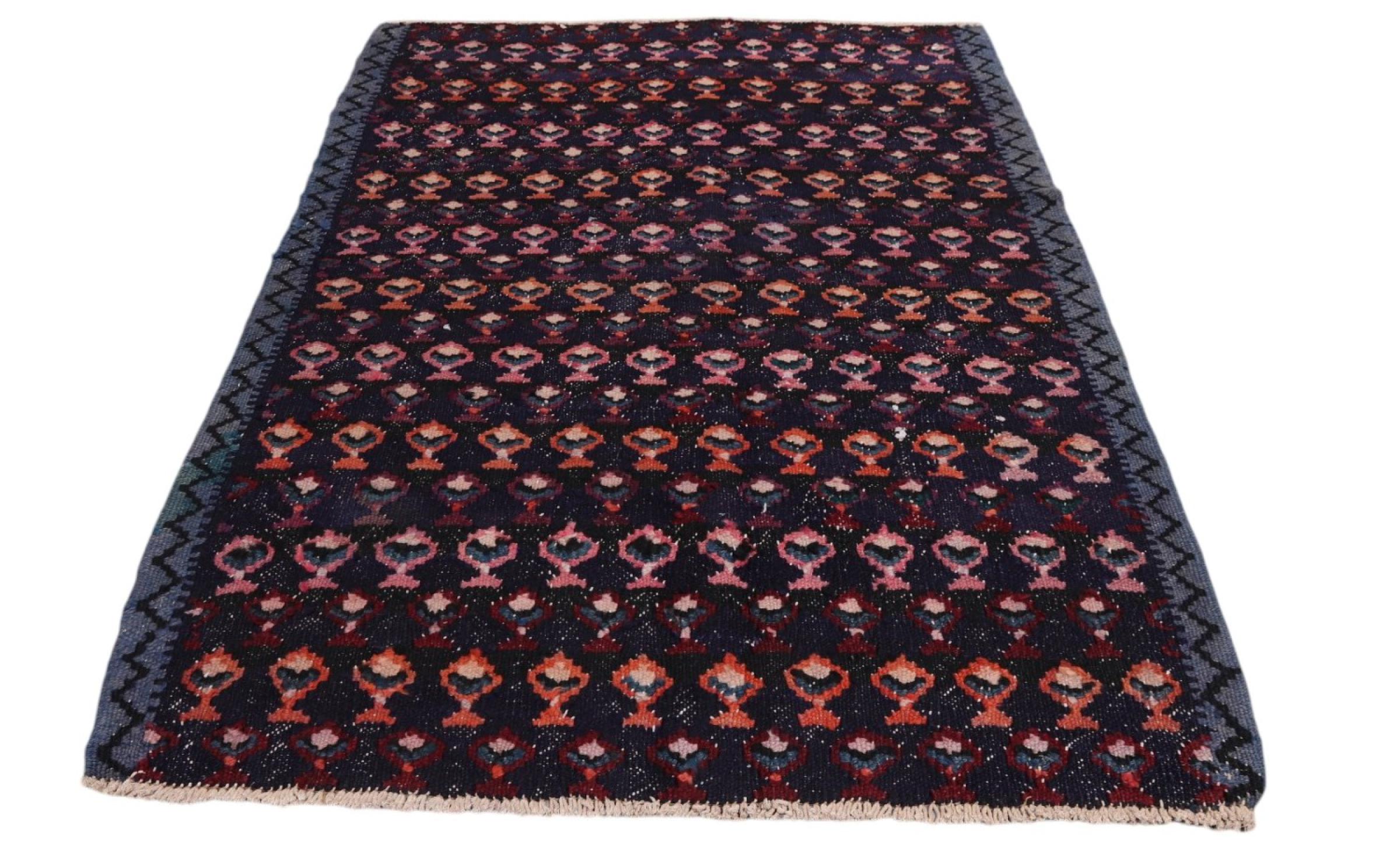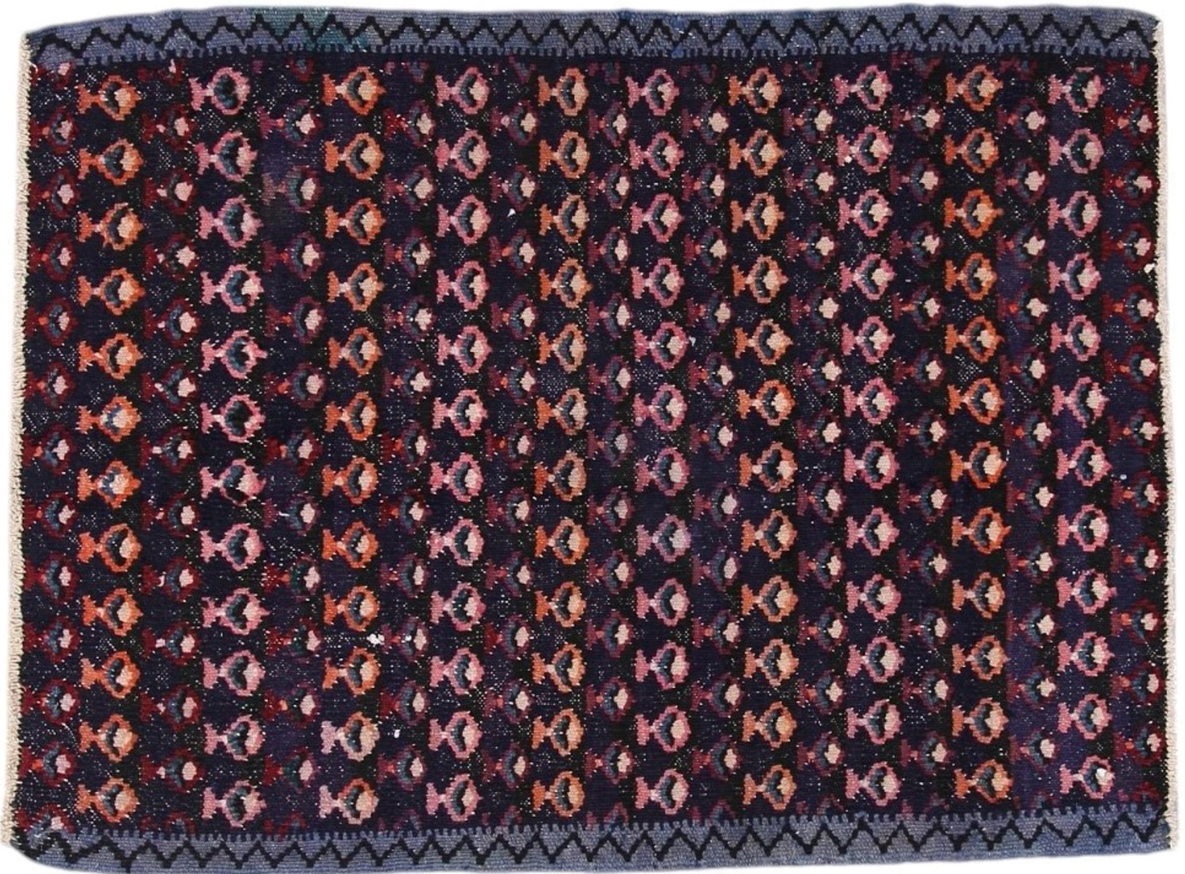 This rug was made as a flat weave by hand on a loom. Flatweave is the term used to describe rugs that have no pile. As the name promises, these rugs are woven and not knotted. This results in a flat rug with a structured surface. Flatweaves are not as soft and usually thinner than knotted rugs. At the same time they are much less complex to manufacture and can usually be laid out from both sides (front and back). Their patterns are usually geometric, which is determined by the fabric.