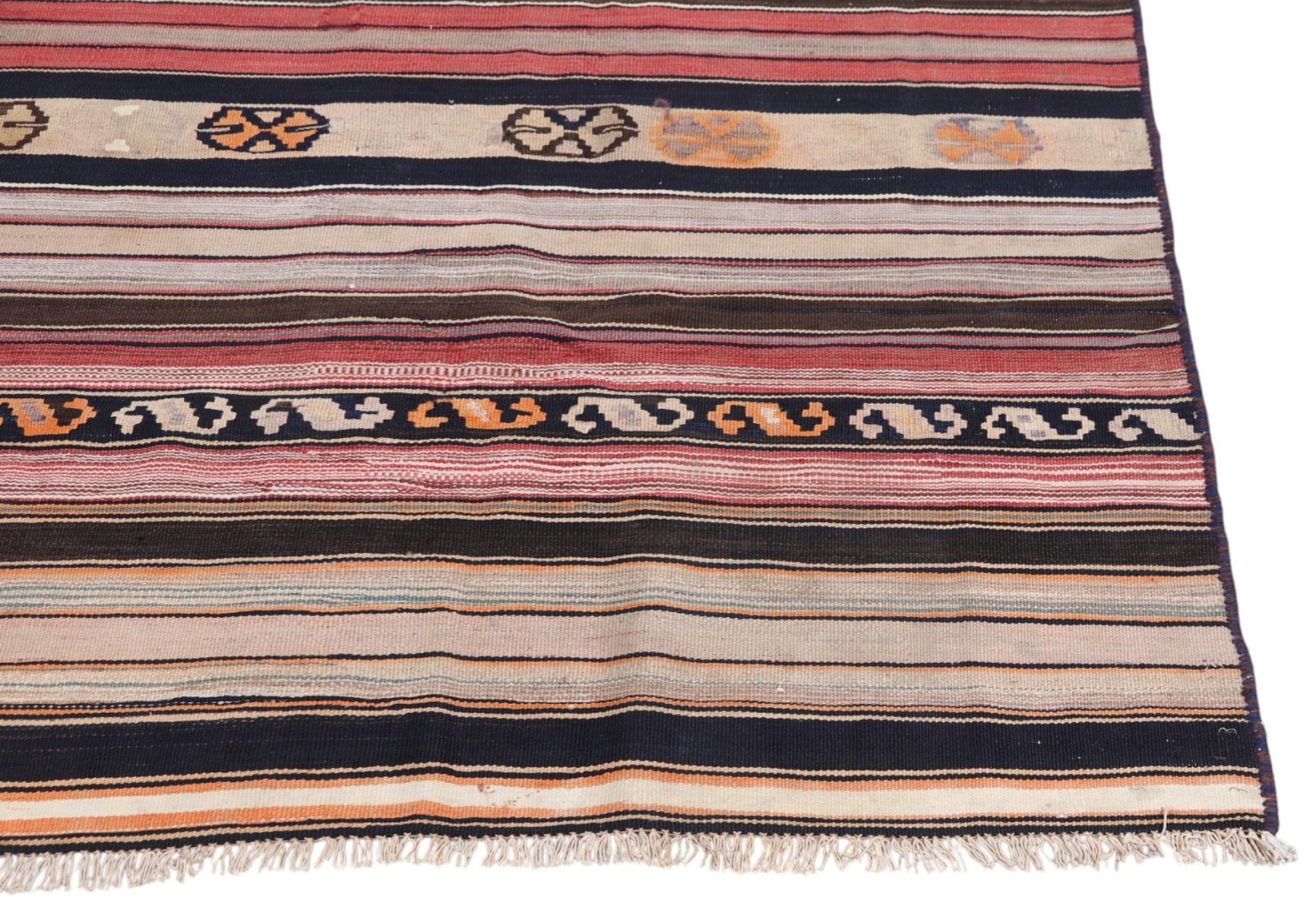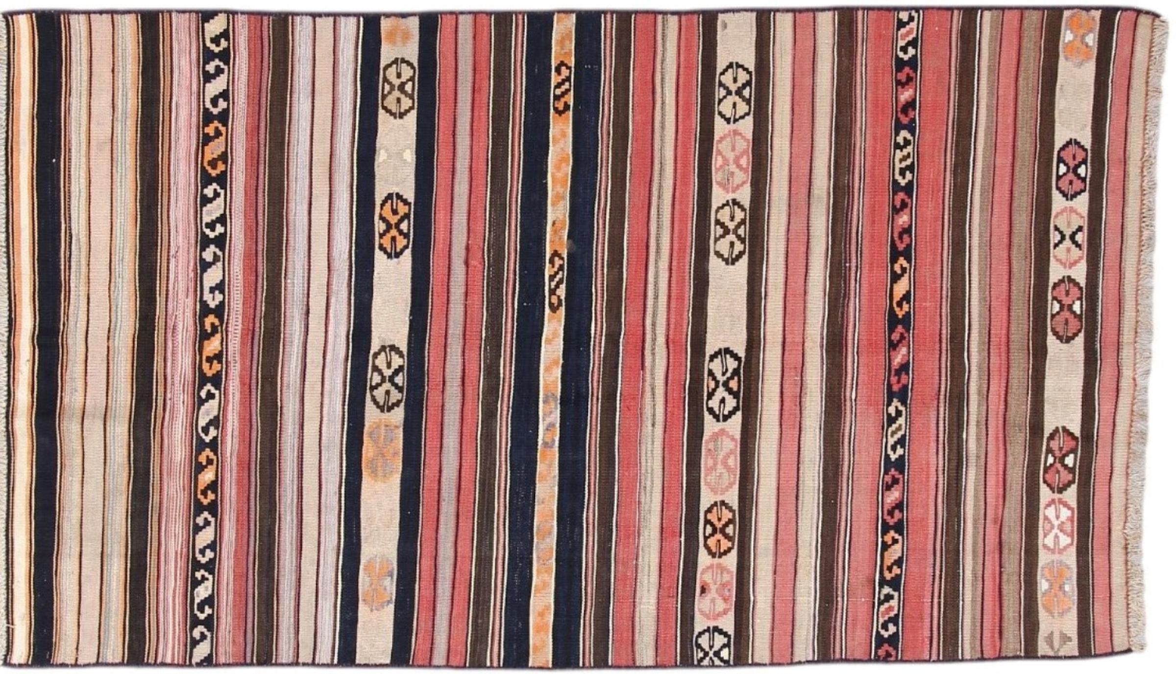 This rug was made as a flat weave by hand on a loom. Flatweave is the term used to describe rugs that have no pile. As the name promises, these rugs are woven and not knotted. This results in a flat rug with a structured surface. Flatweaves are not as soft and usually thinner than knotted rugs. At the same time they are much less complex to manufacture and can usually be laid out from both sides (front and back). Their patterns are usually geometric, which is determined by the fabric.