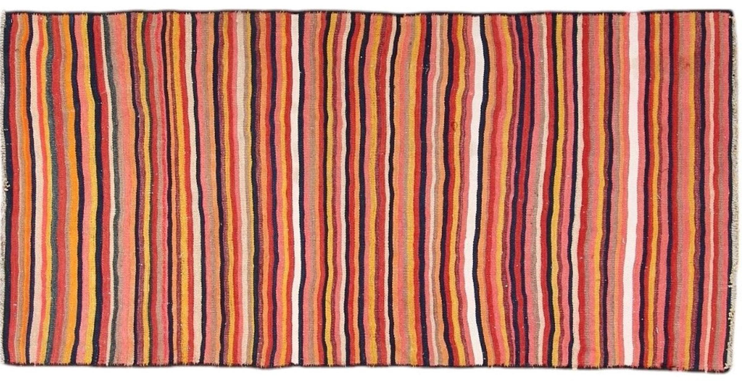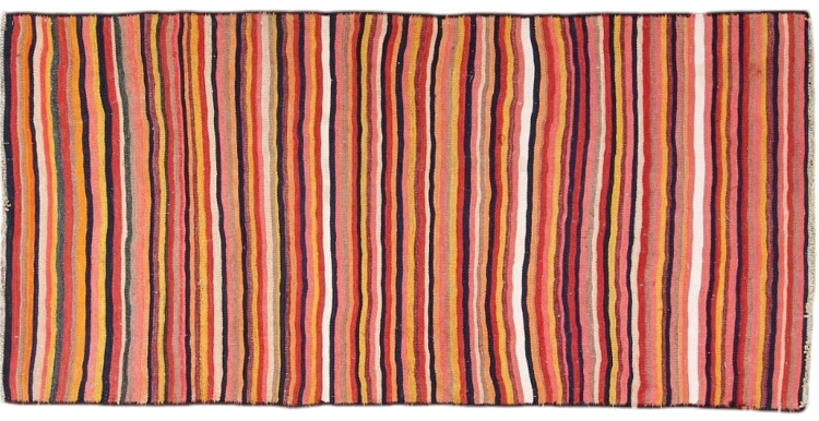 This rug was made as a flat weave by hand on a loom. Flatweave is the term used to describe rugs that have no pile. As the name promises, these rugs are woven and not knotted. This results in a flat rug with a structured surface. Flatweaves are not as soft and usually thinner than knotted rugs. At the same time they are much less complex to manufacture and can usually be laid out from both sides (front and back). Their patterns are usually geometric, which is determined by the fabric.