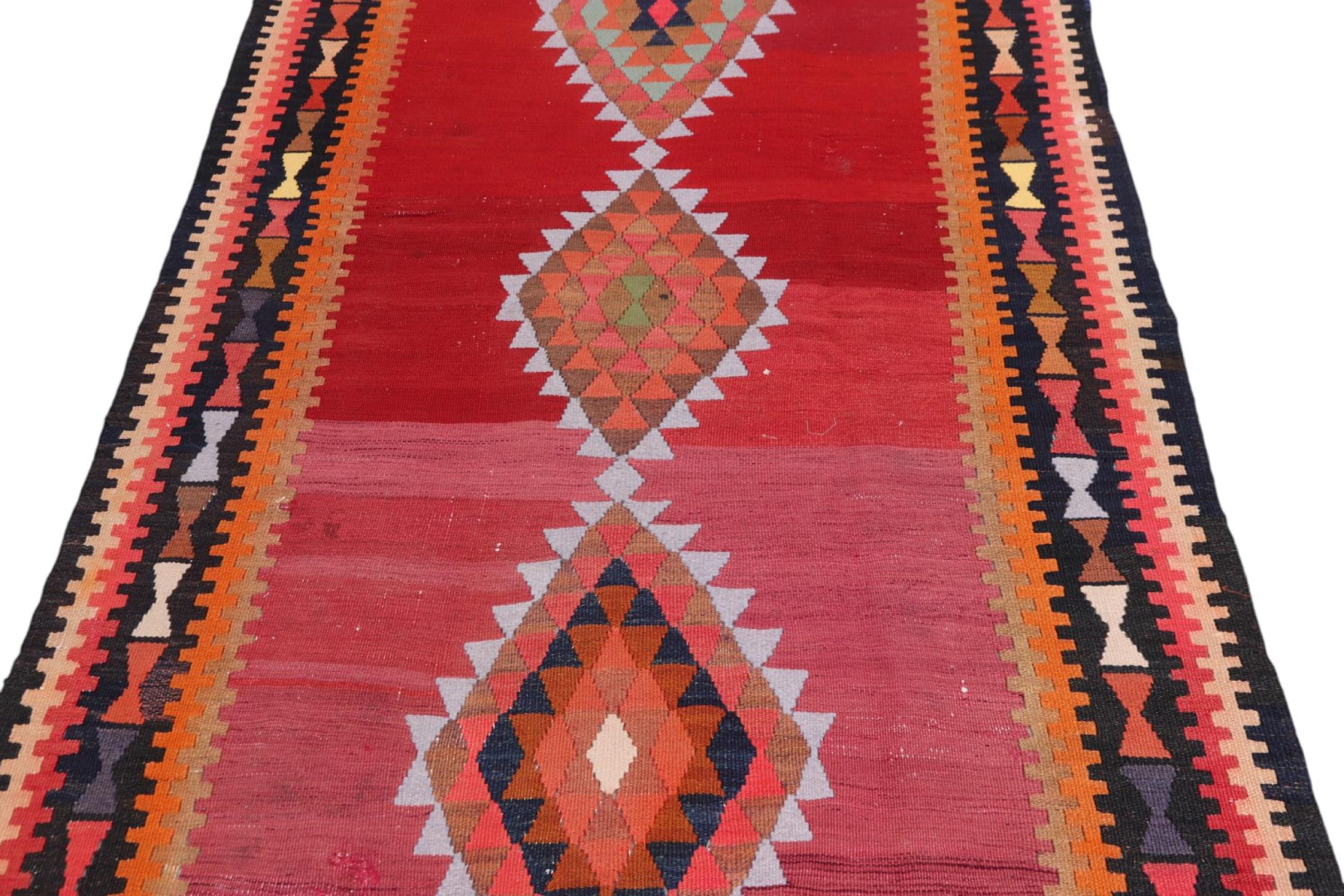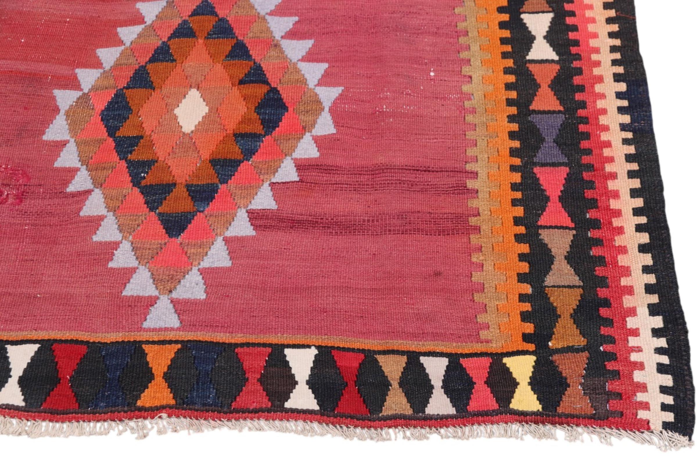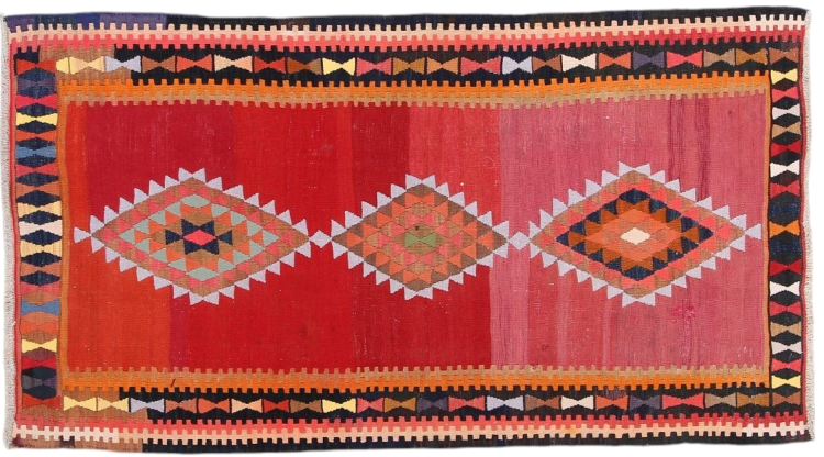 This rug was made as a flat weave by hand on a loom. Flatweave is the term used to describe rugs that have no pile. As the name promises, these rugs are woven and not knotted. This results in a flat rug with a structured surface. Flatweaves are not as soft and usually thinner than knotted rugs. At the same time they are much less complex to manufacture and can usually be laid out from both sides (front and back). Their patterns are usually geometric, which is determined by the fabric.