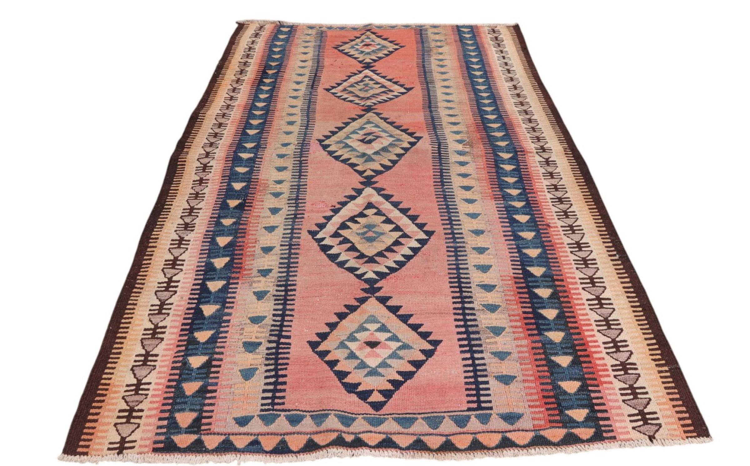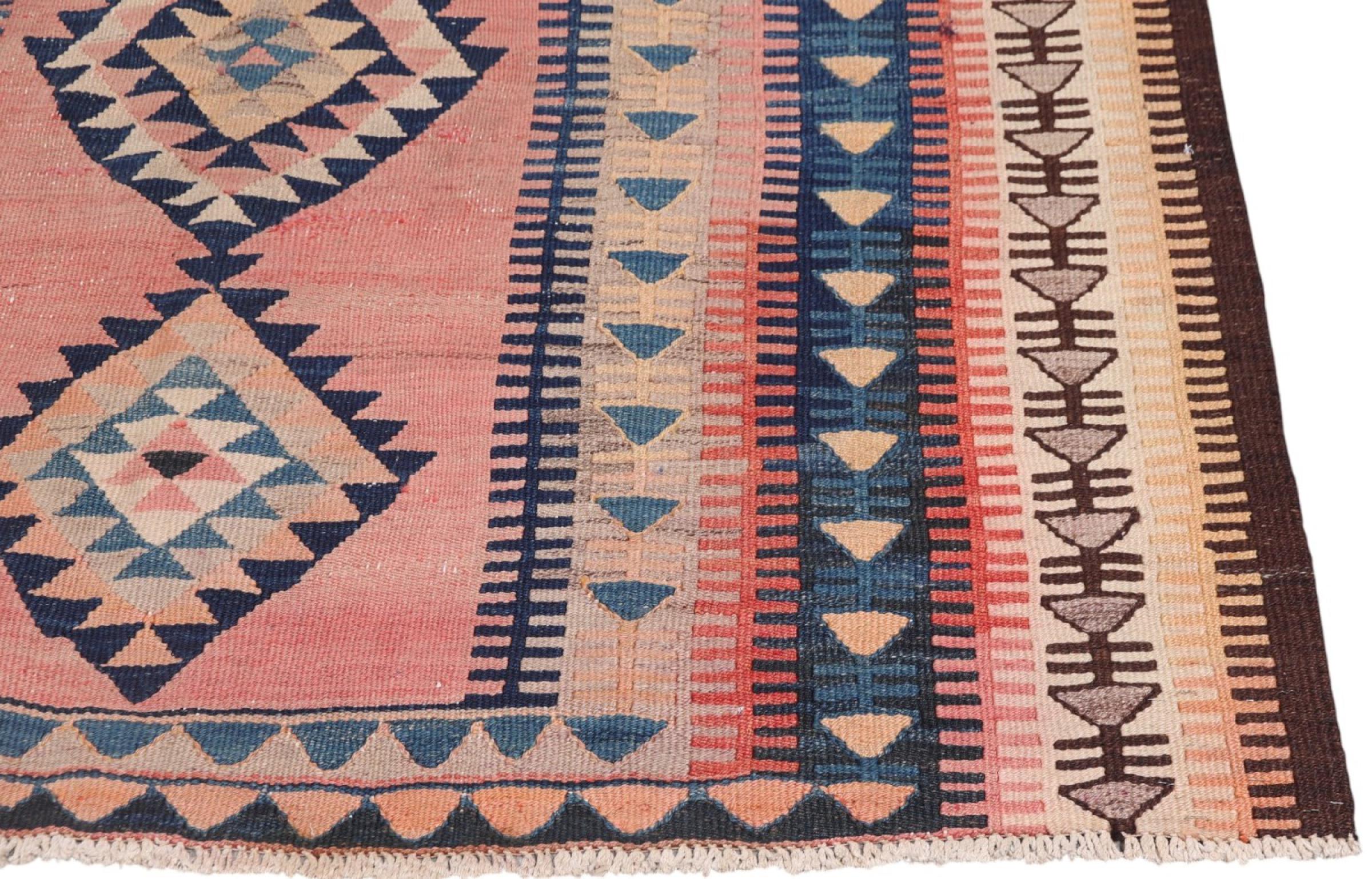 This rug was made as a flat weave by hand on a loom. Flatweave is the term used to describe rugs that have no pile. As the name promises, these rugs are woven and not knotted. This results in a flat rug with a structured surface. Flatweaves are not as soft and usually thinner than knotted rugs. At the same time they are much less complex to manufacture and can usually be laid out from both sides (front and back). Their patterns are usually geometric, which is determined by the fabric.
