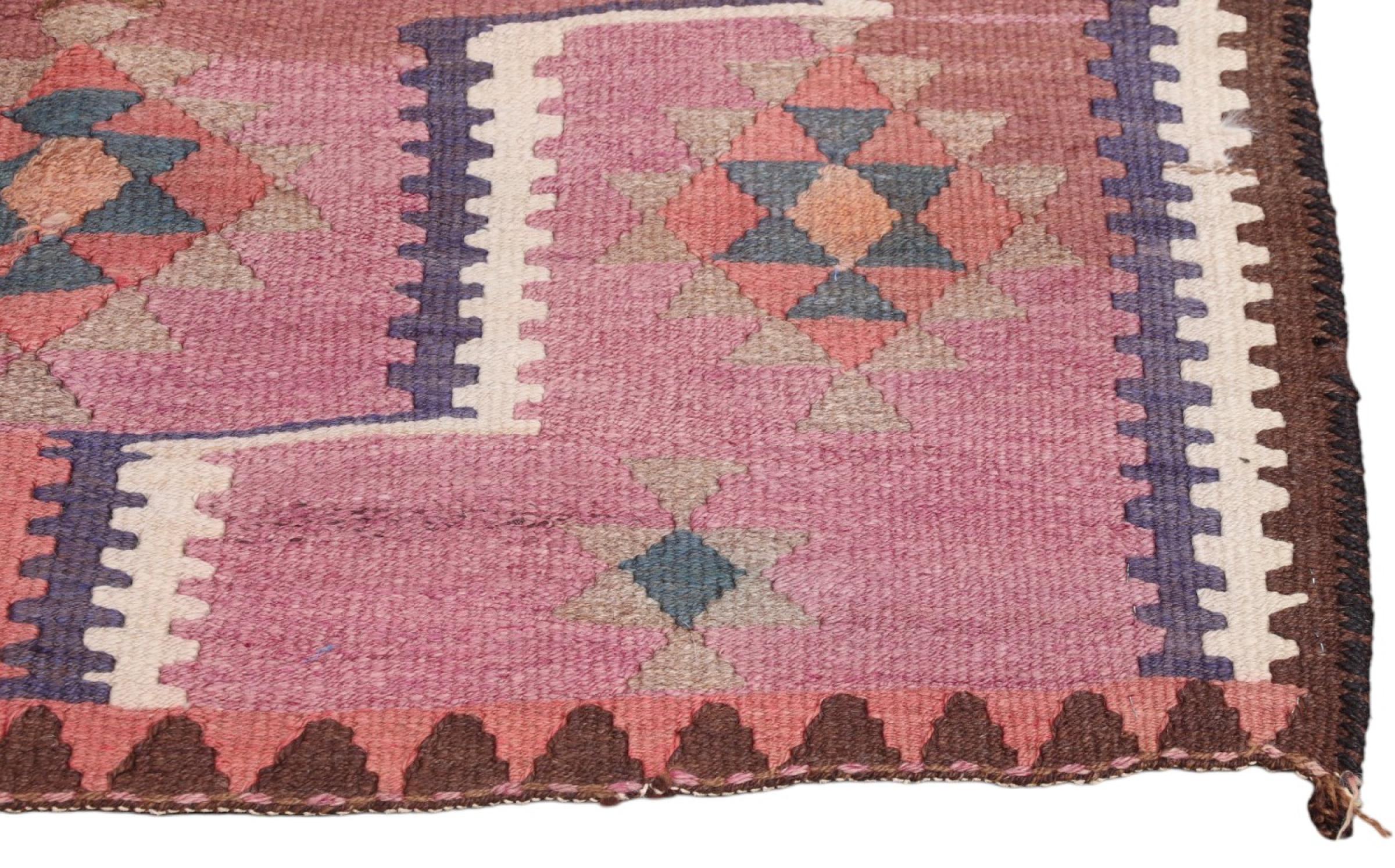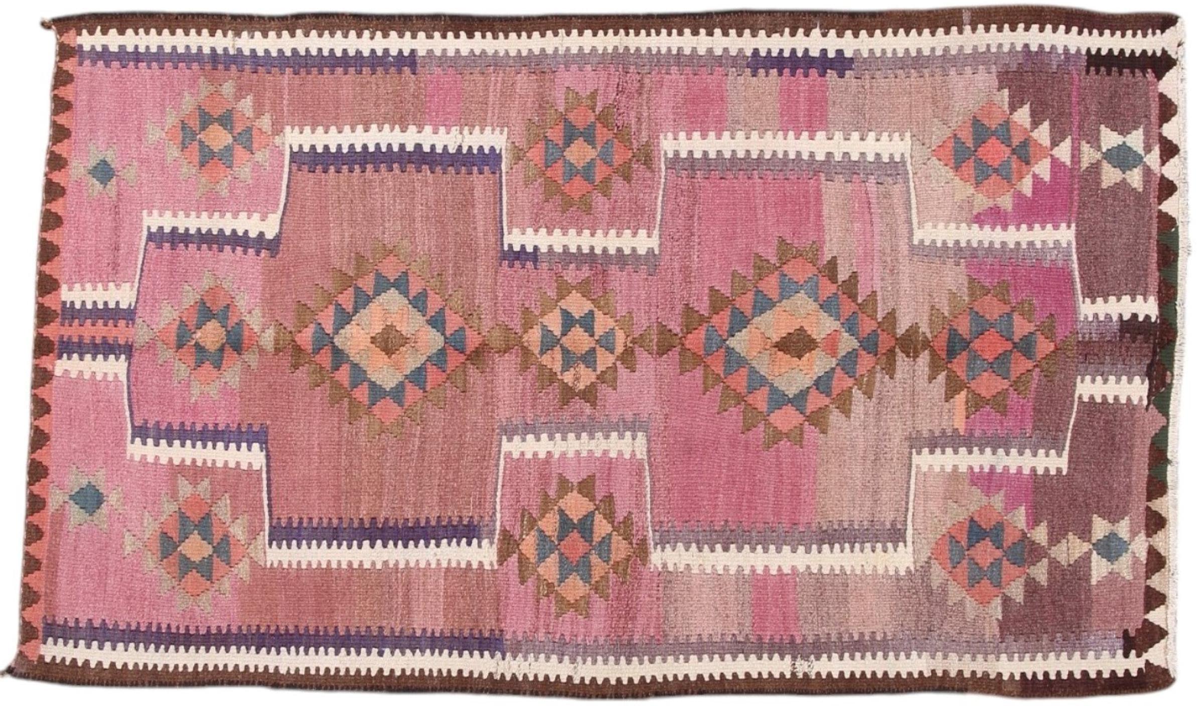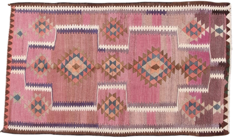 This rug was made as a flat weave by hand on a loom. Flatweave is the term used to describe rugs that have no pile. As the name promises, these rugs are woven and not knotted. This results in a flat rug with a structured surface. Flatweaves are not as soft and usually thinner than knotted rugs. At the same time they are much less complex to manufacture and can usually be laid out from both sides (front and back). Their patterns are usually geometric, which is determined by the fabric.