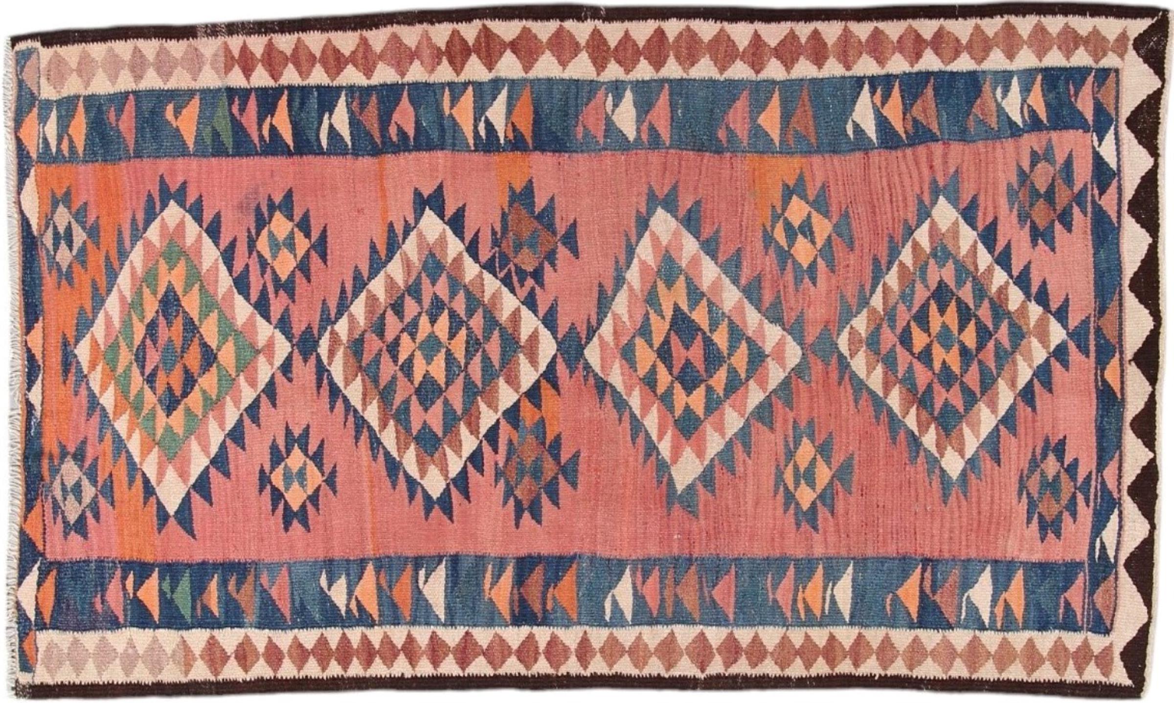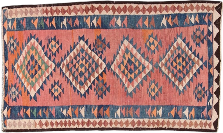 This rug was made as a flat weave by hand on a loom. Flatweave is the term used to describe rugs that have no pile. As the name promises, these rugs are woven and not knotted. This results in a flat rug with a structured surface. Flatweaves are not as soft and usually thinner than knotted rugs. At the same time they are much less complex to manufacture and can usually be laid out from both sides (front and back). Their patterns are usually geometric, which is determined by the fabric.