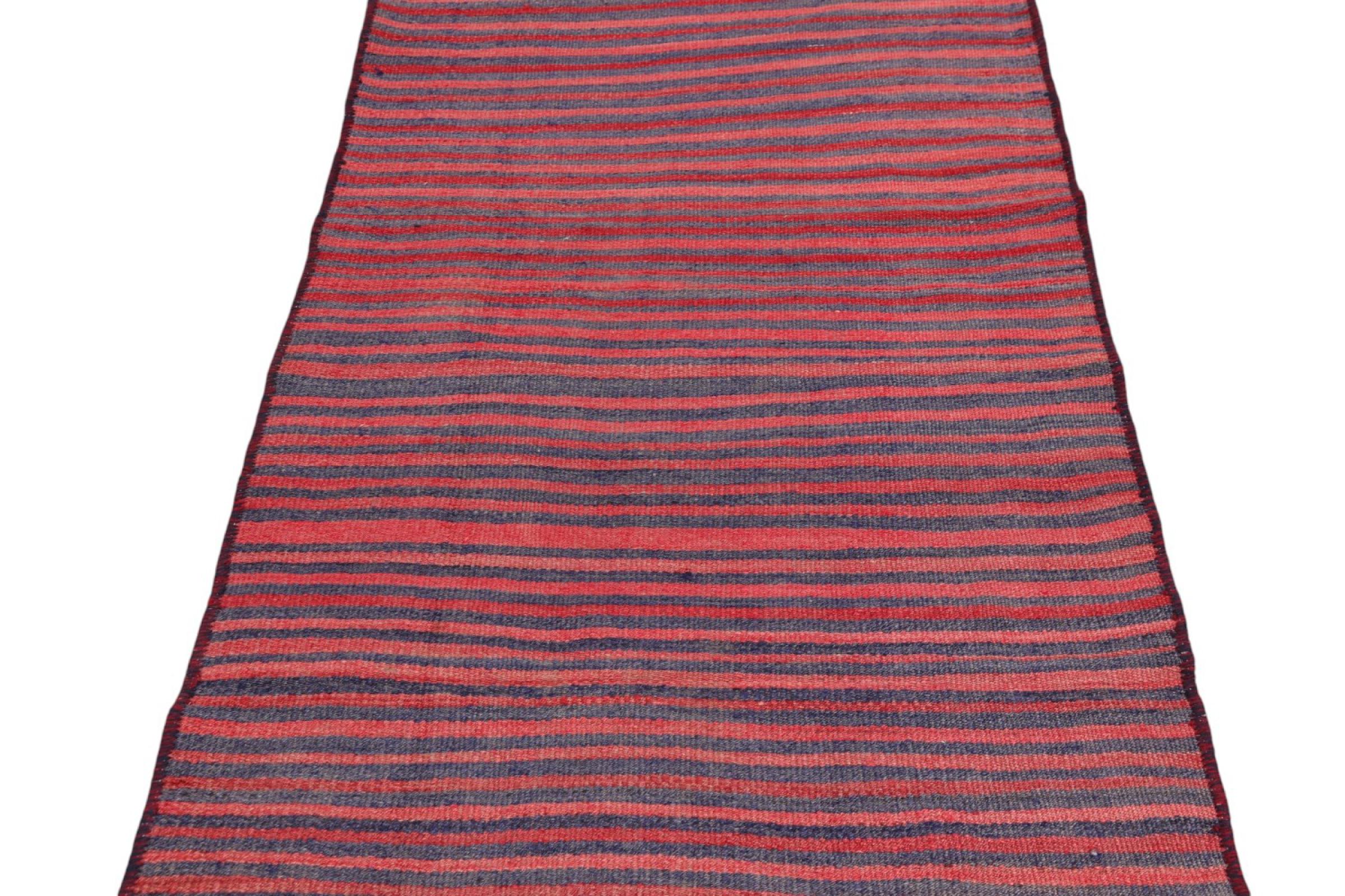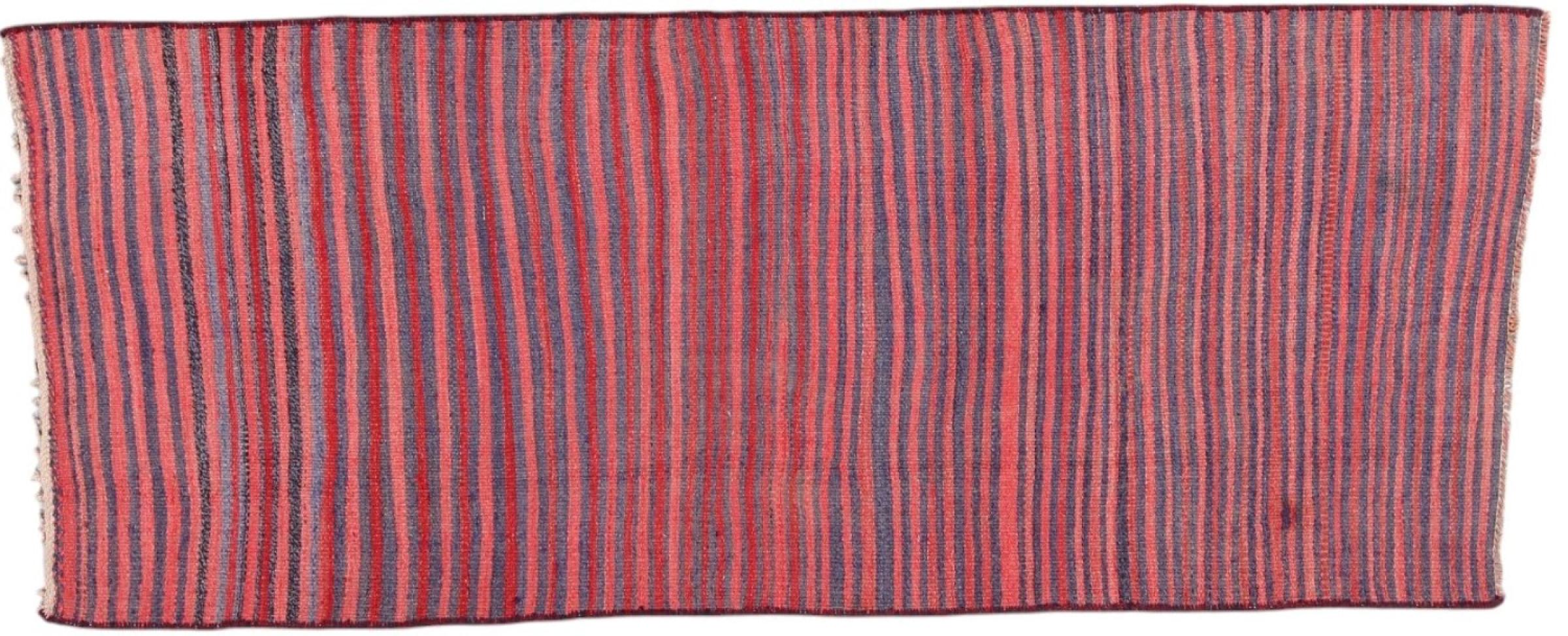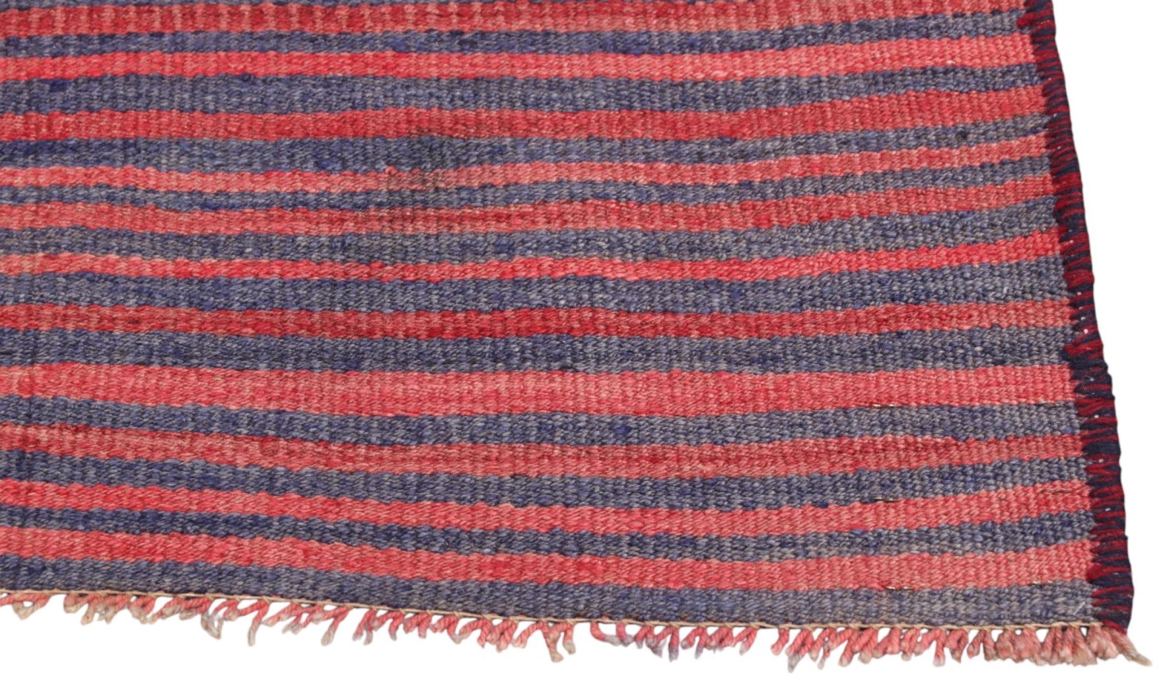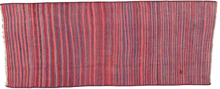 This rug was made as a flat weave by hand on a loom. Flatweave is the term used to describe rugs that have no pile. As the name promises, these rugs are woven and not knotted. This results in a flat rug with a structured surface. Flatweaves are not as soft and usually thinner than knotted rugs. At the same time they are much less complex to manufacture and can usually be laid out from both sides (front and back). Their patterns are usually geometric, which is determined by the fabric.