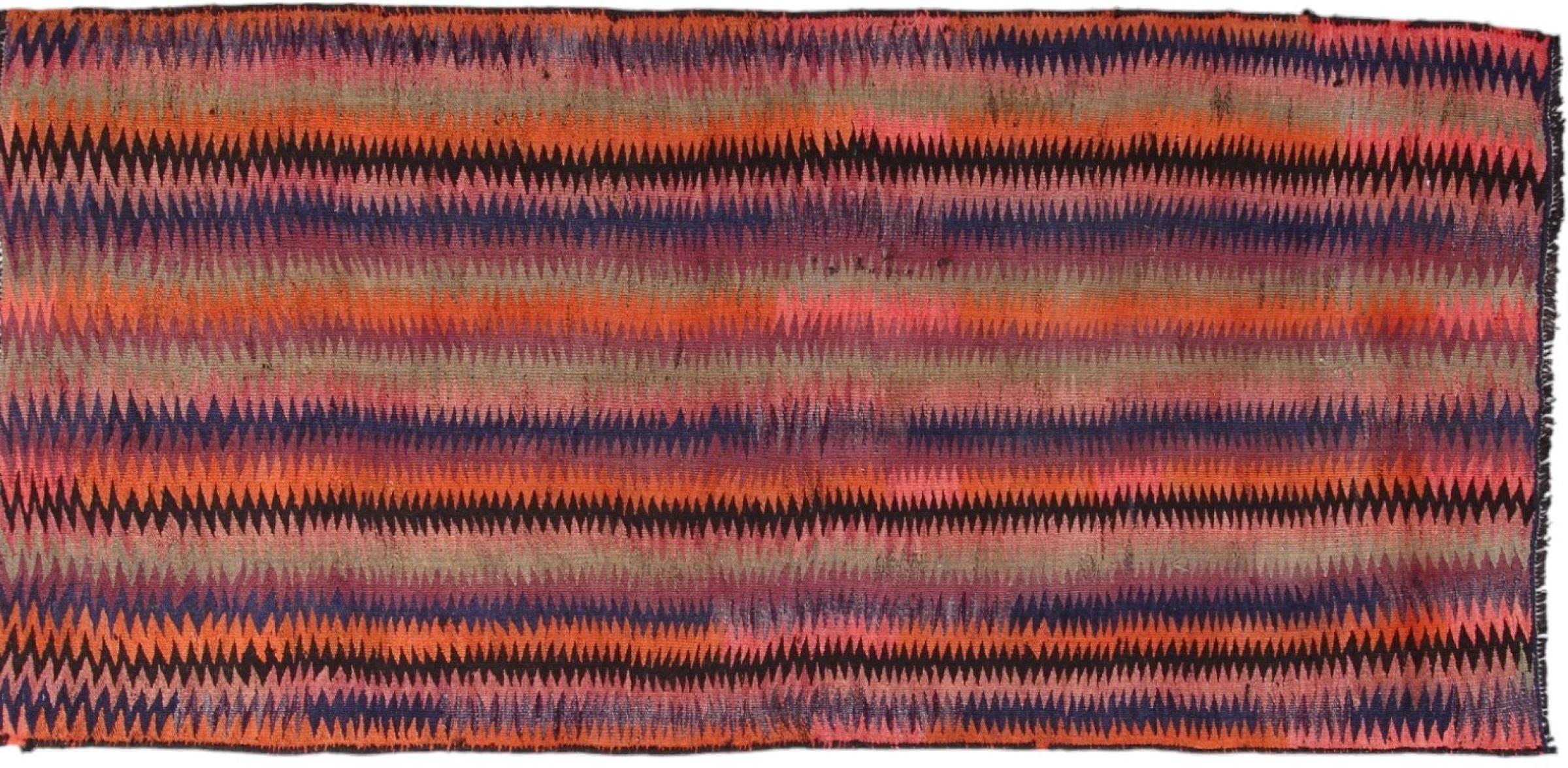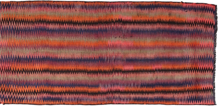 This rug was made as a flat weave by hand on a loom. Flatweave is the term used to describe rugs that have no pile. As the name promises, these rugs are woven and not knotted. This results in a flat rug with a structured surface. Flatweaves are not as soft and usually thinner than knotted rugs. At the same time they are much less complex to manufacture and can usually be laid out from both sides (front and back). Their patterns are usually geometric, which is determined by the fabric.