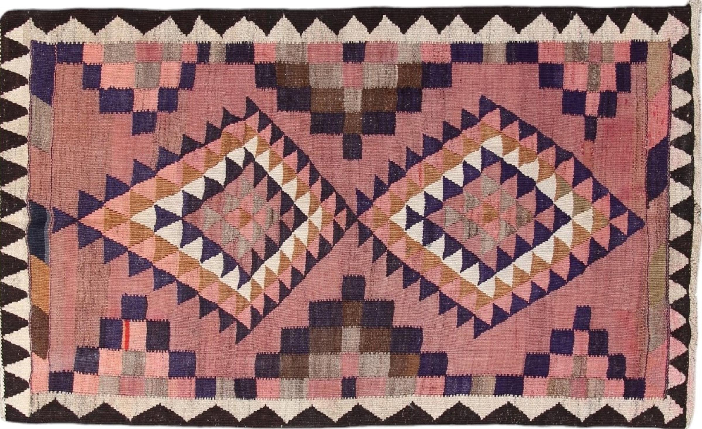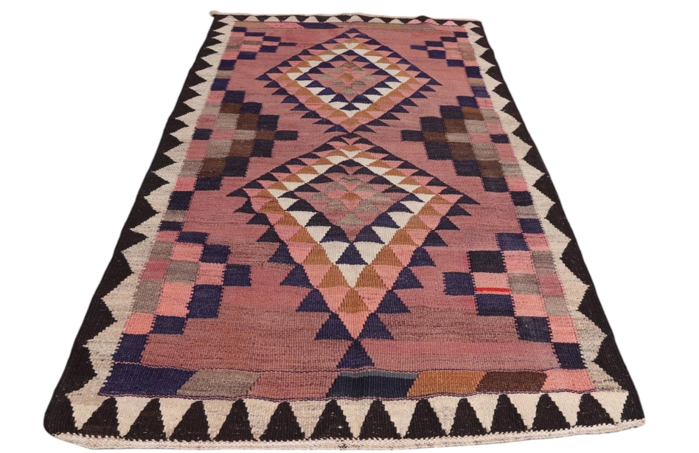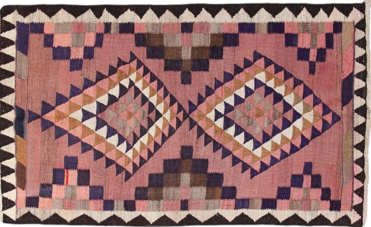 This rug was made as a flat weave by hand on a loom. Flatweave is the term used to describe rugs that have no pile. As the name promises, these rugs are woven and not knotted. This results in a flat rug with a structured surface. Flatweaves are not as soft and usually thinner than knotted rugs. At the same time they are much less complex to manufacture and can usually be laid out from both sides (front and back). Their patterns are usually geometric, which is determined by the fabric.