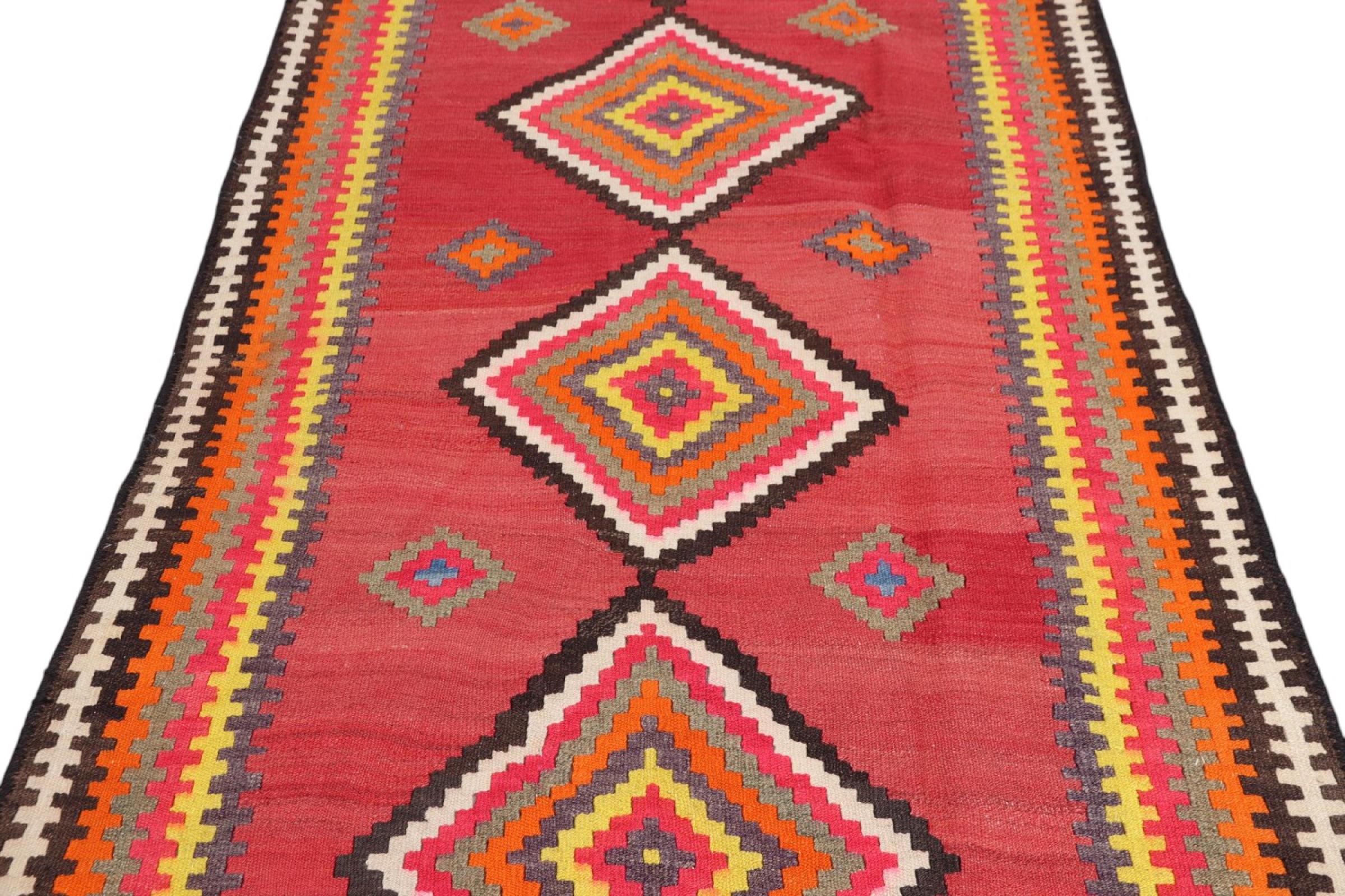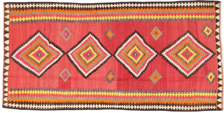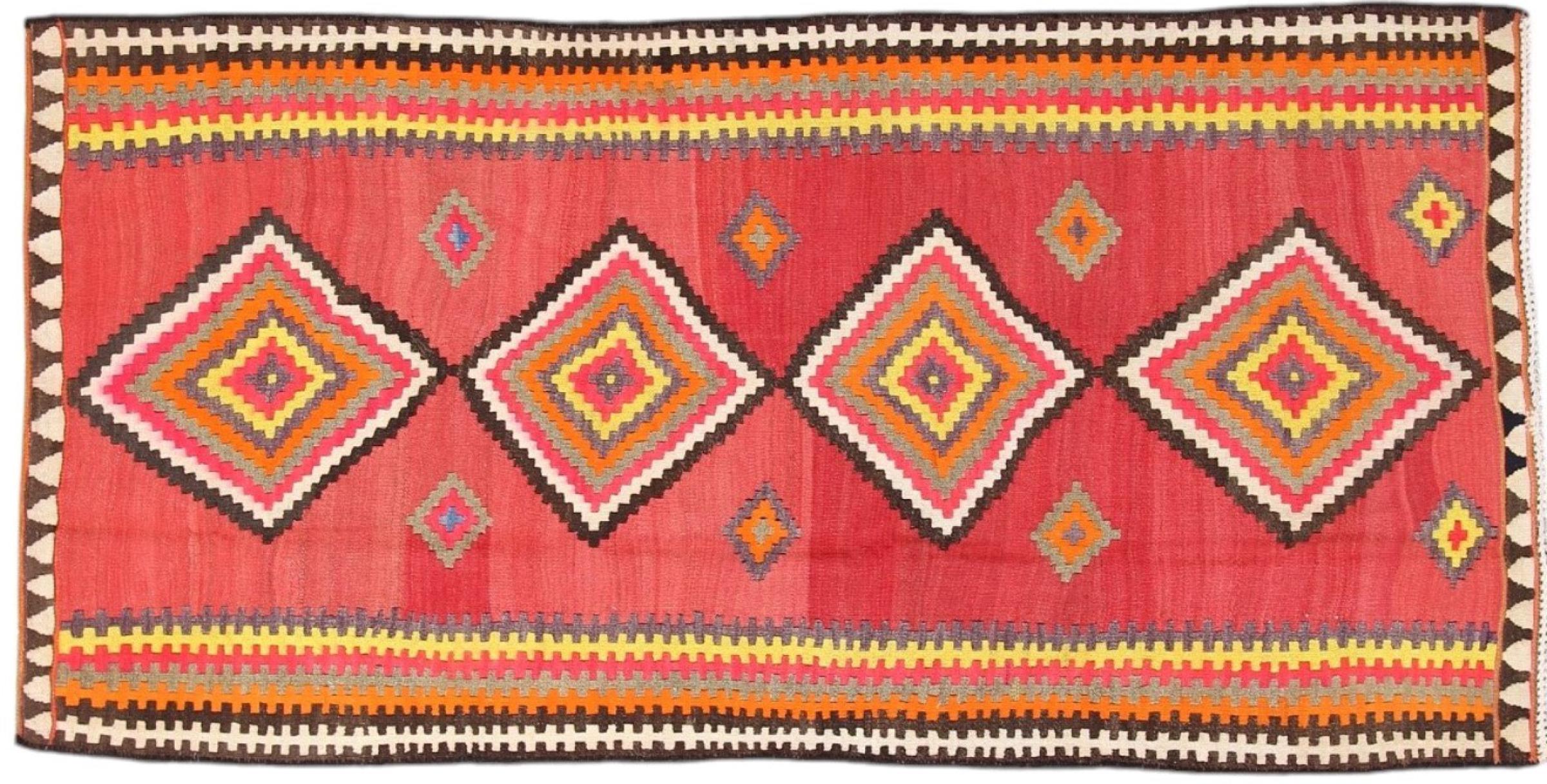 This rug was made as a flat weave by hand on a loom. Flatweave is the term used to describe rugs that have no pile. As the name promises, these rugs are woven and not knotted. This results in a flat rug with a structured surface. Flatweaves are not as soft and usually thinner than knotted rugs. At the same time they are much less complex to manufacture and can usually be laid out from both sides (front and back). Their patterns are usually geometric, which is determined by the fabric.