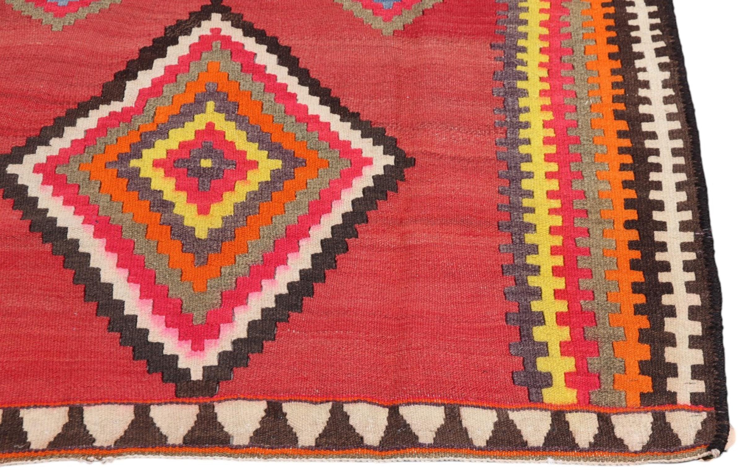 This handwoven Kilim Fars combines Persian patterns with the old tradition of flat fabrics. It represents a beautiful composition of contemporary Persian elements and a modern style. Due to the carpet's geometric patterns and its warm colours, this type of rug is extremely popular in modern interior magazines. Additionally, this Kilim can be used in many different ways. Whether you would like to use it as a bed cover or as a carpet in front of your sofa – a Kilim Fars fulfils nearly all wishes.