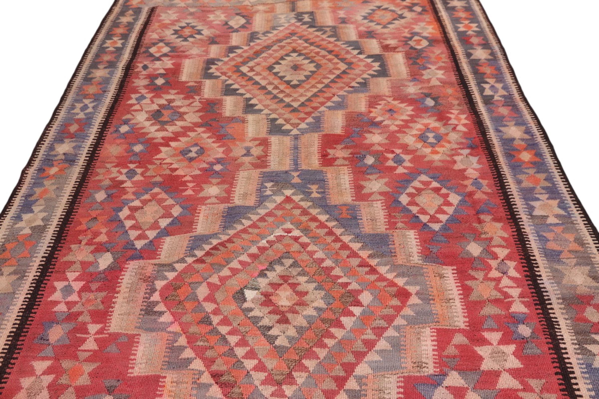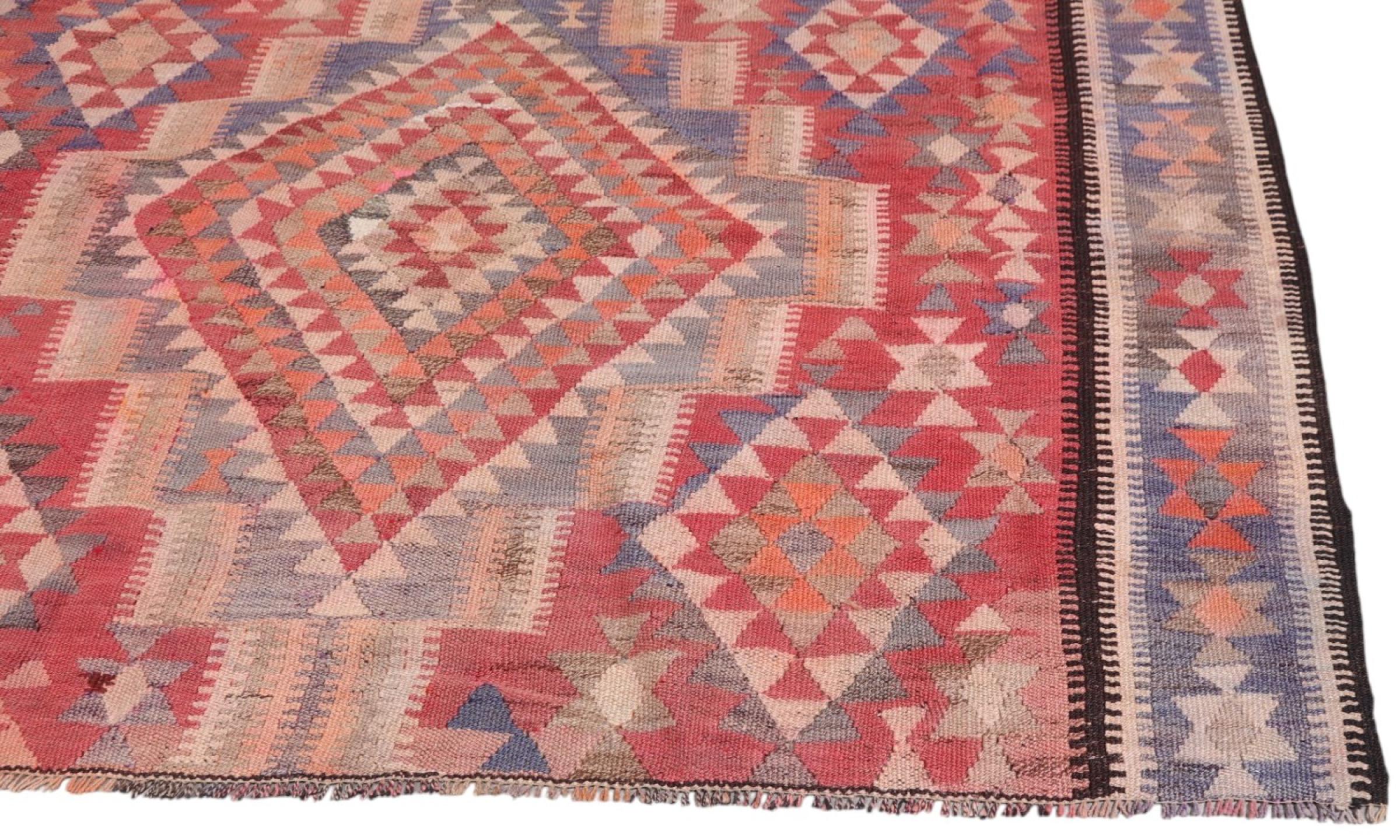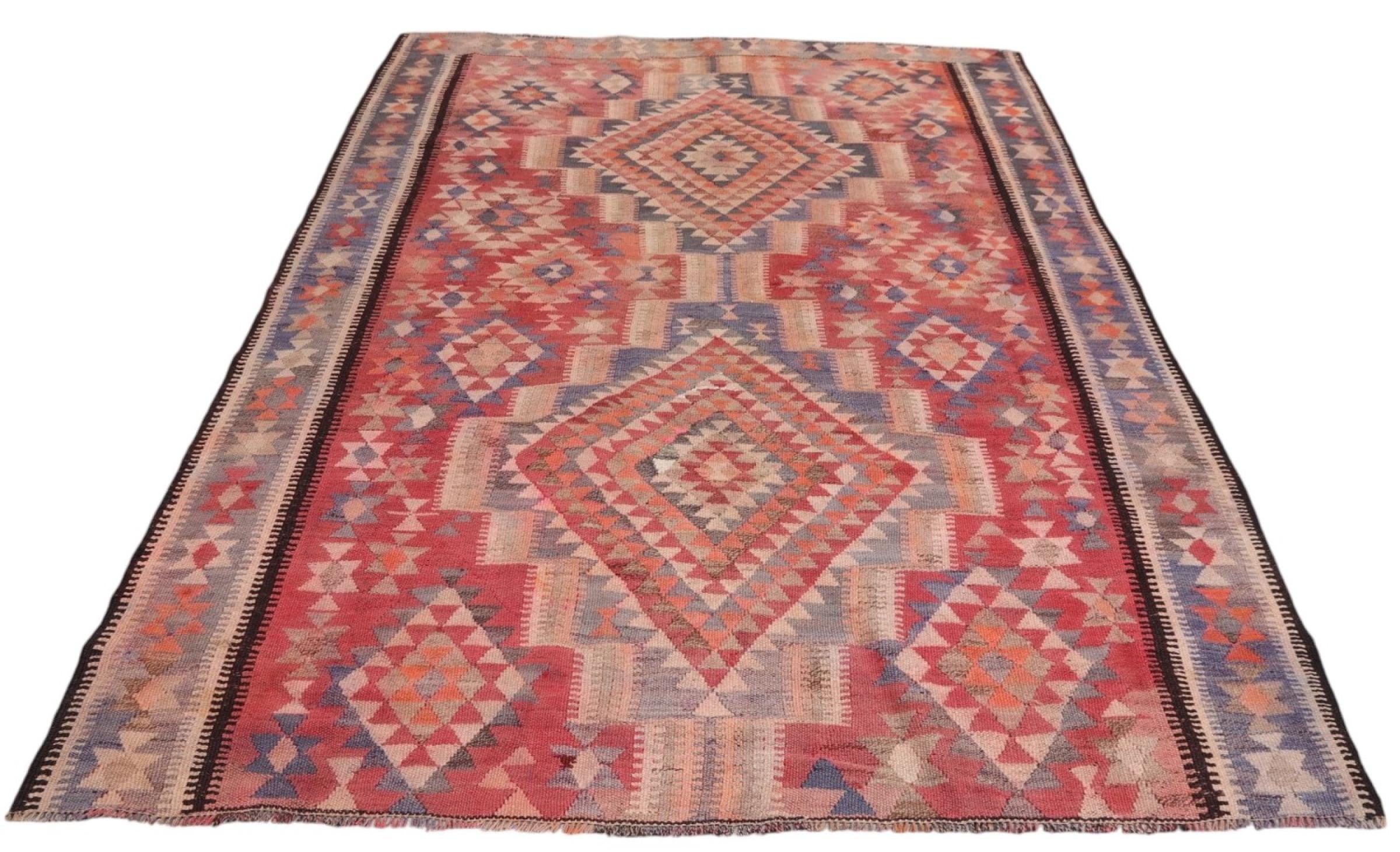 This rug was made as a flat weave by hand on a loom. Flatweave is the term used to describe rugs that have no pile. As the name promises, these rugs are woven and not knotted. This results in a flat rug with a structured surface. Flatweaves are not as soft and usually thinner than knotted rugs. At the same time they are much less complex to manufacture and can usually be laid out from both sides (front and back). Their patterns are usually geometric, which is determined by the fabric.