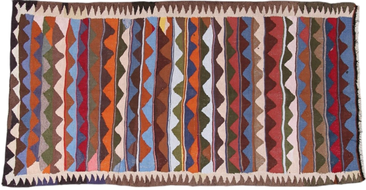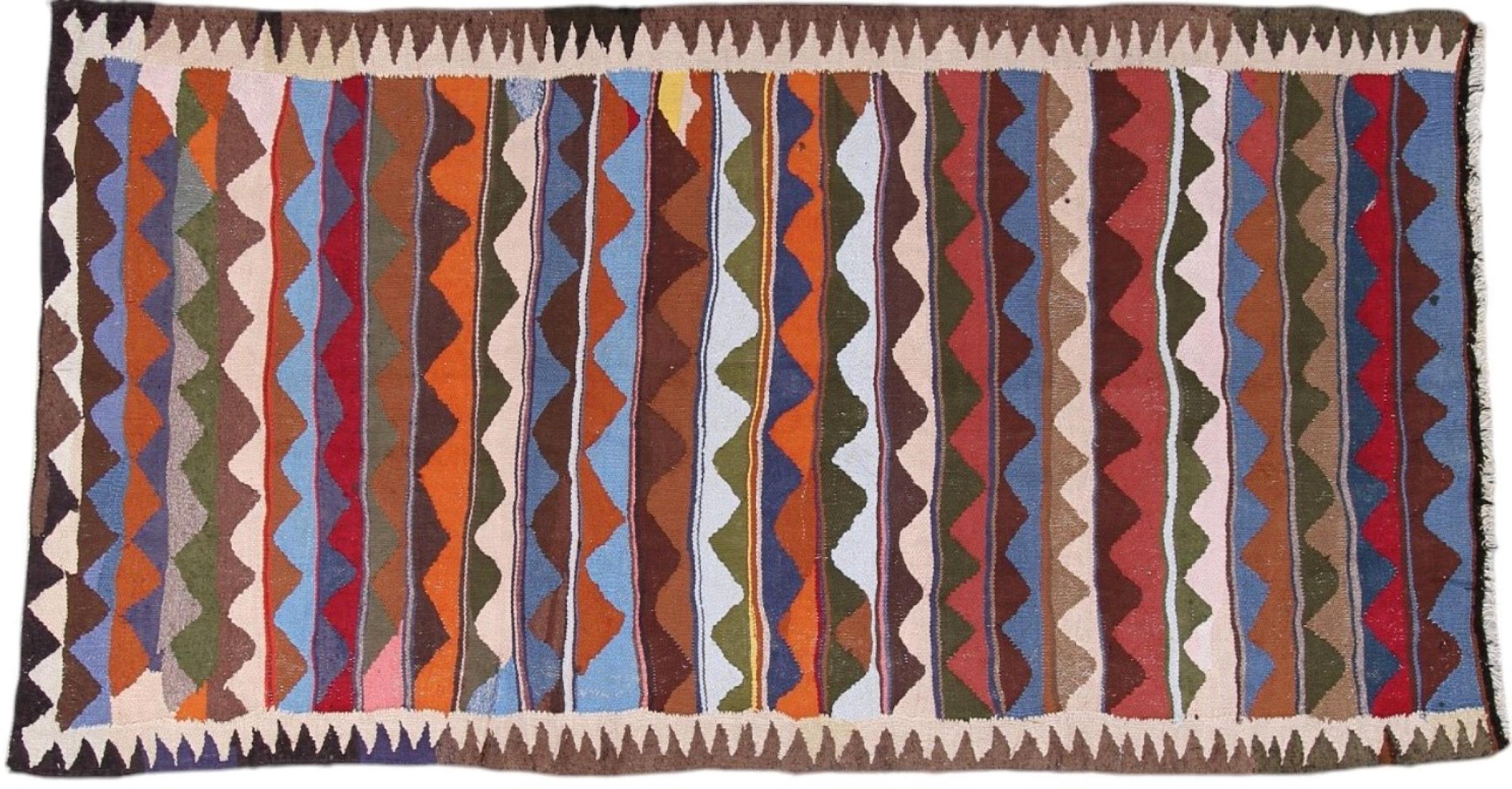 This rug was made as a flat weave by hand on a loom. Flatweave is the term used to describe rugs that have no pile. As the name promises, these rugs are woven and not knotted. This results in a flat rug with a structured surface. Flatweaves are not as soft and usually thinner than knotted rugs. At the same time they are much less complex to manufacture and can usually be laid out from both sides (front and back). Their patterns are usually geometric, which is determined by the fabric.