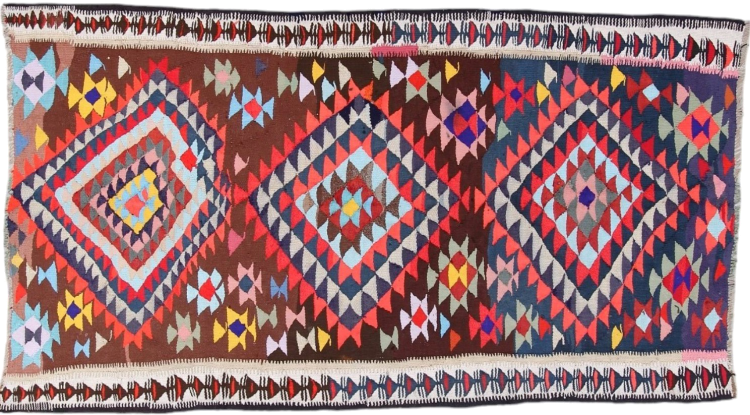 This rug was made as a flat weave by hand on a loom. Flatweave is the term used to describe rugs that have no pile. As the name promises, these rugs are woven and not knotted. This results in a flat rug with a structured surface. Flatweaves are not as soft and usually thinner than knotted rugs. At the same time they are much less complex to manufacture and can usually be laid out from both sides (front and back). Their patterns are usually geometric, which is determined by the fabric.