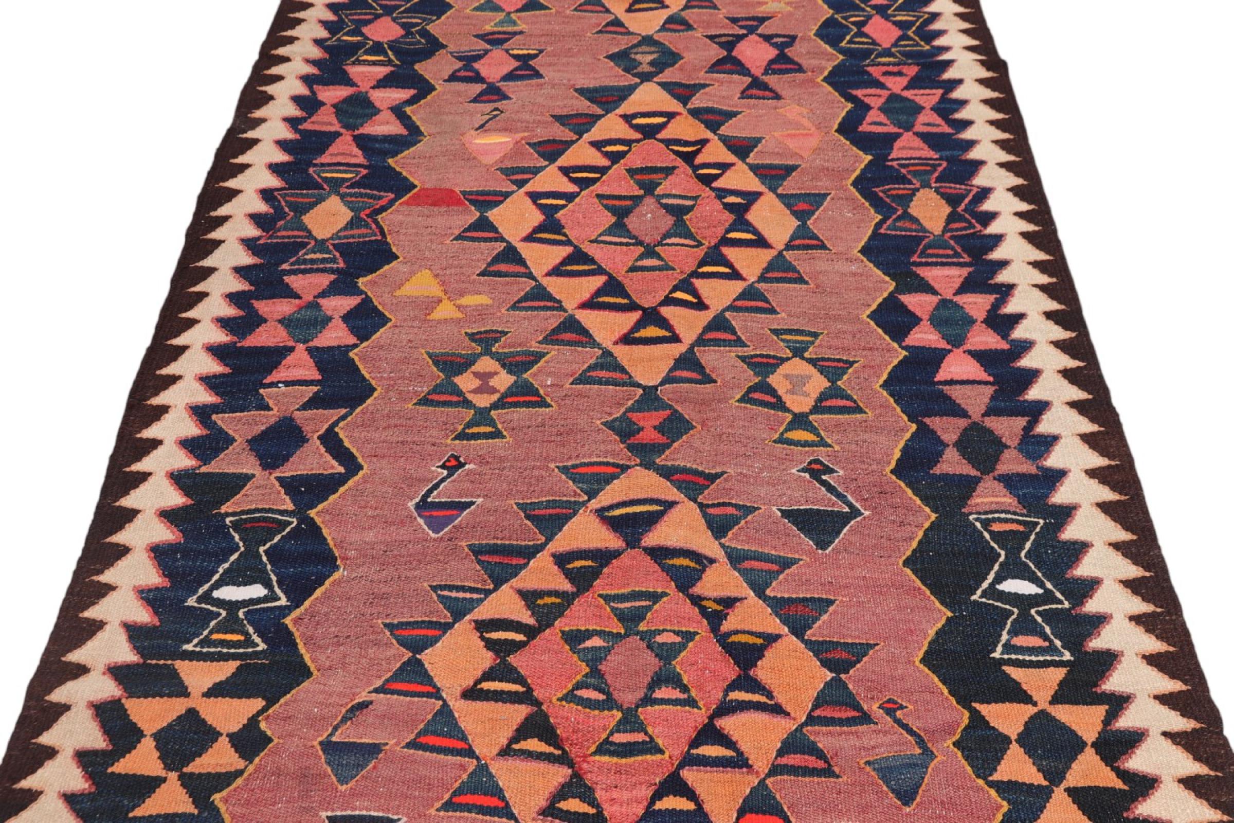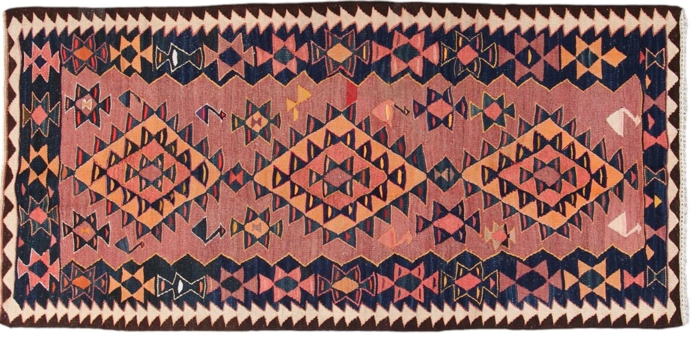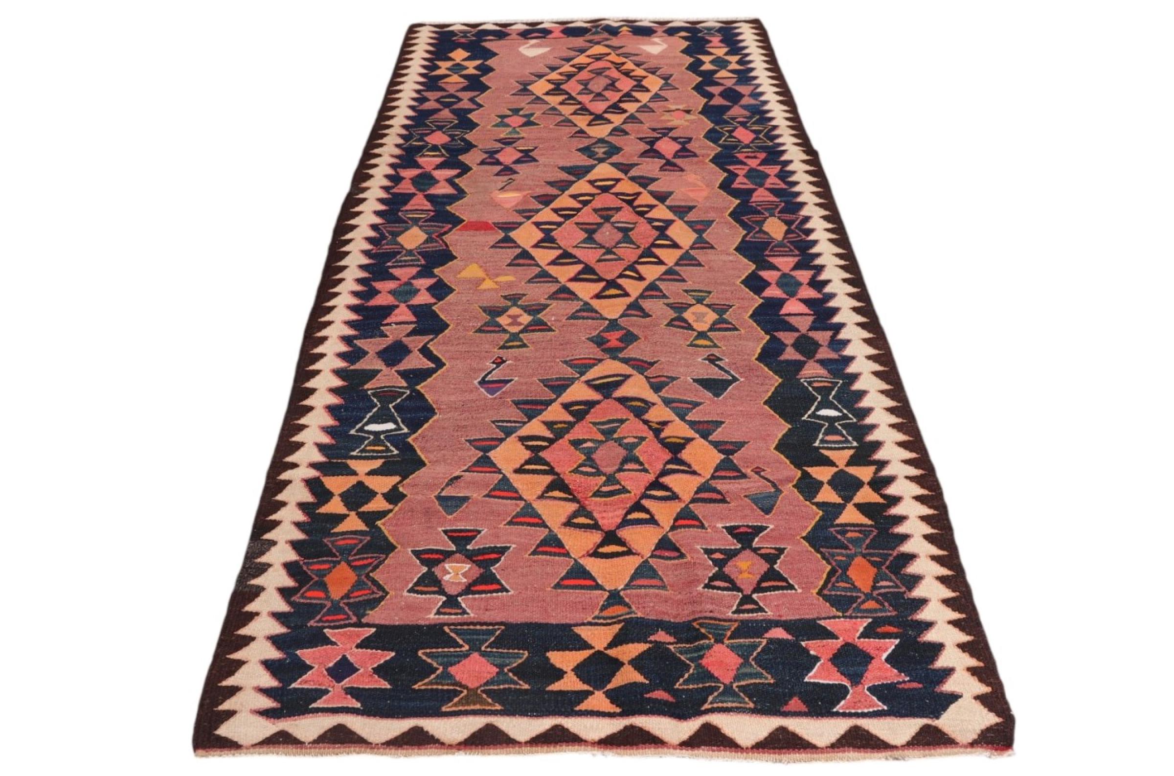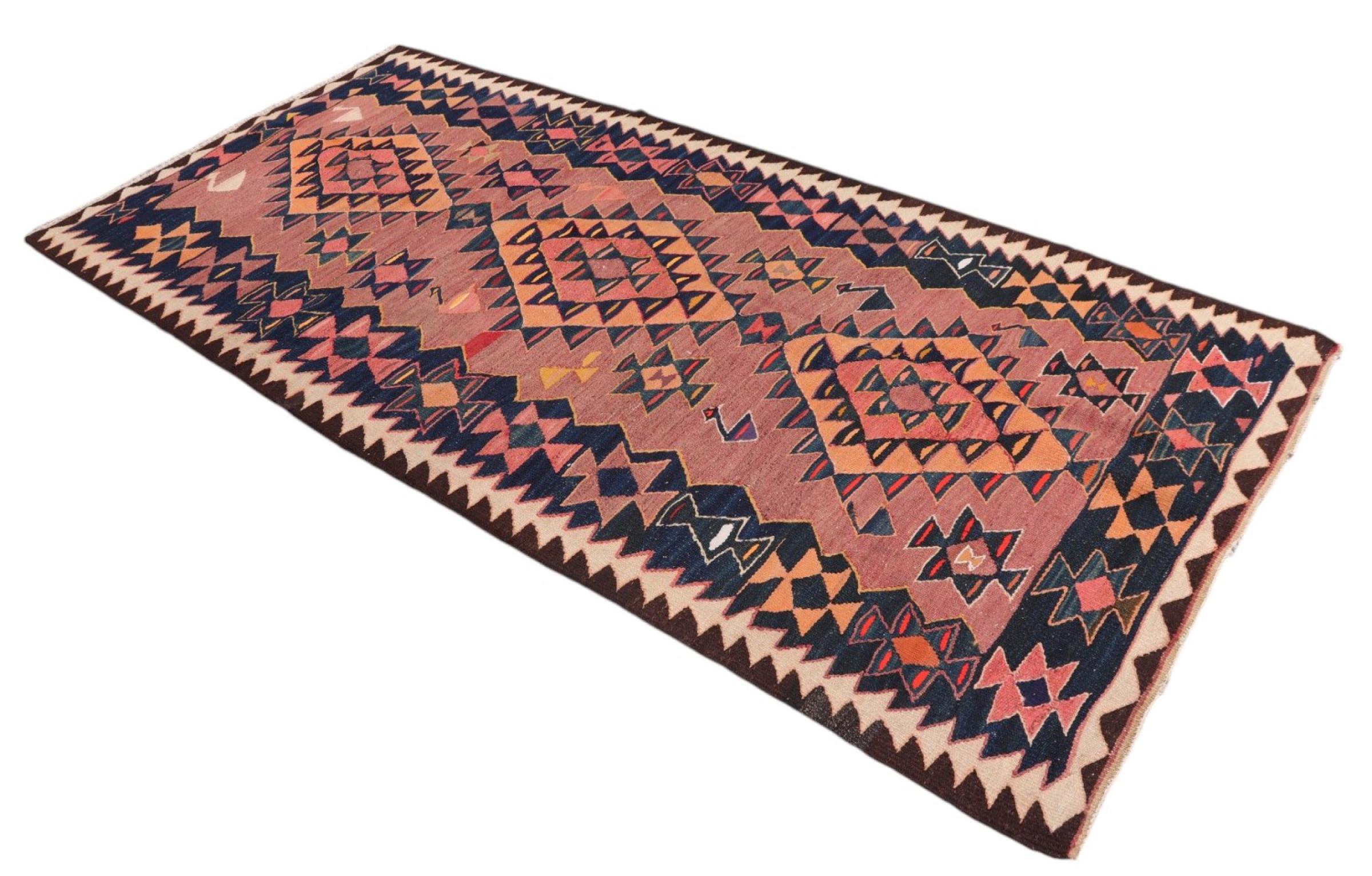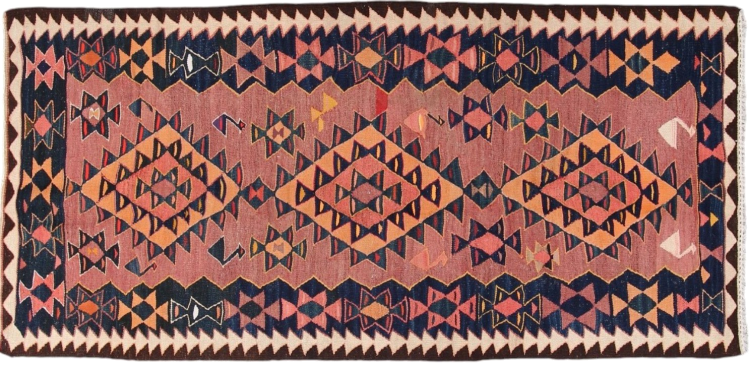 This rug was made as a flat weave by hand on a loom. Flatweave is the term used to describe rugs that have no pile. As the name promises, these rugs are woven and not knotted. This results in a flat rug with a structured surface. Flatweaves are not as soft and usually thinner than knotted rugs. At the same time they are much less complex to manufacture and can usually be laid out from both sides (front and back). Their patterns are usually geometric, which is determined by the fabric.