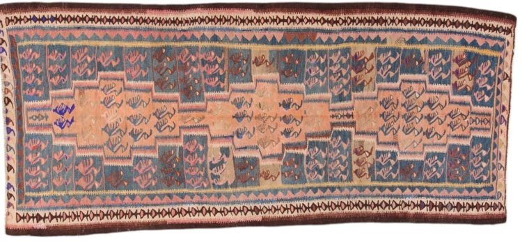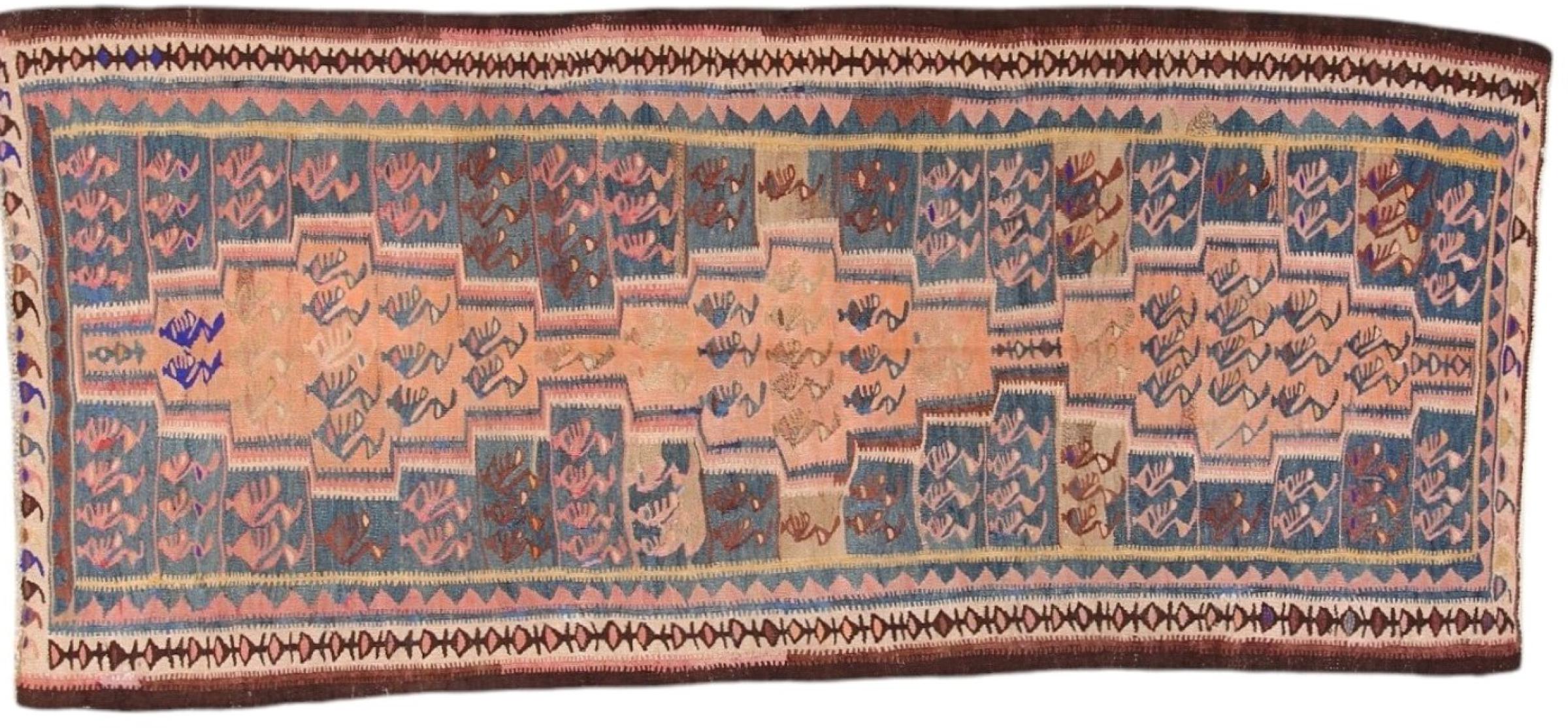 This rug was made as a flat weave by hand on a loom. Flatweave is the term used to describe rugs that have no pile. As the name promises, these rugs are woven and not knotted. This results in a flat rug with a structured surface. Flatweaves are not as soft and usually thinner than knotted rugs. At the same time they are much less complex to manufacture and can usually be laid out from both sides (front and back). Their patterns are usually geometric, which is determined by the fabric.