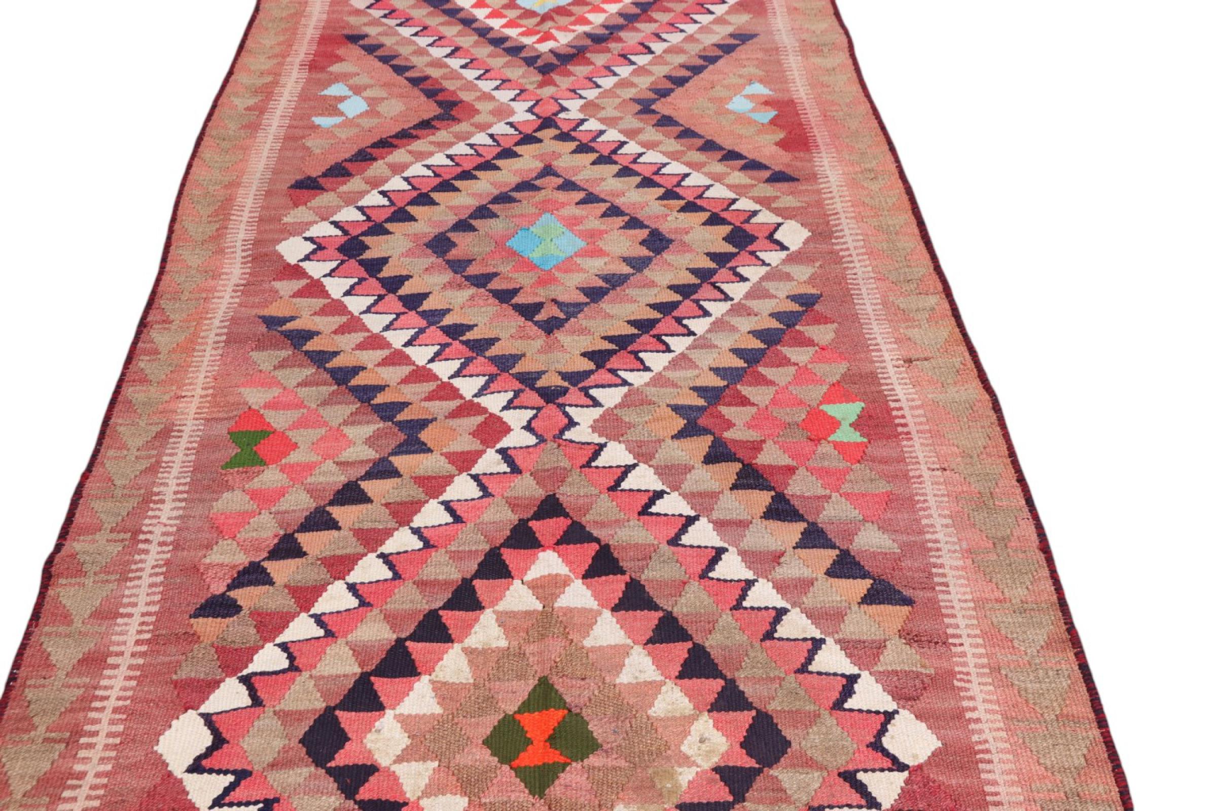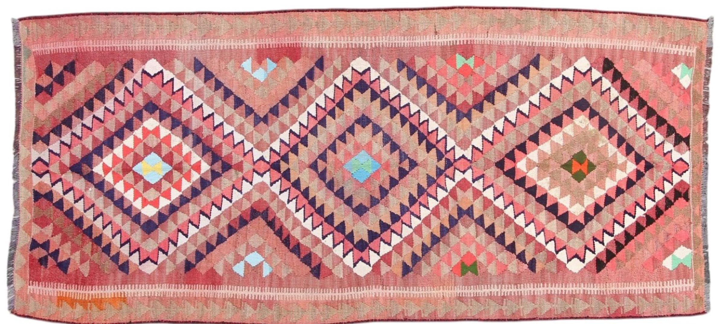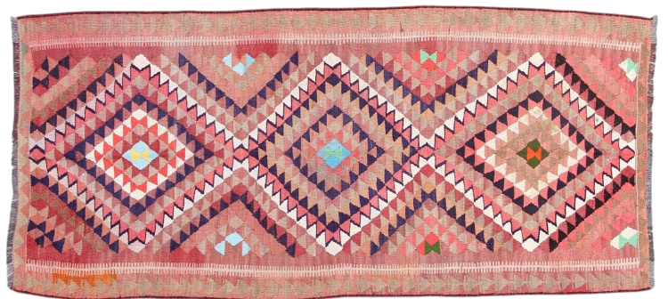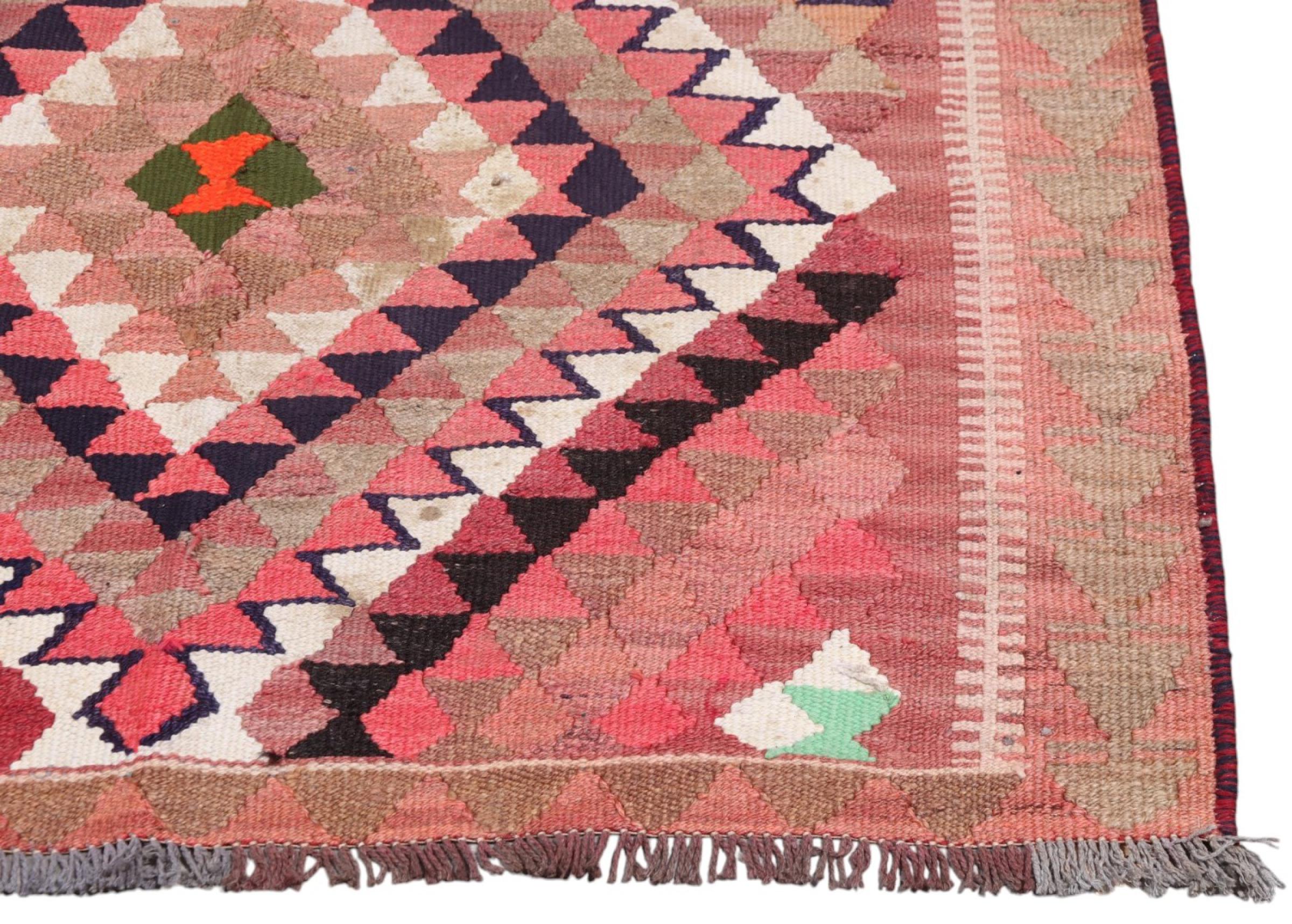 This rug was made as a flat weave by hand on a loom. Flatweave is the term used to describe rugs that have no pile. As the name promises, these rugs are woven and not knotted. This results in a flat rug with a structured surface. Flatweaves are not as soft and usually thinner than knotted rugs. At the same time they are much less complex to manufacture and can usually be laid out from both sides (front and back). Their patterns are usually geometric, which is determined by the fabric.