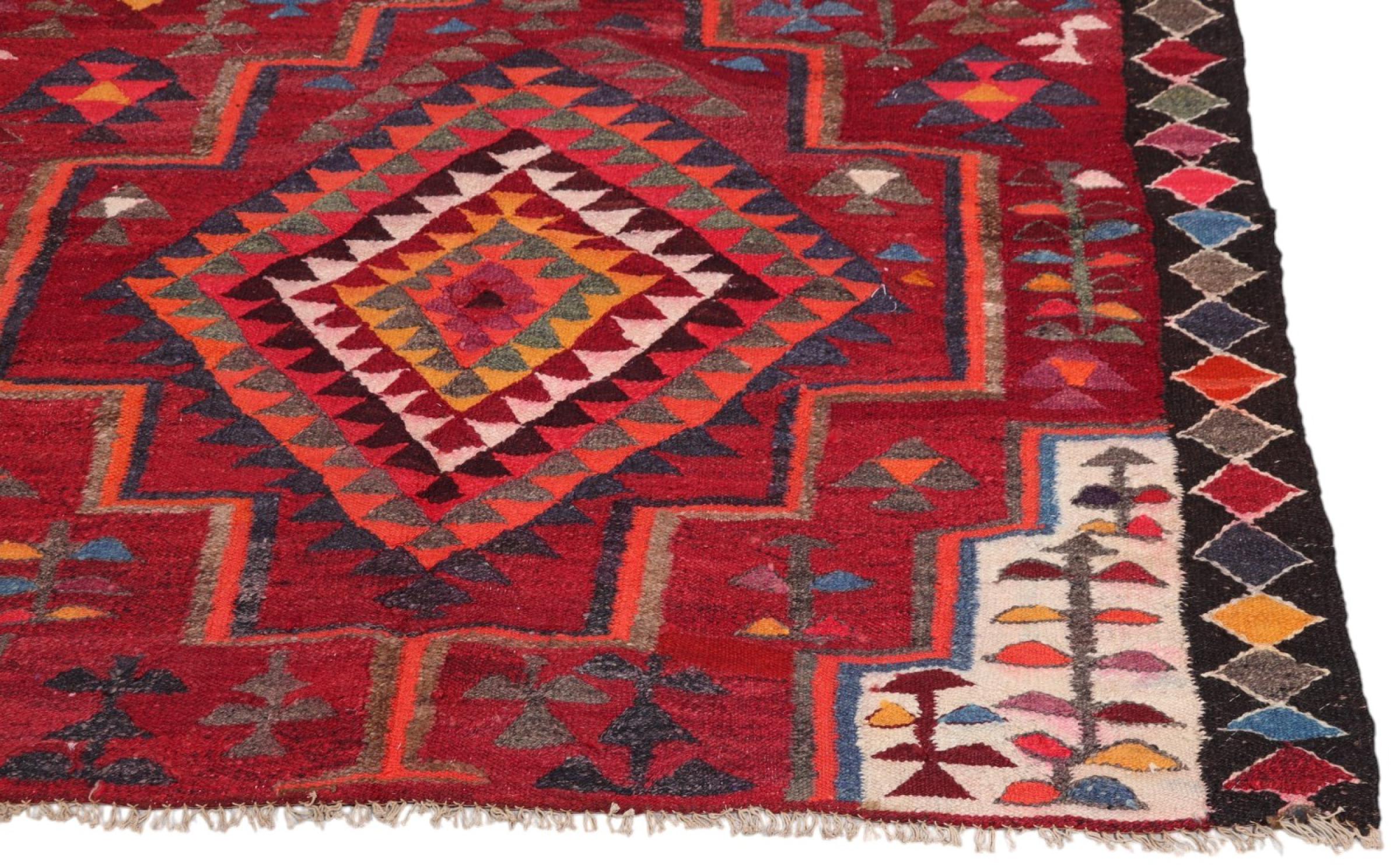 This handwoven Kilim Fars combines Persian patterns with the old tradition of flat fabrics. It represents a beautiful composition of contemporary Persian elements and a modern style. Due to the carpet's geometric patterns and its warm colours, this type of rug is extremely popular in modern interior magazines. Additionally, this Kilim can be used in many different ways. Whether you would like to use it as a bed cover or as a carpet in front of your sofa – a Kilim Fars fulfils nearly all wishes.