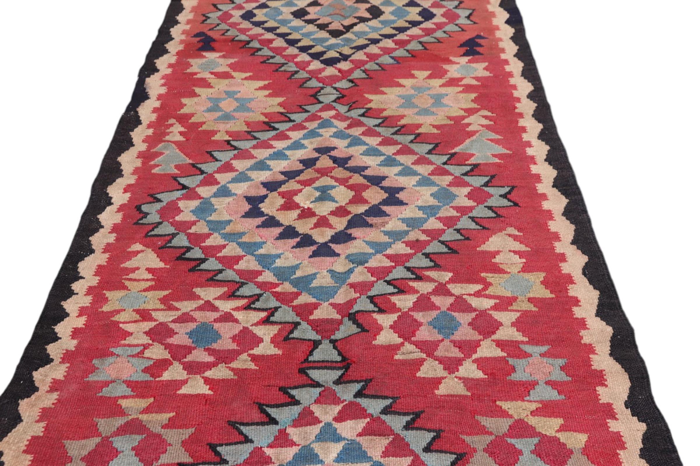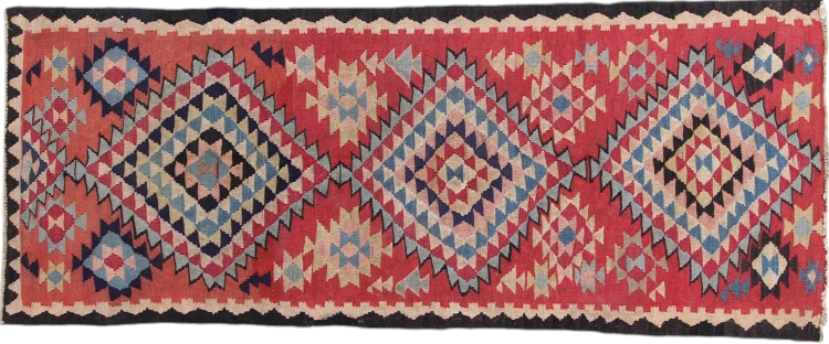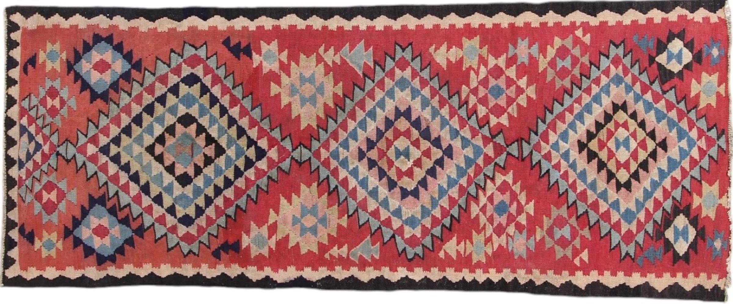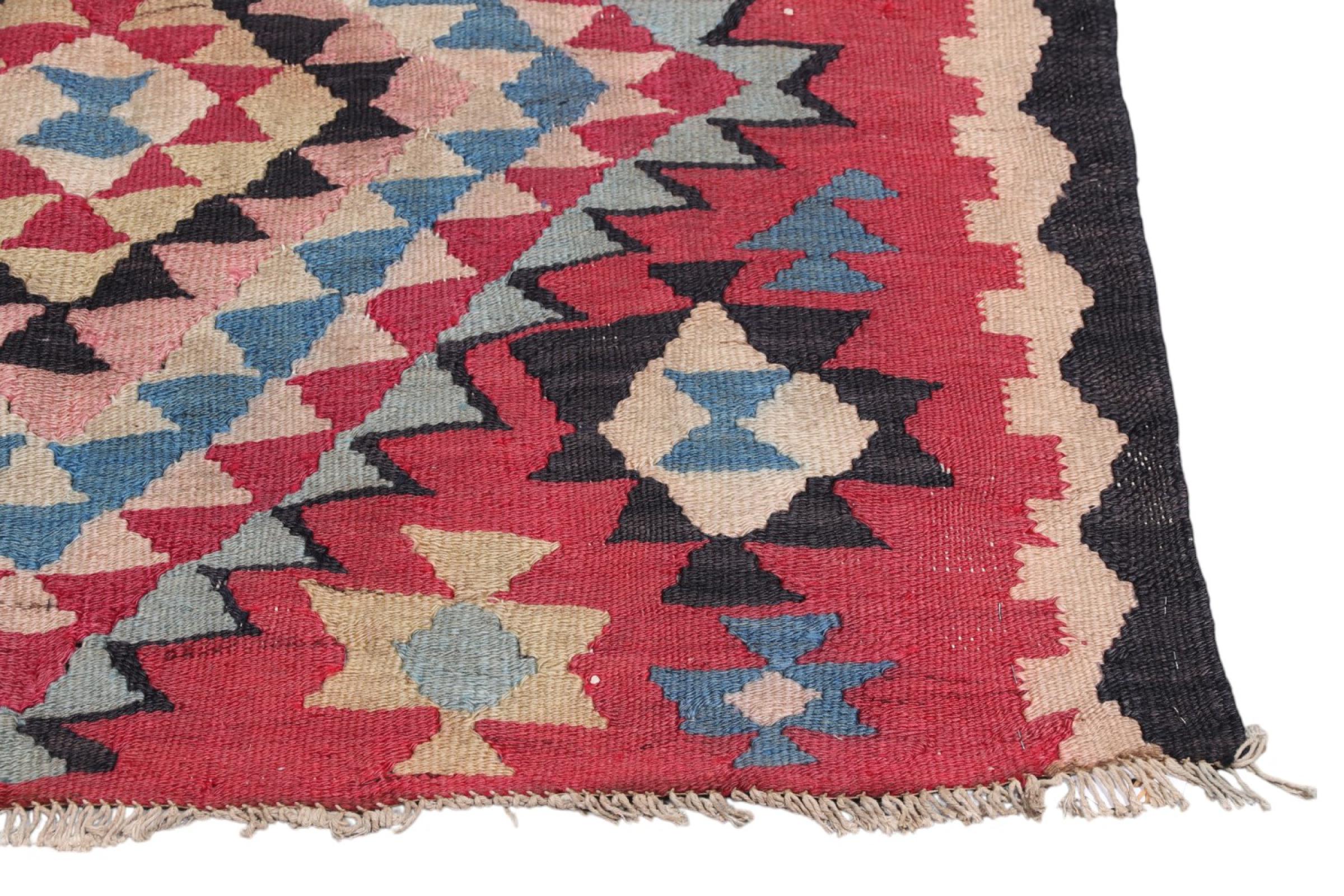 This rug was made as a flat weave by hand on a loom. Flatweave is the term used to describe rugs that have no pile. As the name promises, these rugs are woven and not knotted. This results in a flat rug with a structured surface. Flatweaves are not as soft and usually thinner than knotted rugs. At the same time they are much less complex to manufacture and can usually be laid out from both sides (front and back). Their patterns are usually geometric, which is determined by the fabric.