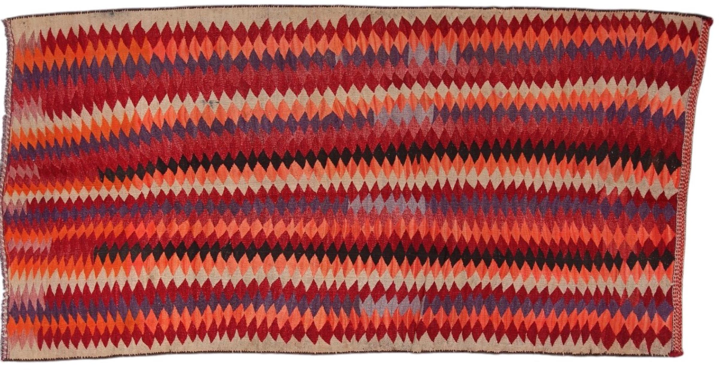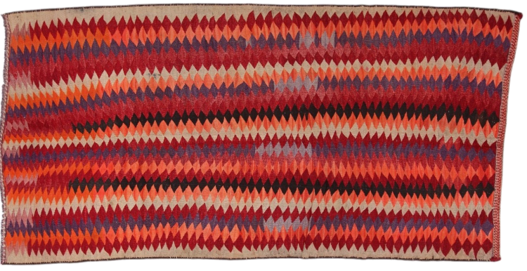 This rug was made as a flat weave by hand on a loom. Flatweave is the term used to describe rugs that have no pile. As the name promises, these rugs are woven and not knotted. This results in a flat rug with a structured surface. Flatweaves are not as soft and usually thinner than knotted rugs. At the same time they are much less complex to manufacture and can usually be laid out from both sides (front and back). Their patterns are usually geometric, which is determined by the fabric.