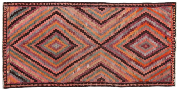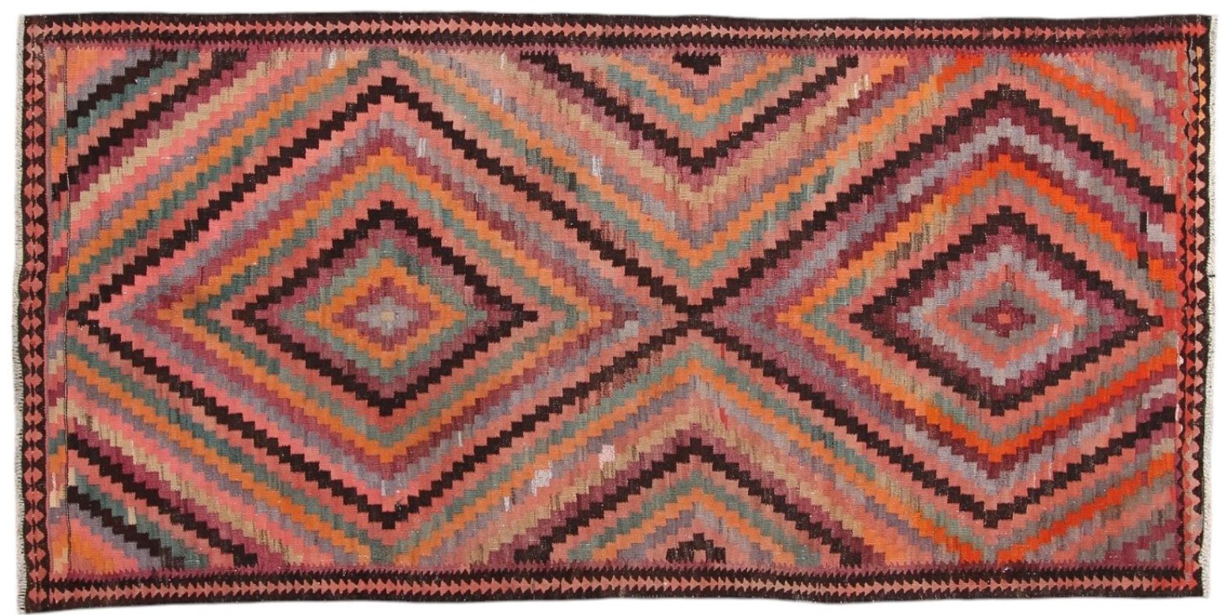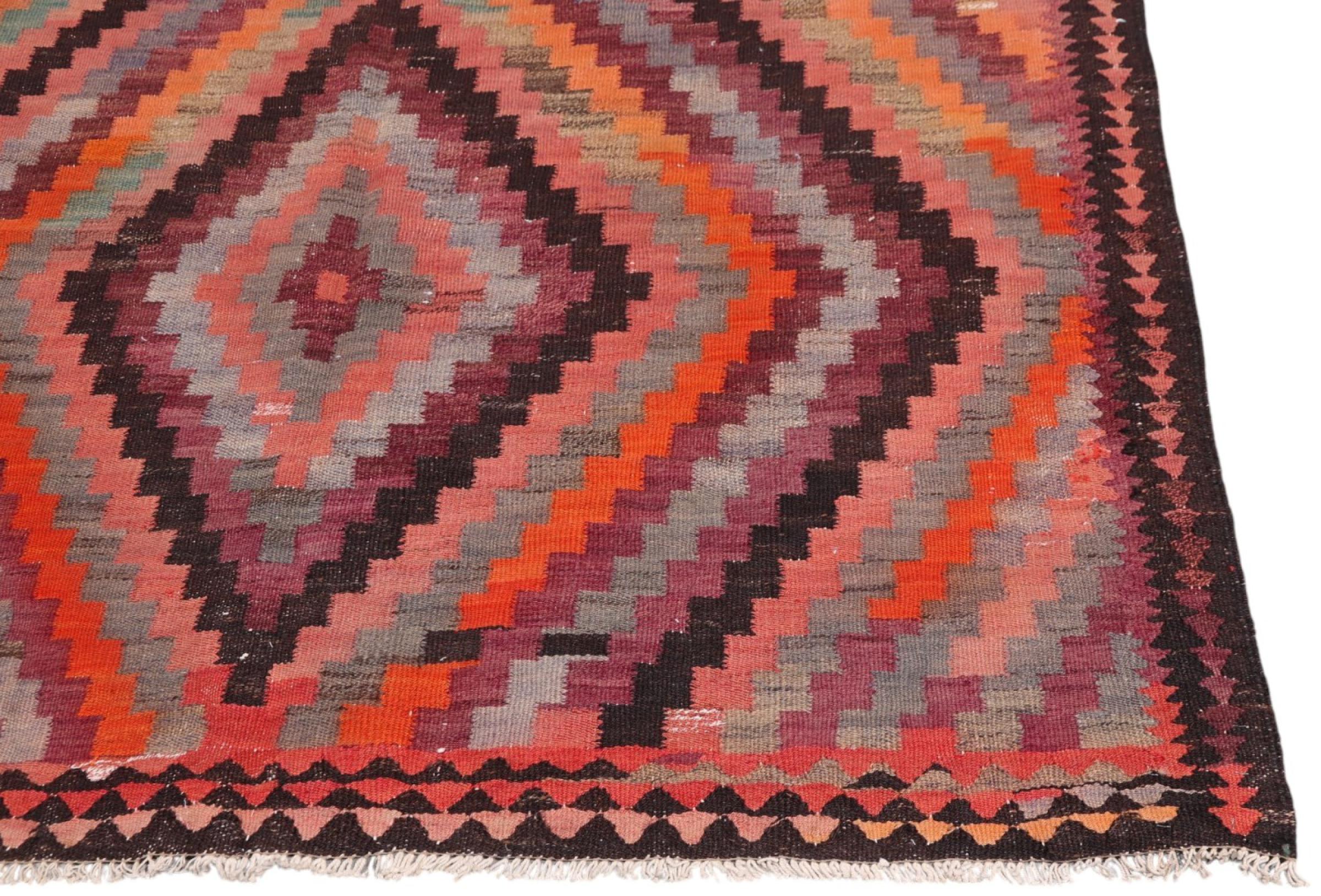 This rug was made as a flat weave by hand on a loom. Flatweave is the term used to describe rugs that have no pile. As the name promises, these rugs are woven and not knotted. This results in a flat rug with a structured surface. Flatweaves are not as soft and usually thinner than knotted rugs. At the same time they are much less complex to manufacture and can usually be laid out from both sides (front and back). Their patterns are usually geometric, which is determined by the fabric.