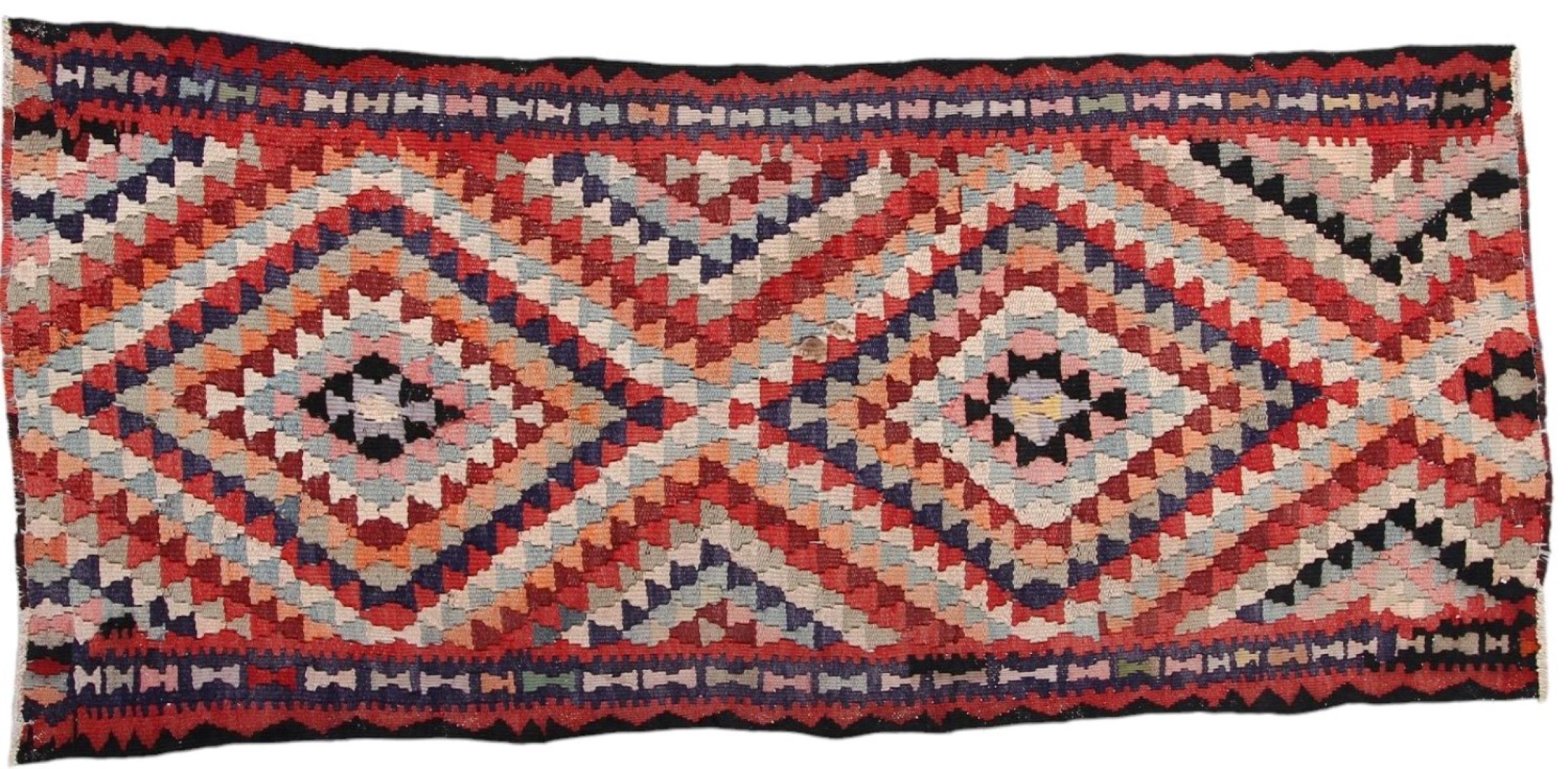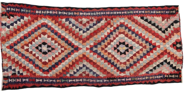 This rug was made as a flat weave by hand on a loom. Flatweave is the term used to describe rugs that have no pile. As the name promises, these rugs are woven and not knotted. This results in a flat rug with a structured surface. Flatweaves are not as soft and usually thinner than knotted rugs. At the same time they are much less complex to manufacture and can usually be laid out from both sides (front and back). Their patterns are usually geometric, which is determined by the fabric.
