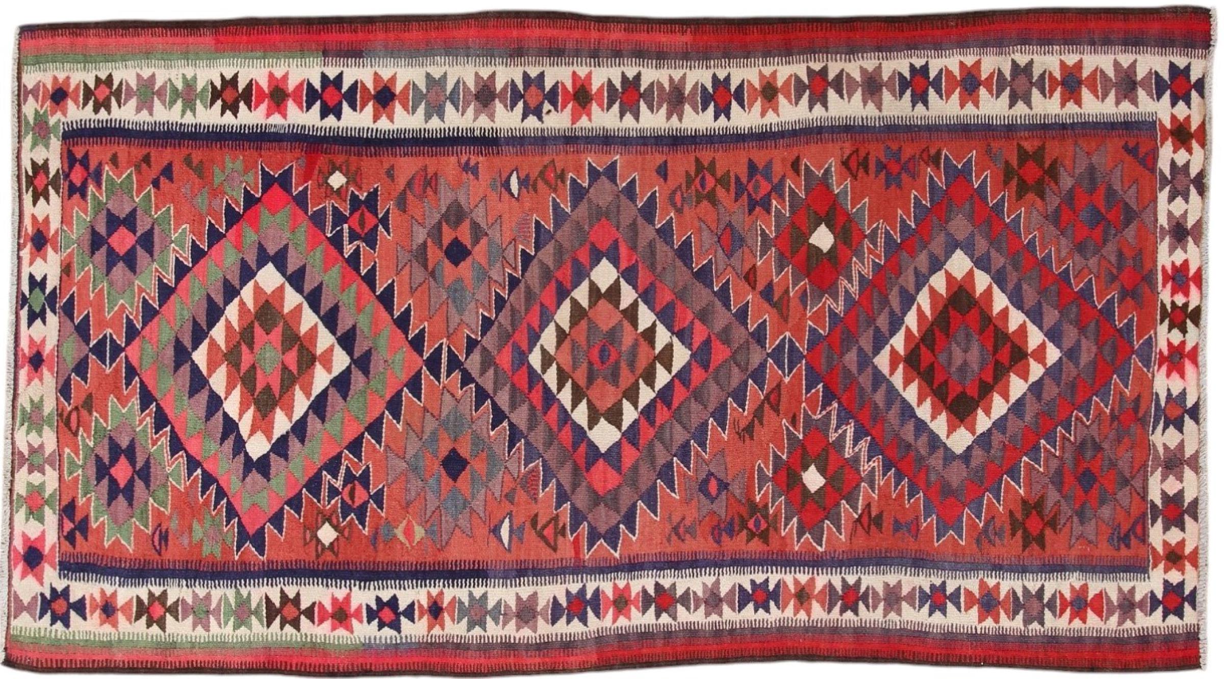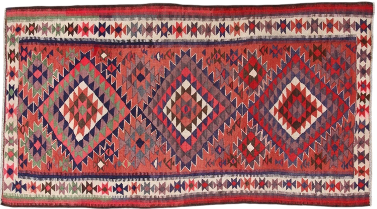 This rug was made as a flat weave by hand on a loom. Flatweave is the term used to describe rugs that have no pile. As the name promises, these rugs are woven and not knotted. This results in a flat rug with a structured surface. Flatweaves are not as soft and usually thinner than knotted rugs. At the same time they are much less complex to manufacture and can usually be laid out from both sides (front and back). Their patterns are usually geometric, which is determined by the fabric.