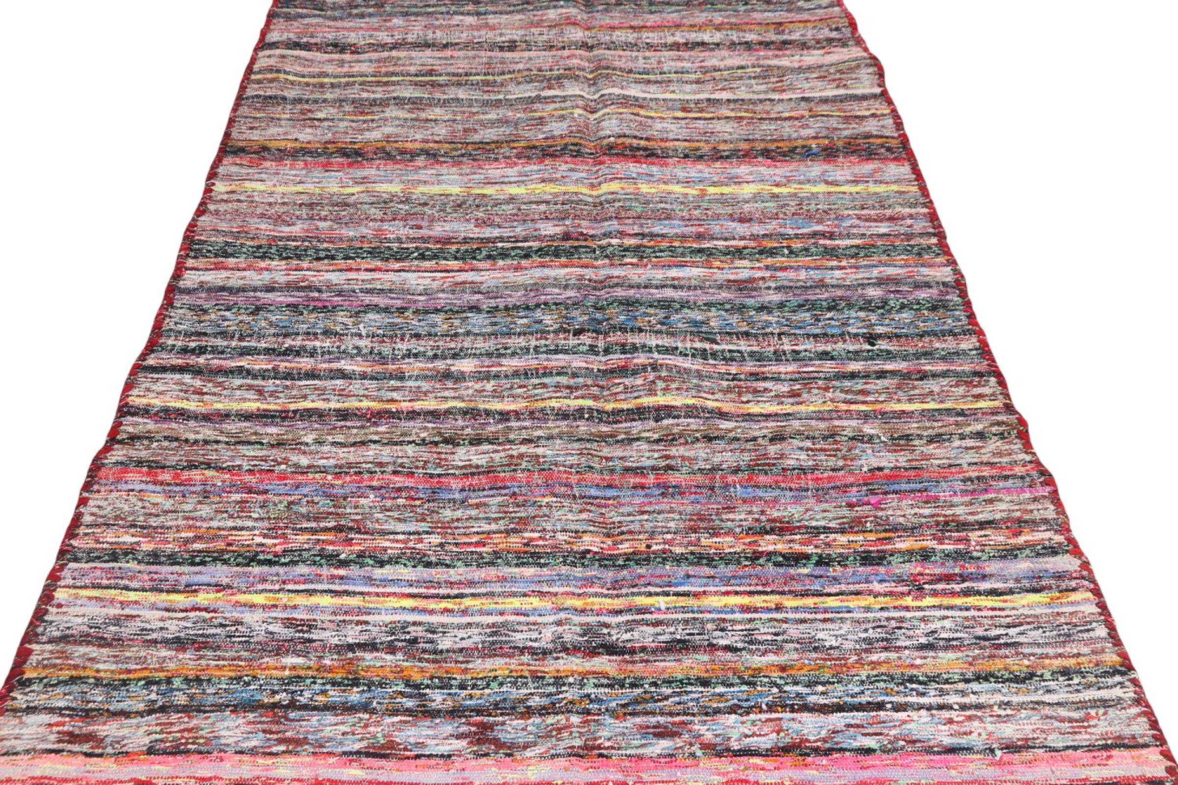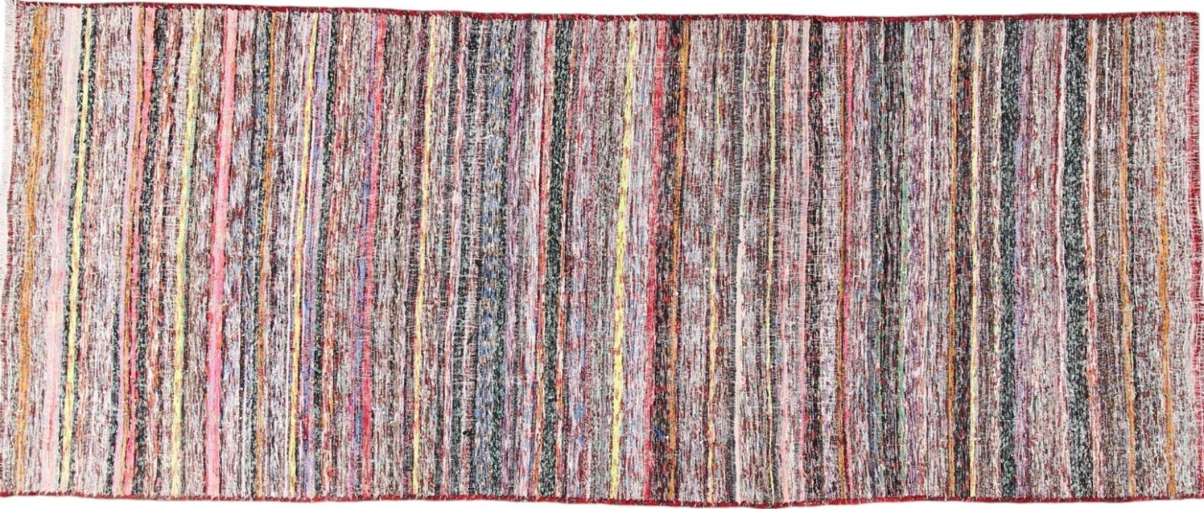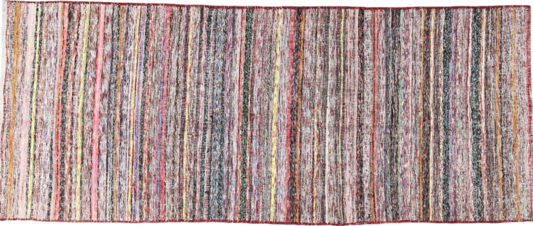 This rug was made as a flat weave by hand on a loom. Flatweave is the term used to describe rugs that have no pile. As the name promises, these rugs are woven and not knotted. This results in a flat rug with a structured surface. Flatweaves are not as soft and usually thinner than knotted rugs. At the same time they are much less complex to manufacture and can usually be laid out from both sides (front and back). Their patterns are usually geometric, which is determined by the fabric.