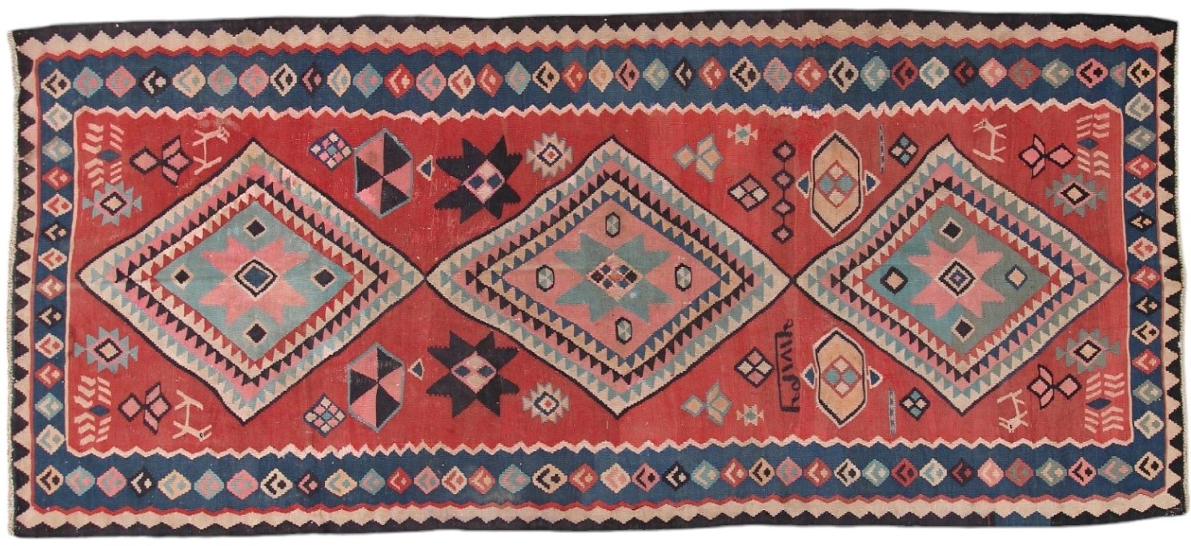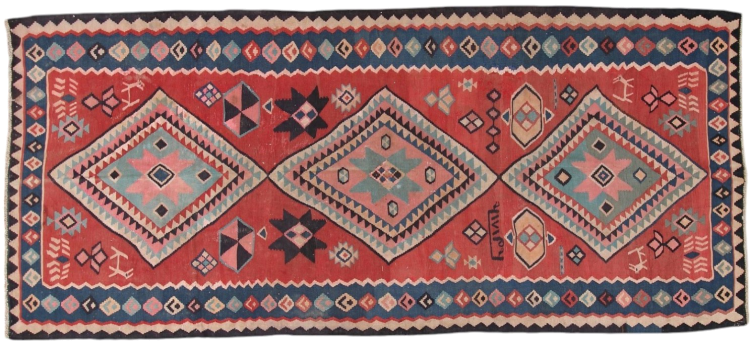 This rug was made as a flat weave by hand on a loom. Flatweave is the term used to describe rugs that have no pile. As the name promises, these rugs are woven and not knotted. This results in a flat rug with a structured surface. Flatweaves are not as soft and usually thinner than knotted rugs. At the same time they are much less complex to manufacture and can usually be laid out from both sides (front and back). Their patterns are usually geometric, which is determined by the fabric.