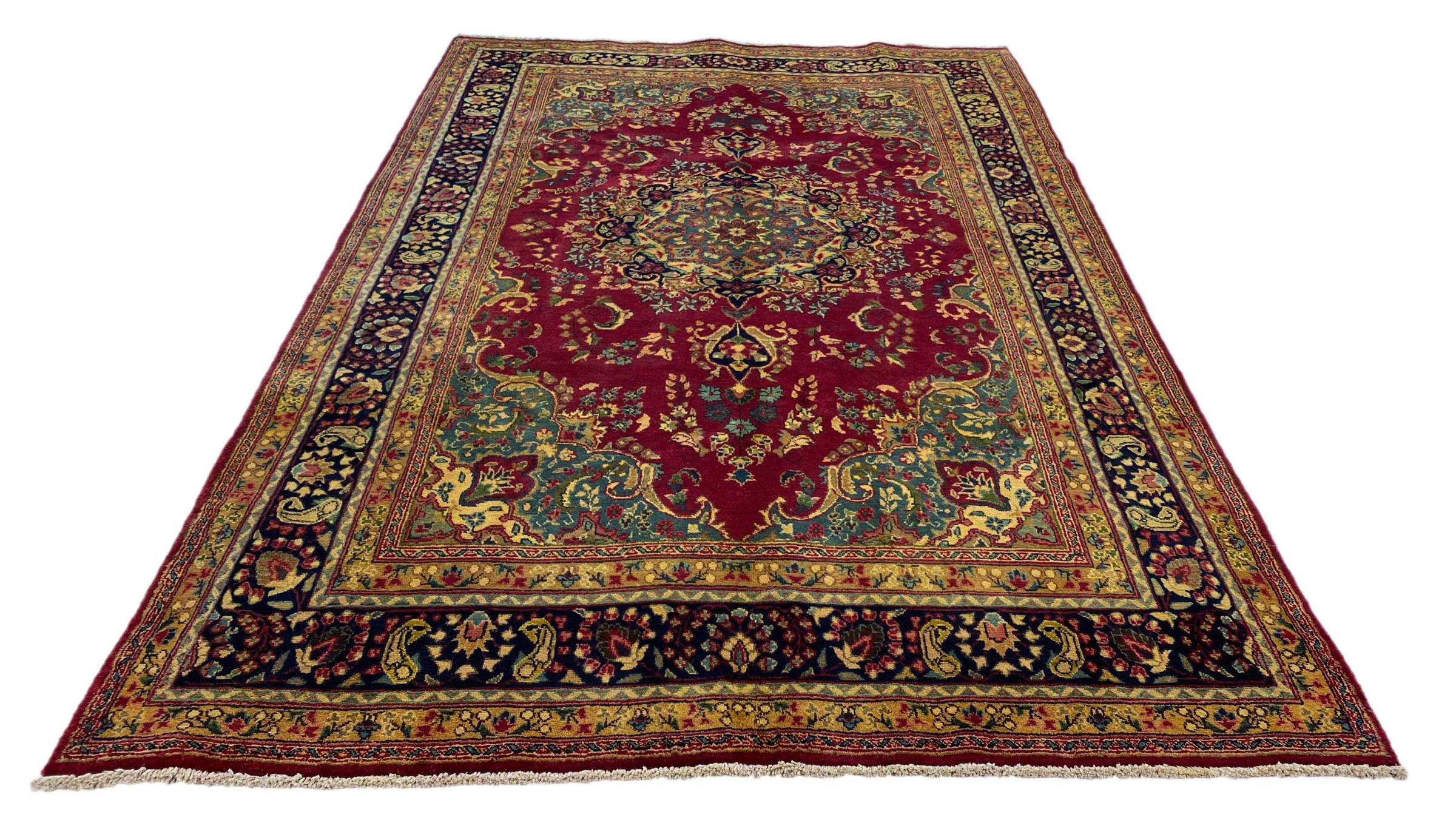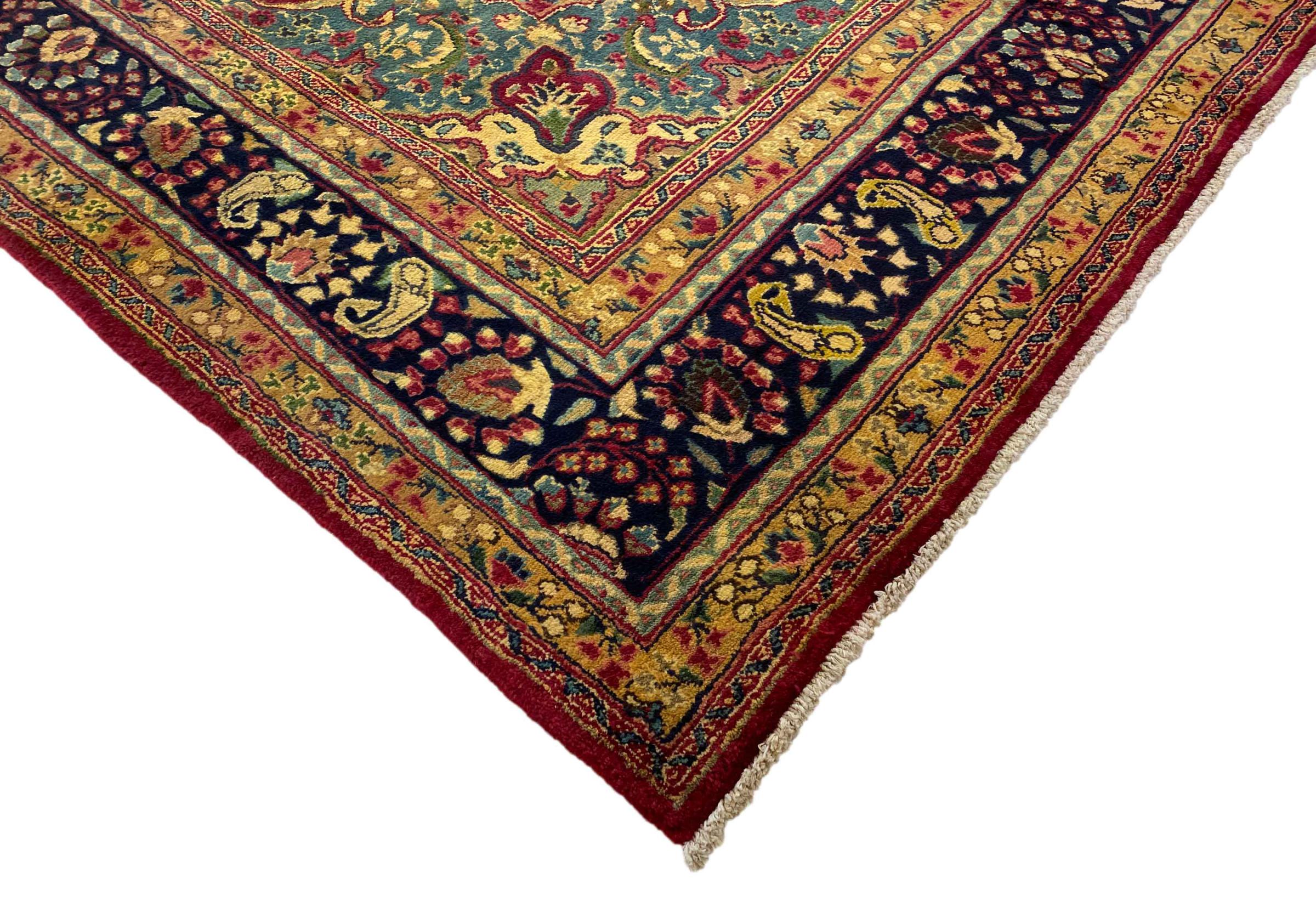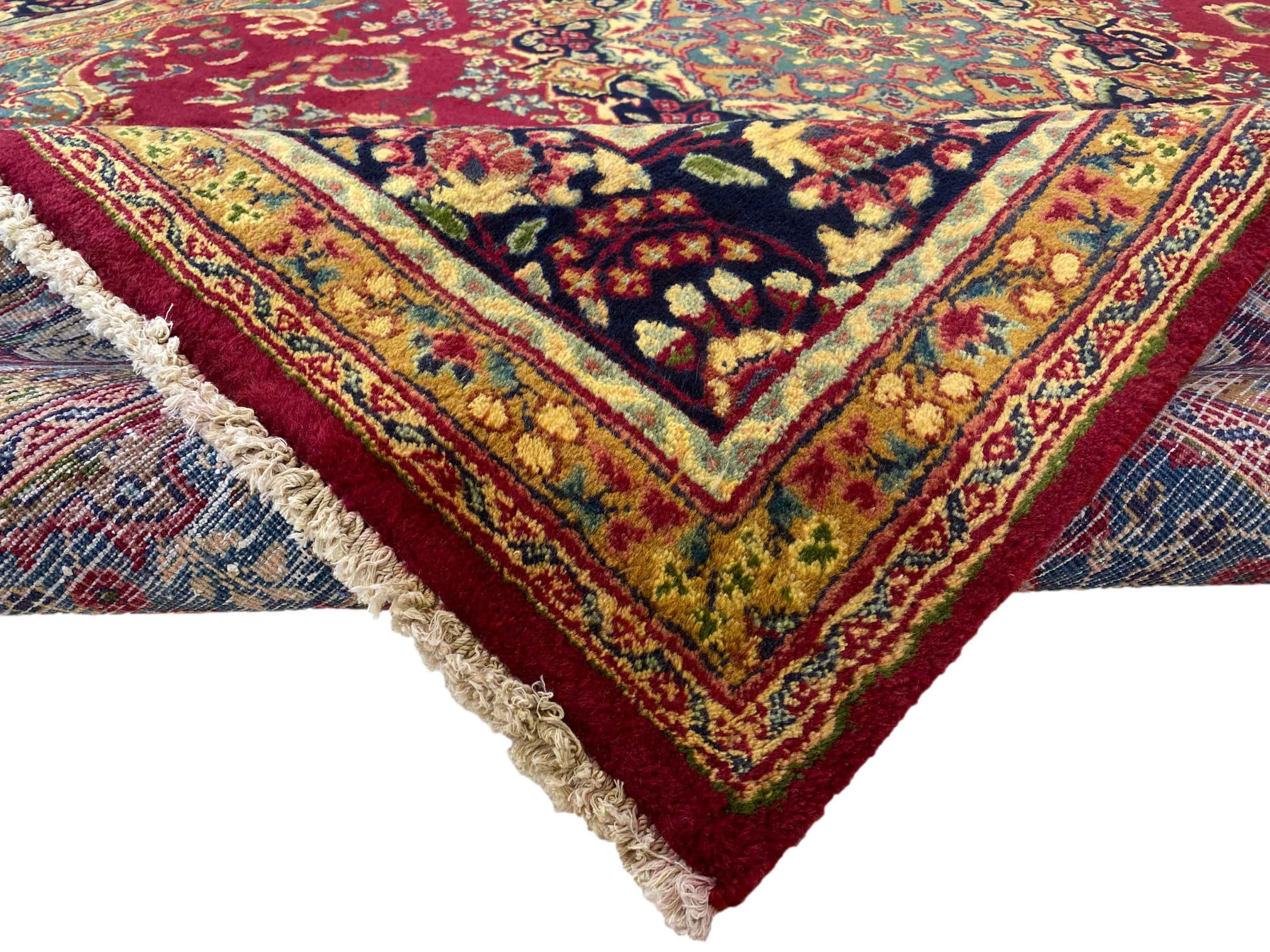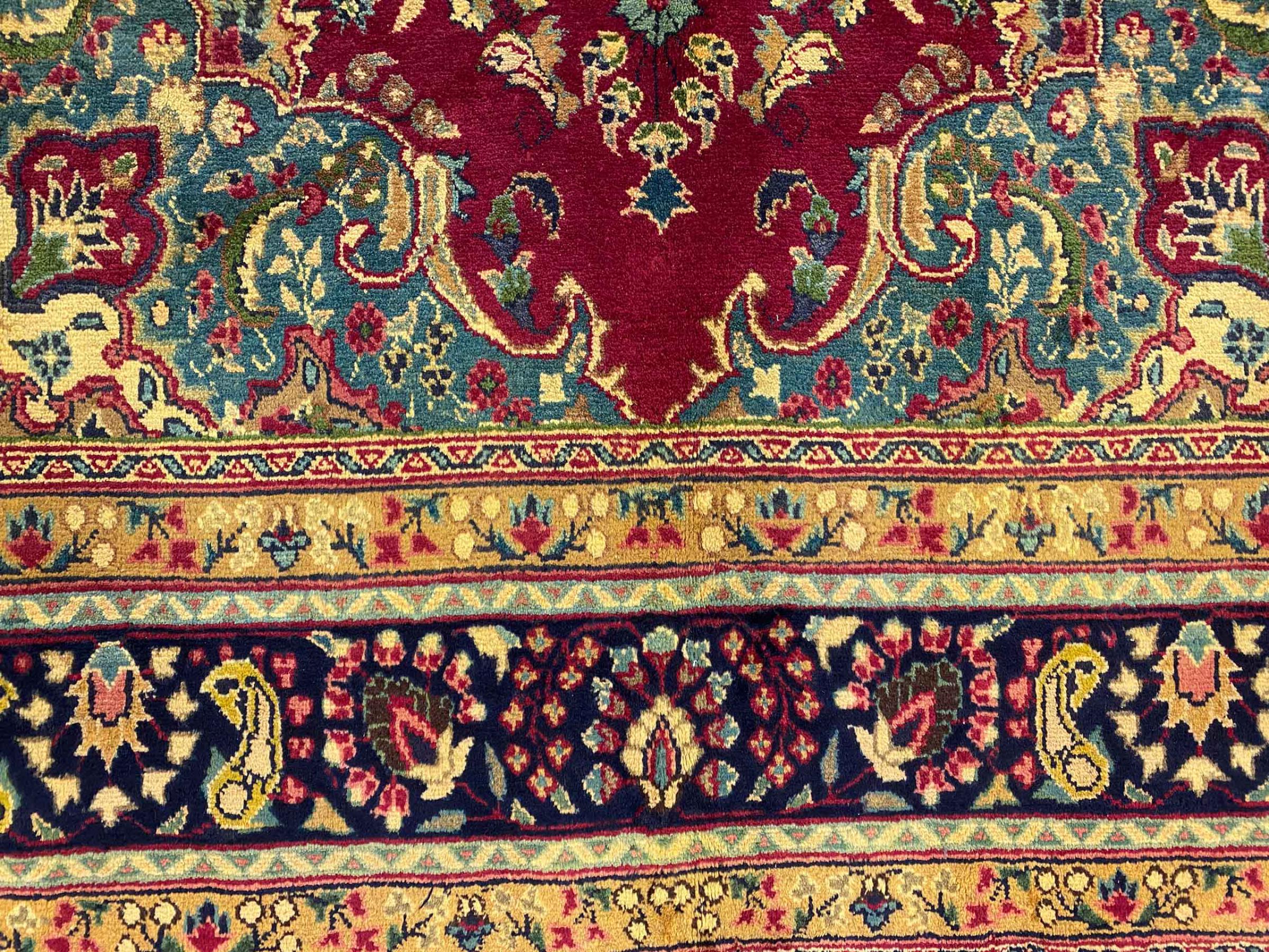 This carpet originates from Mashhad, one of the biggest cities of Iran and Persia. Mashhad carpets are known to be robust and enduring. Mostly they come in extraordinary large scales. A large genuine Persian carpet like this one requires a lot of skill and experience. Generally, it takes several months to craft such a carpet by hand in traditional handicraft.
