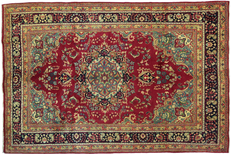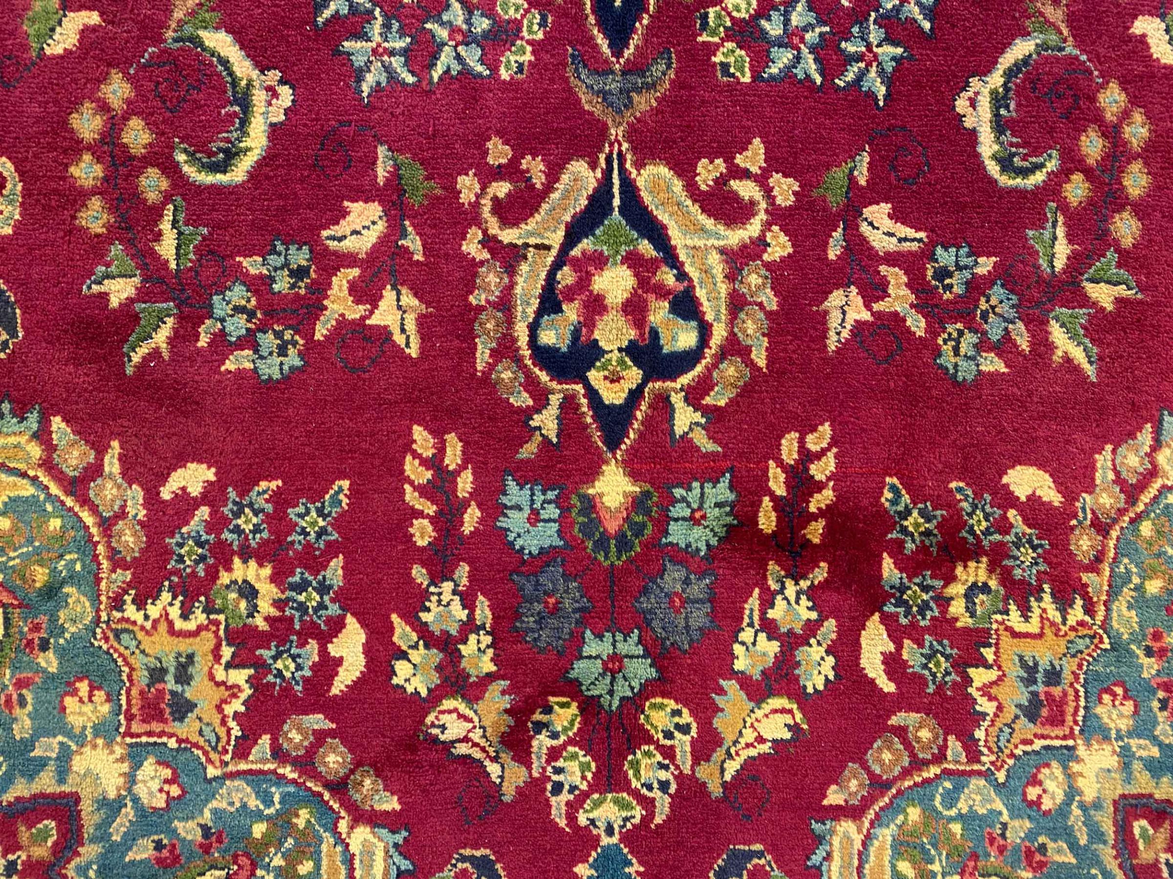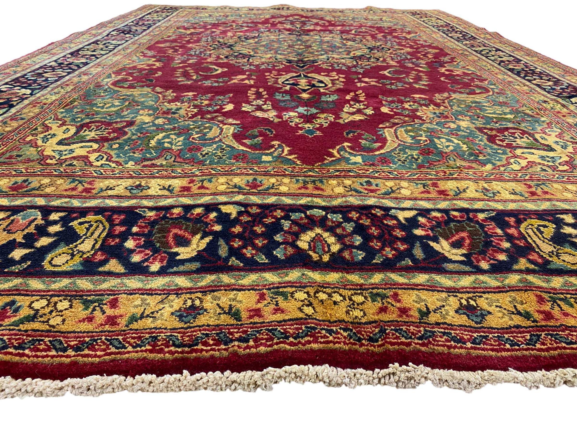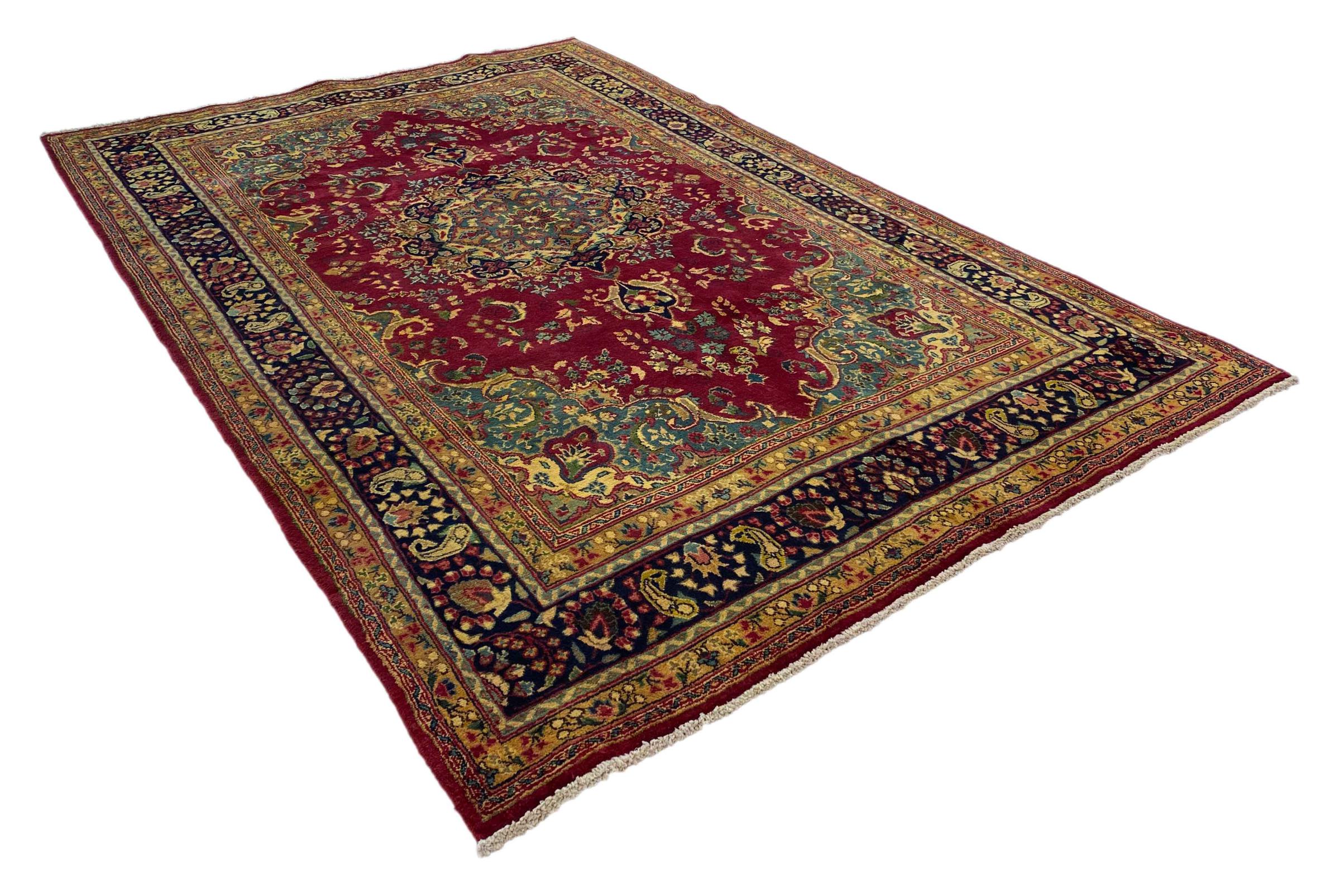 This carpet originates from Mashhad, one of the biggest cities of Iran and Persia. Mashhad carpets are known to be robust and enduring. Mostly they come in extraordinary large scales. A large genuine Persian carpet like this one requires a lot of skill and experience. Generally, it takes several months to craft such a carpet by hand in traditional handicraft.